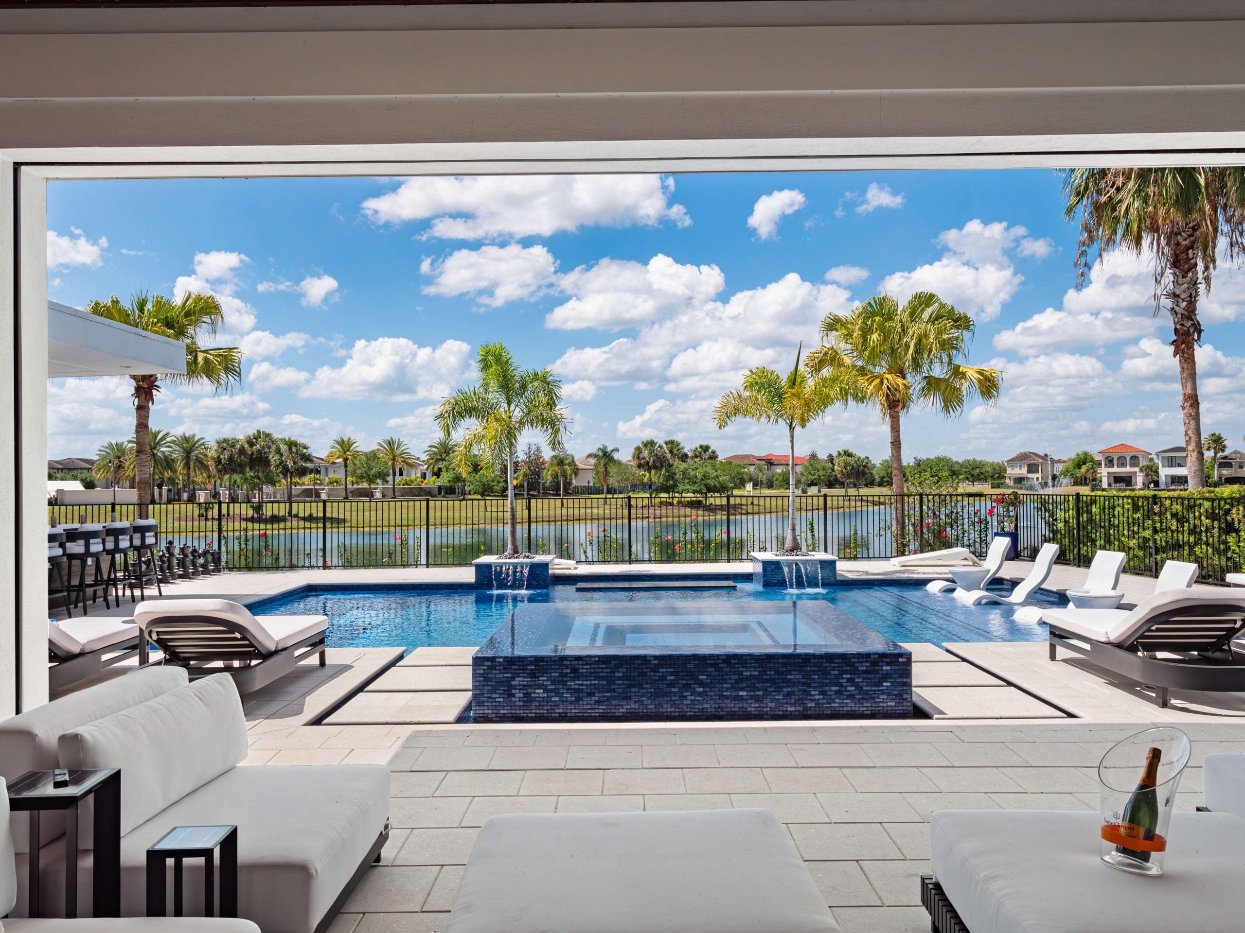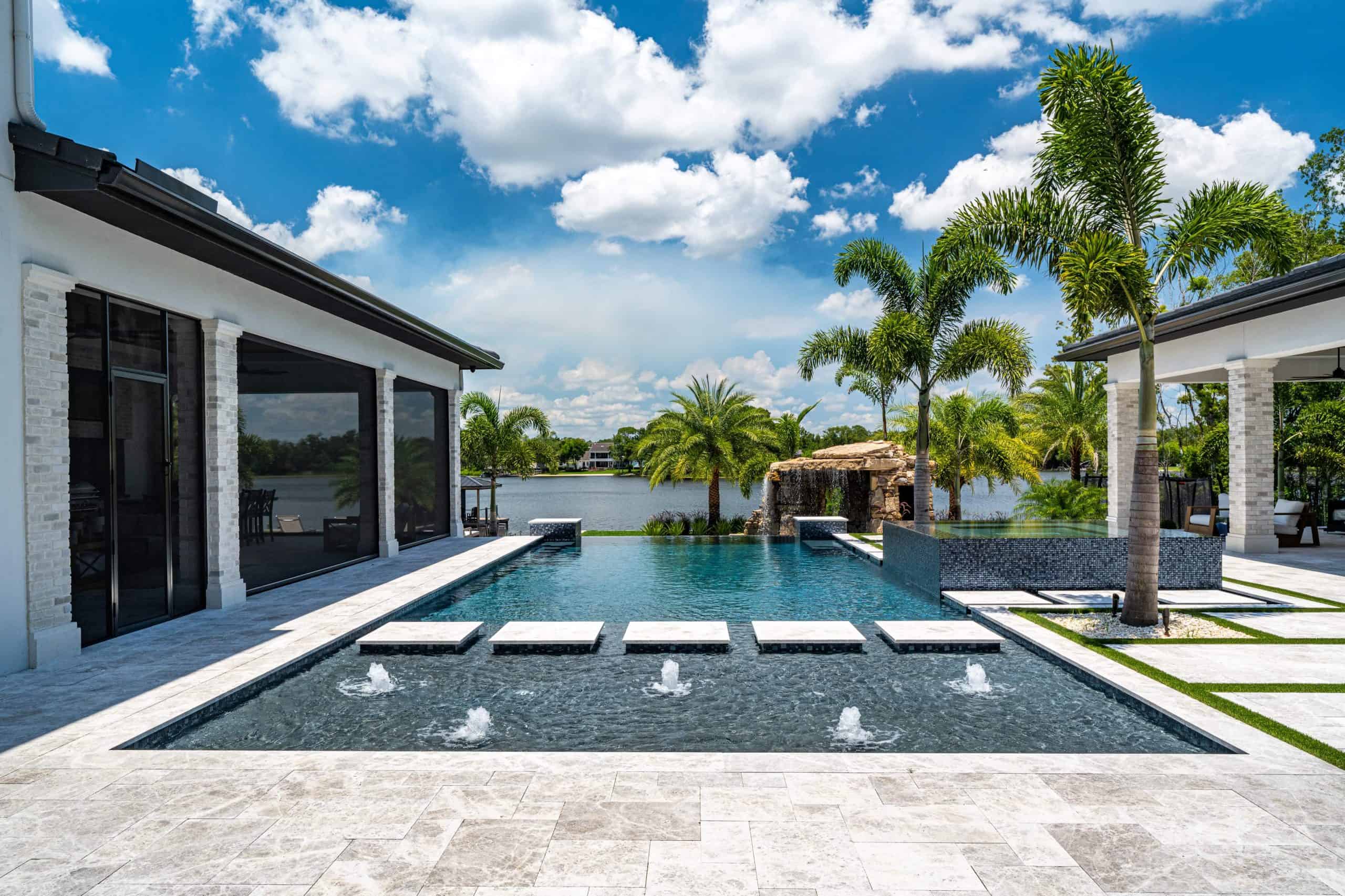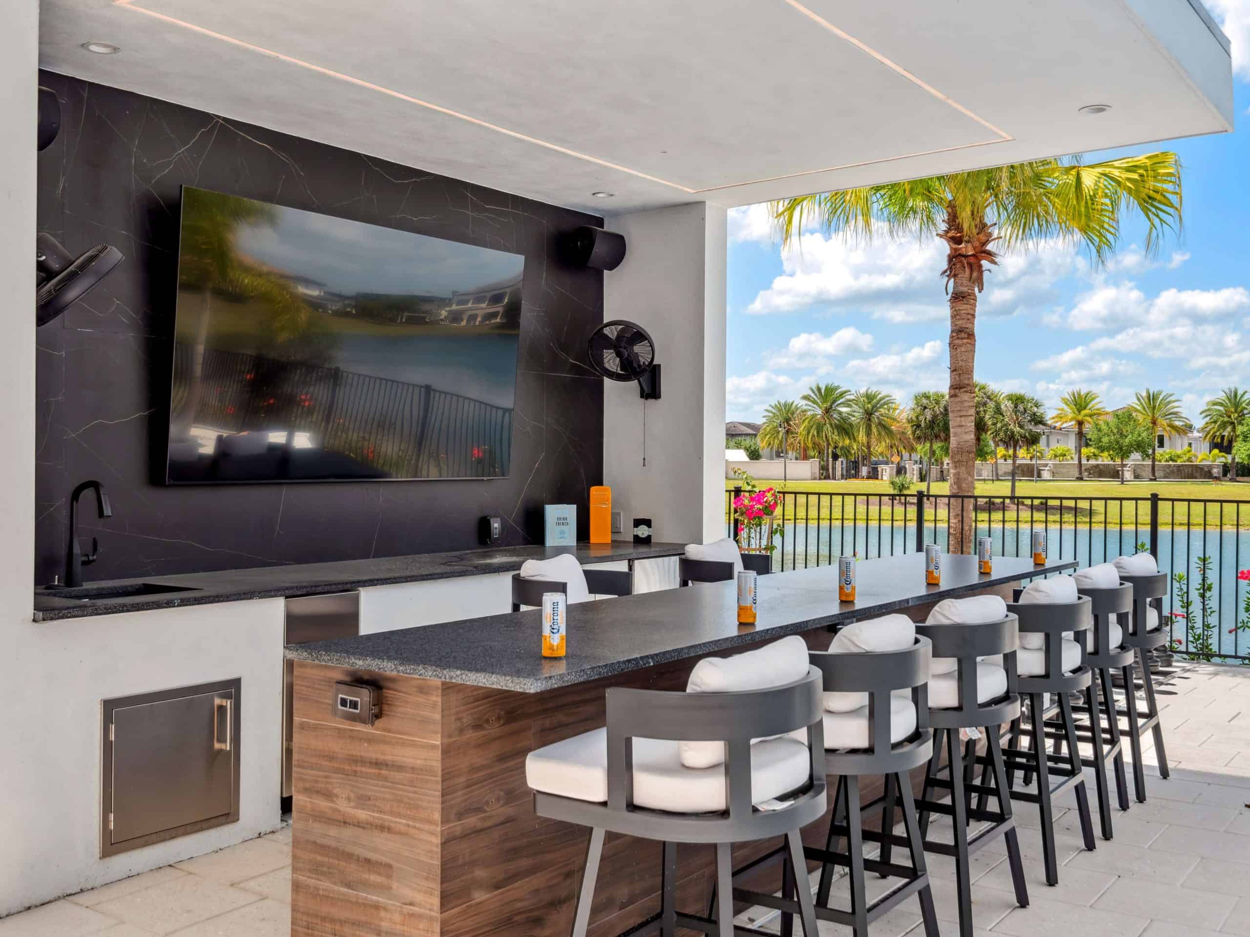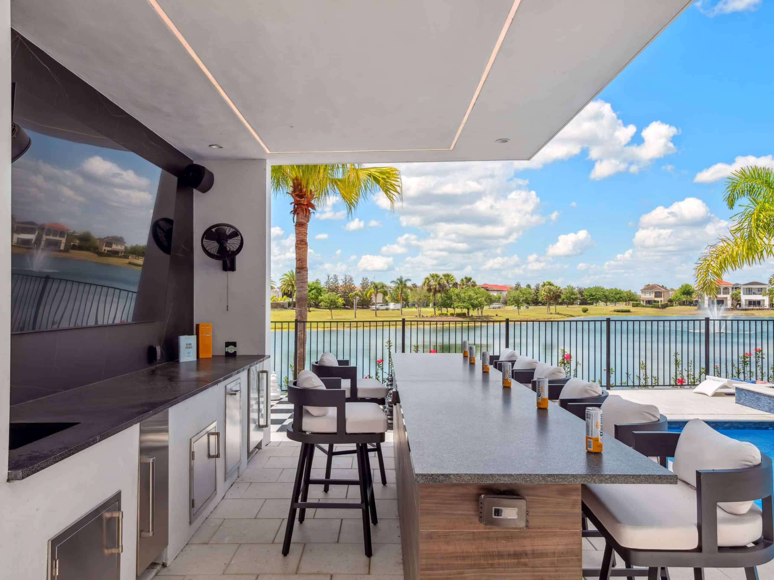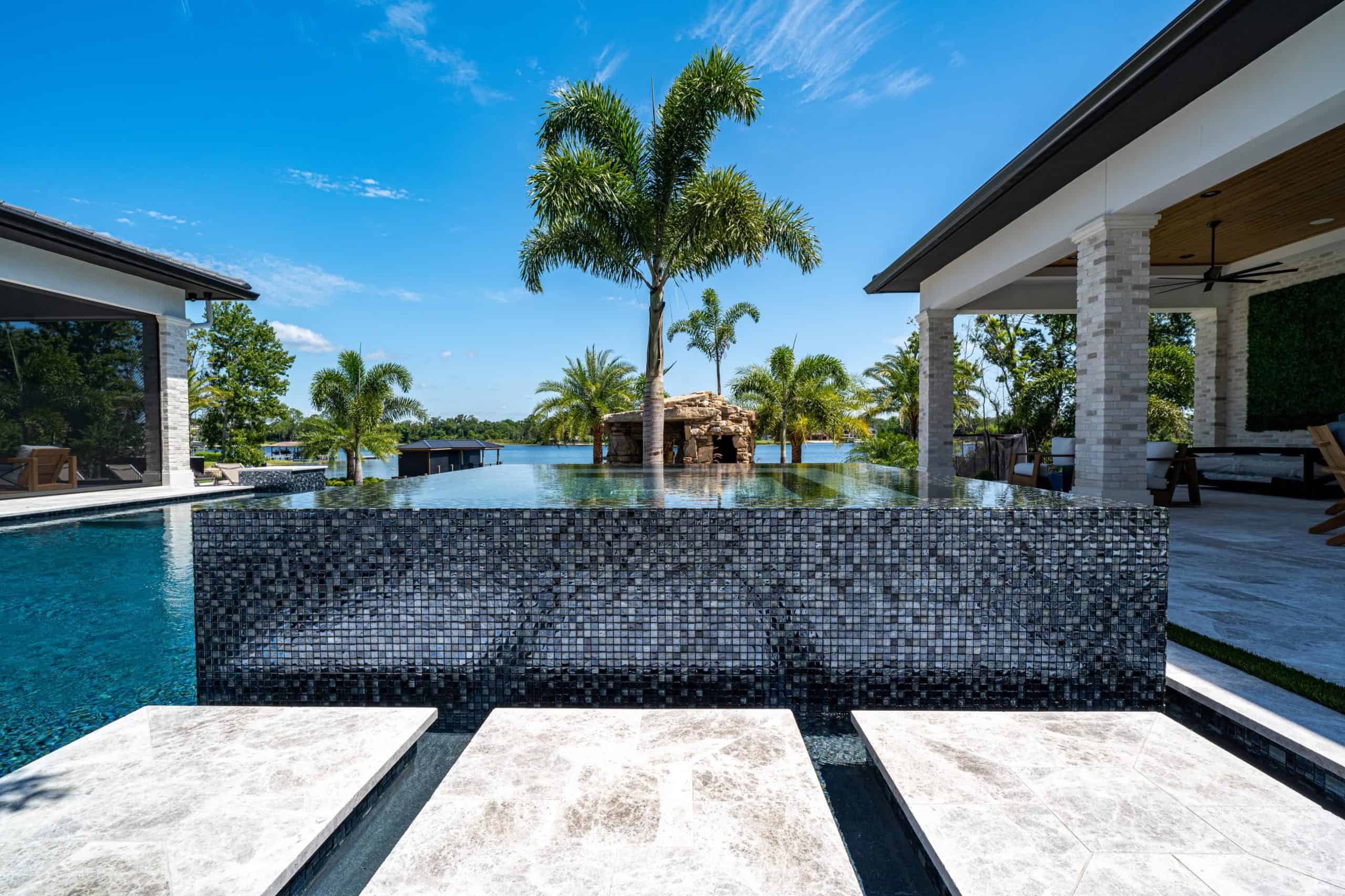 Luxury pool in Florida featuring sun shelf loungers, raised spa, and a lakefront backdrop with a full outdoor kitchen and TV wall.