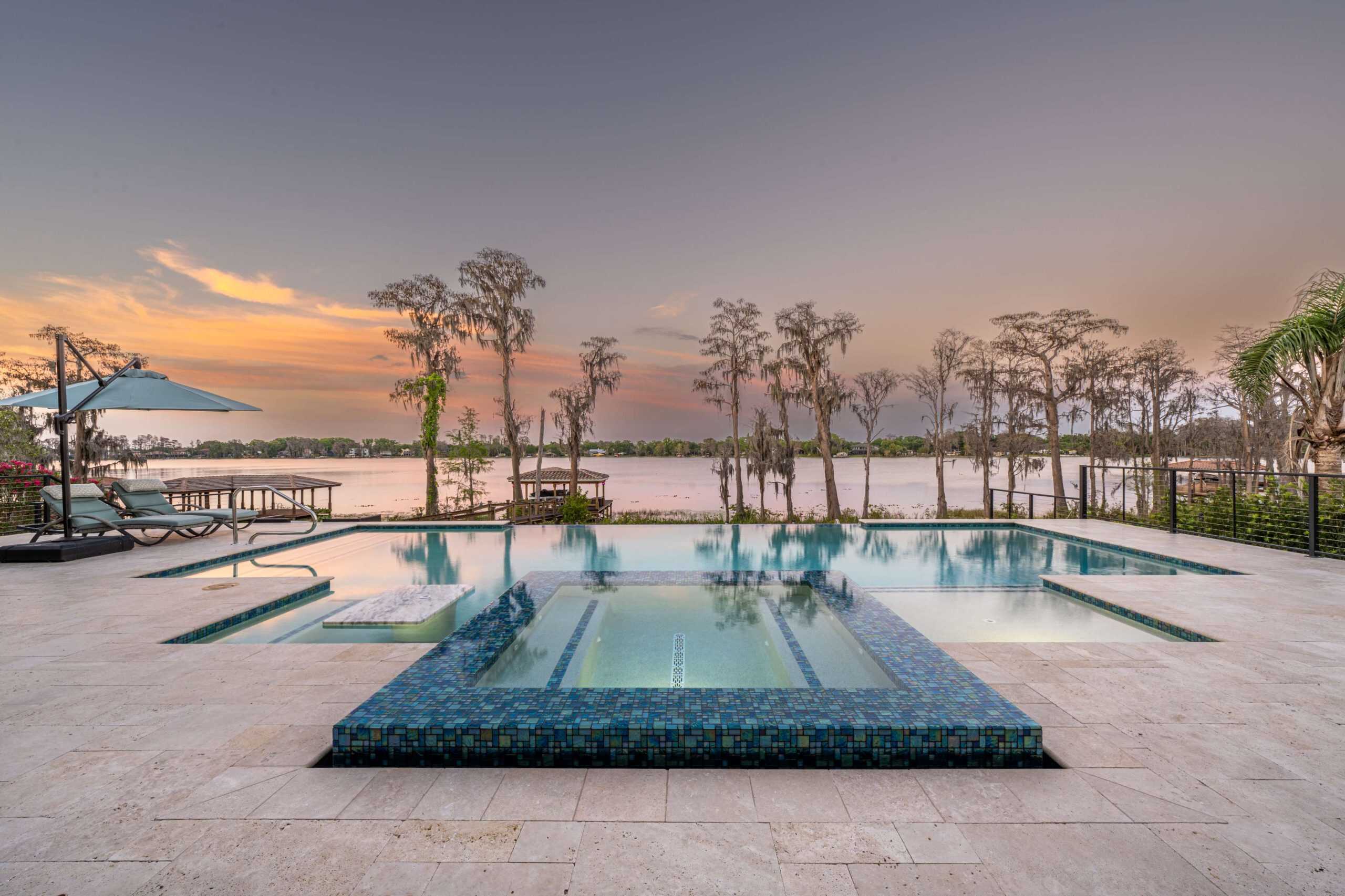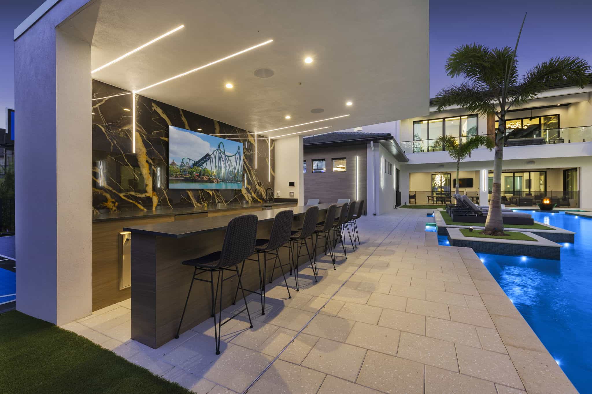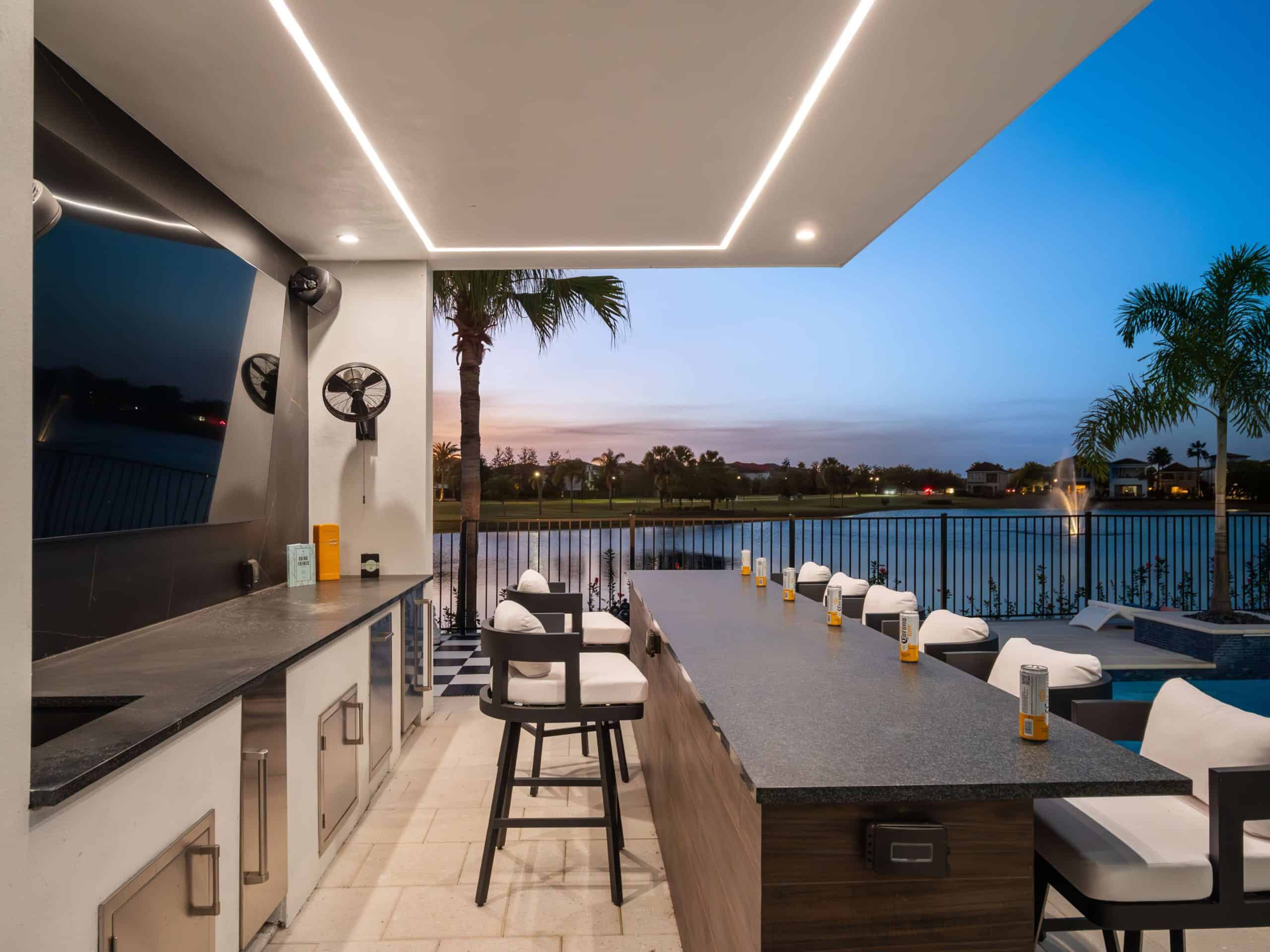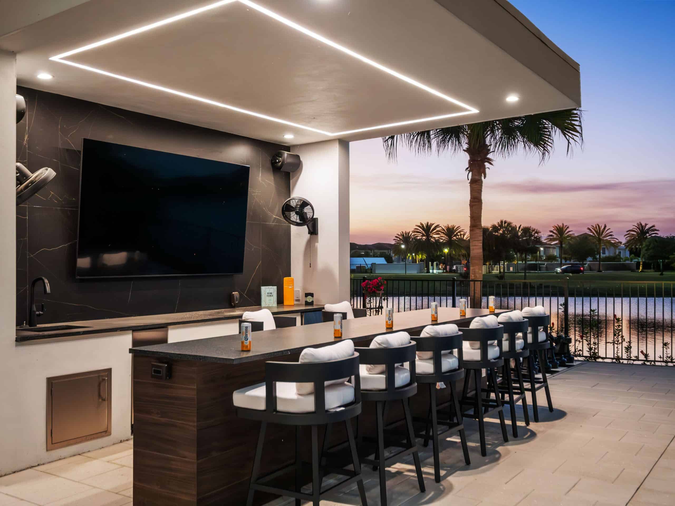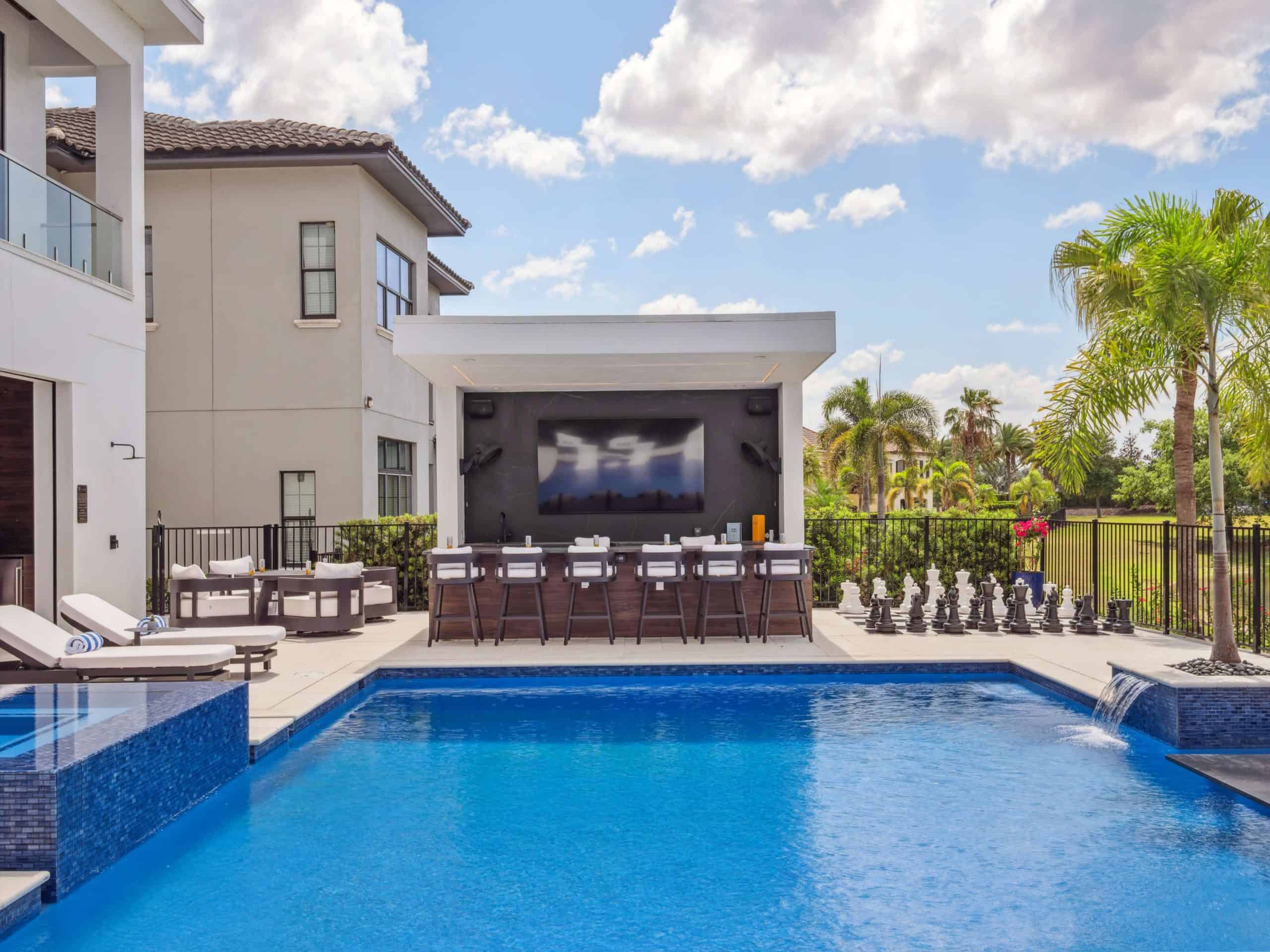 Luxury pool in Florida featuring sun shelf loungers, raised spa, and a lakefront backdrop with a full outdoor kitchen and TV wall.