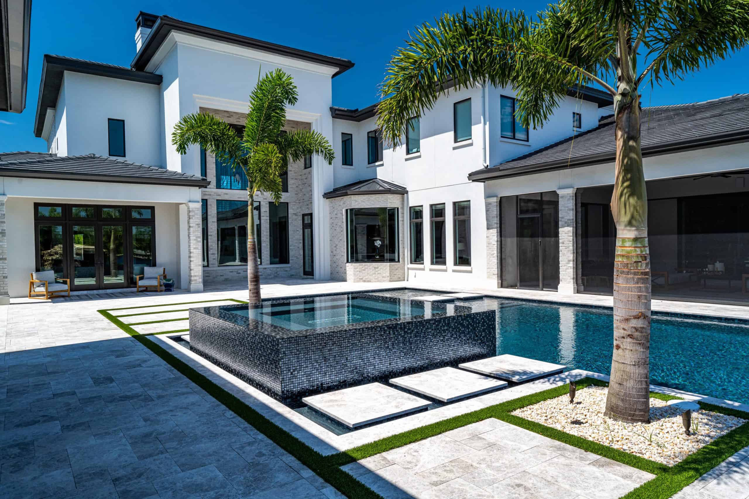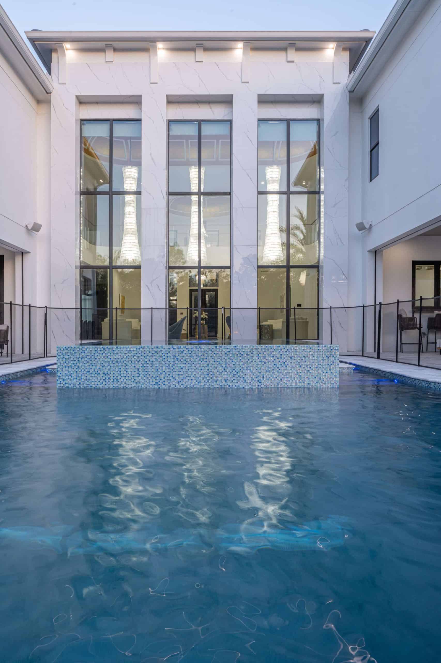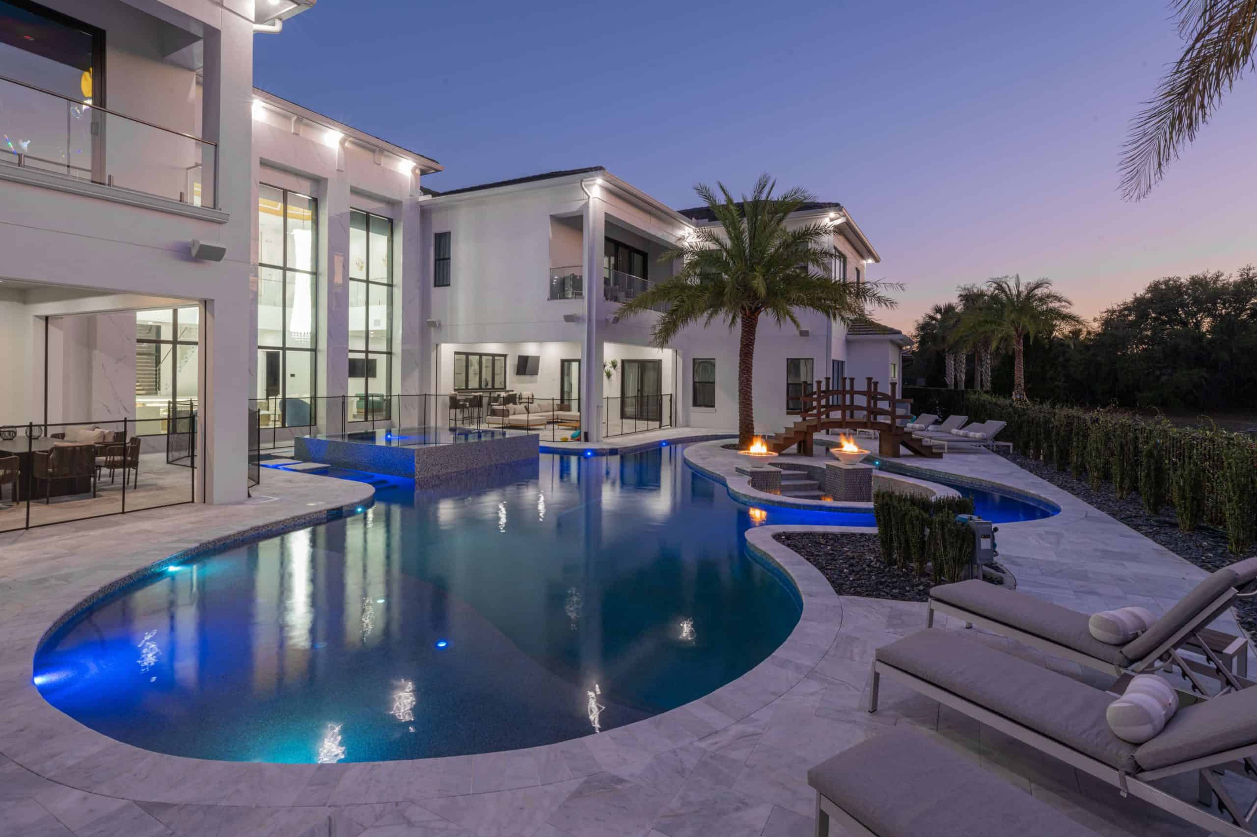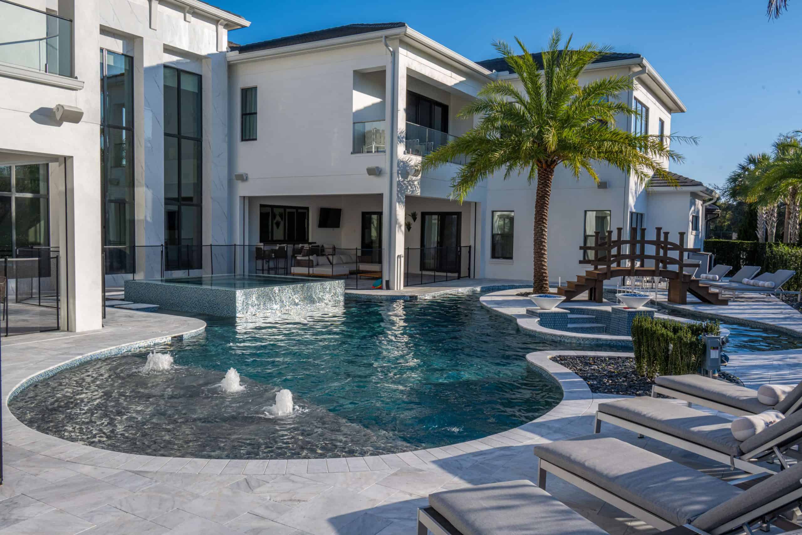 Florida luxury pool with island spa, sun shelf, custom bridge, and integrated lighting for a high-end resort feel.