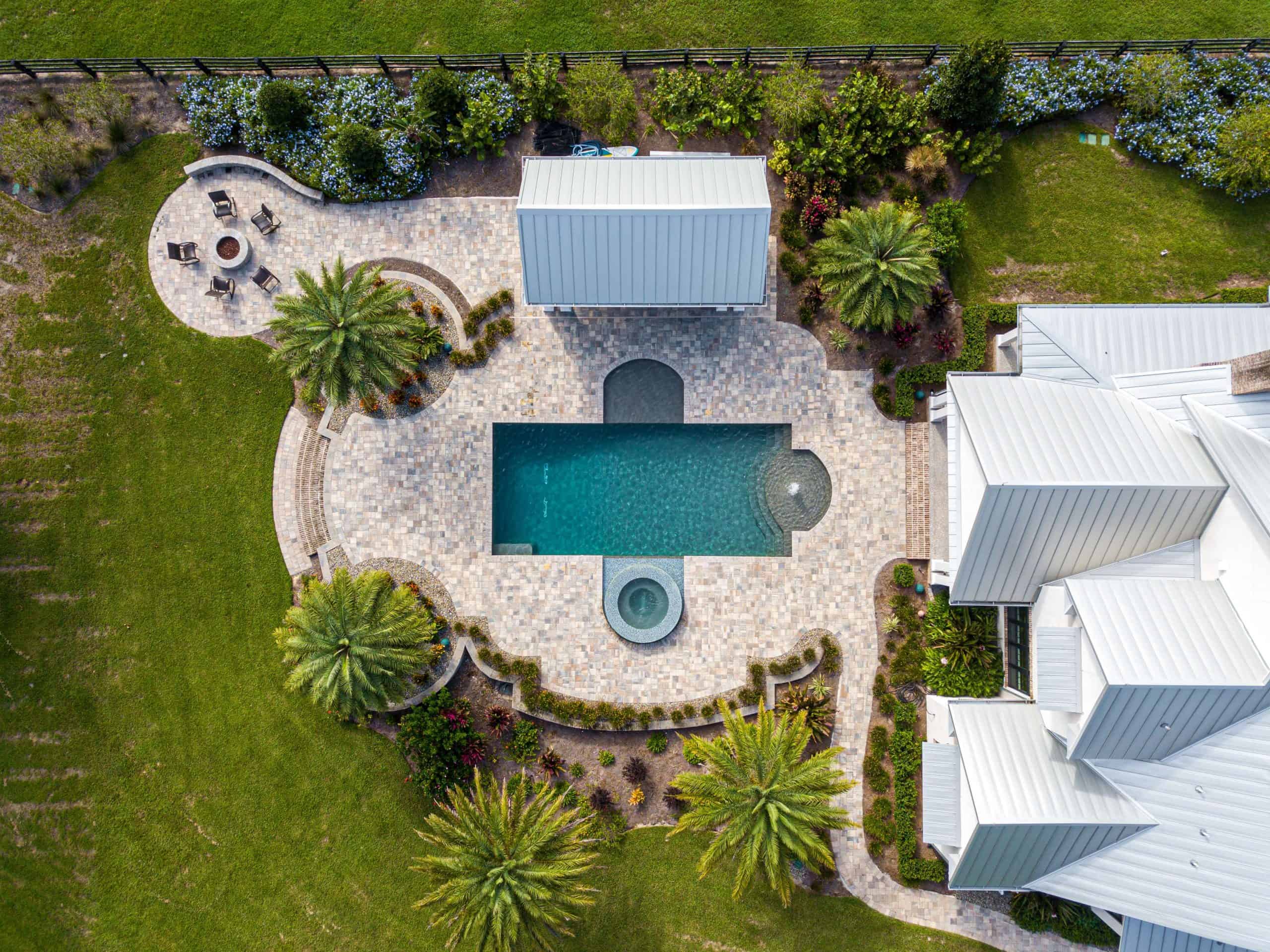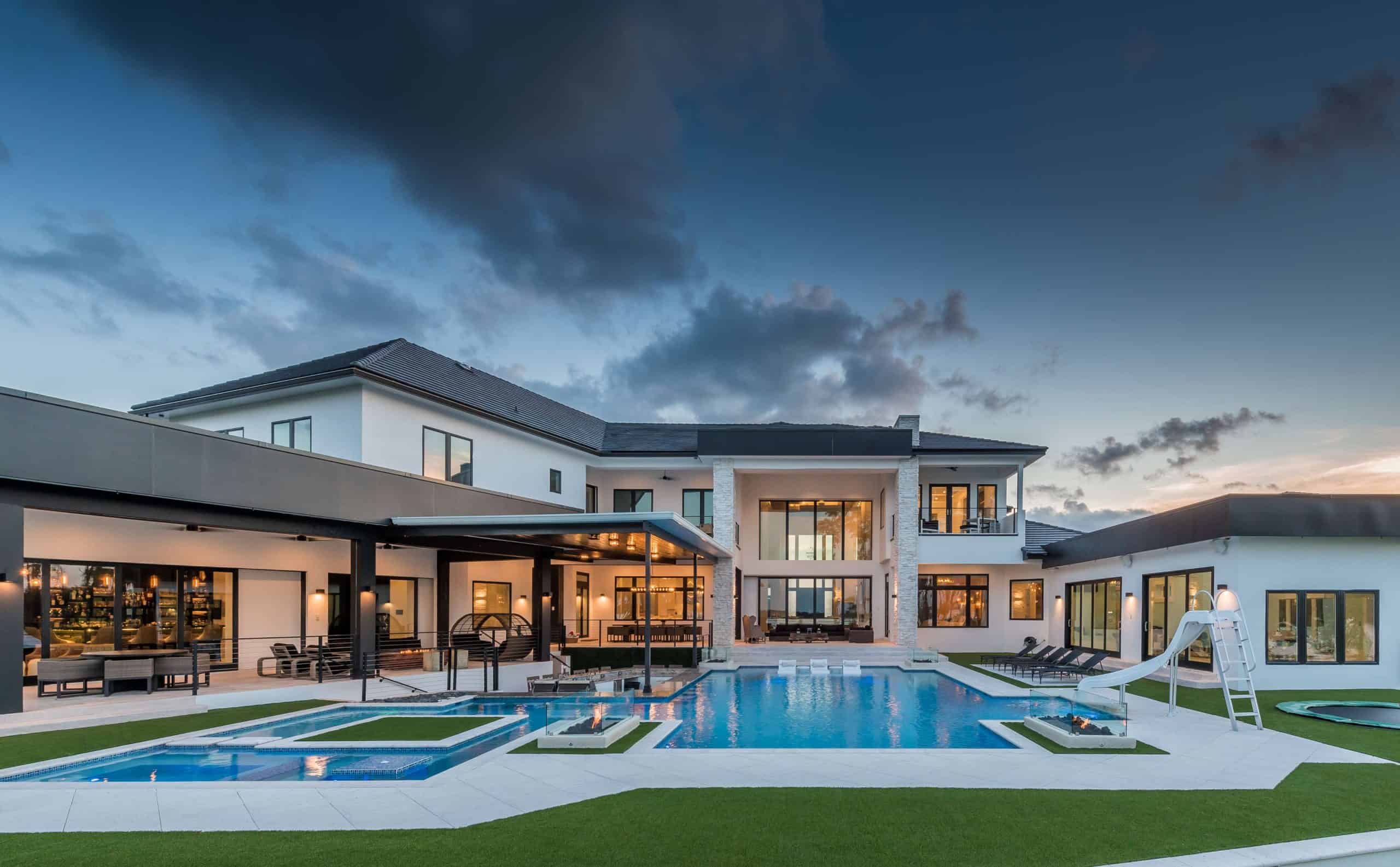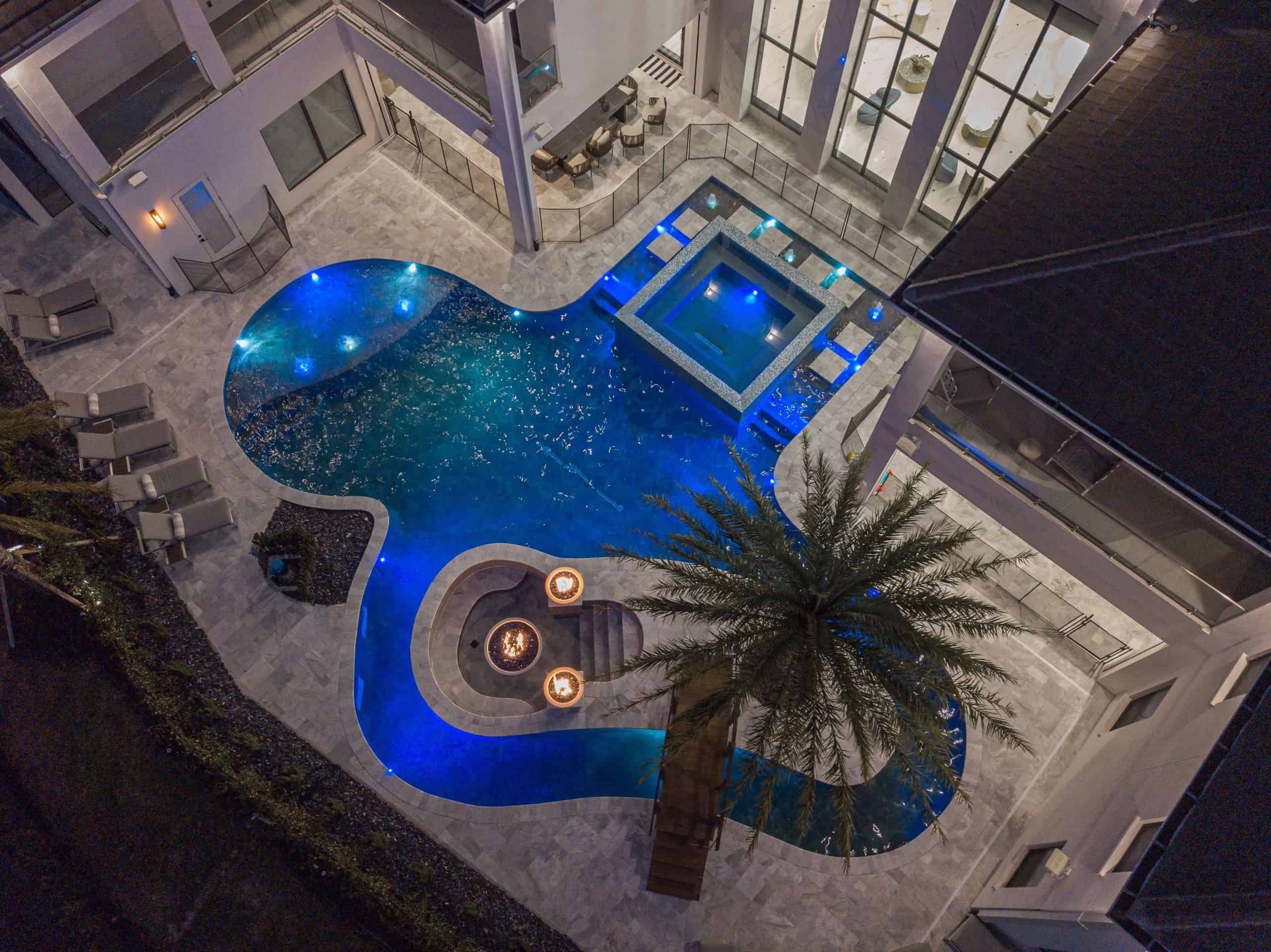 Florida luxury pool with island spa, sun shelf, custom bridge, and integrated lighting for a high-end resort feel.