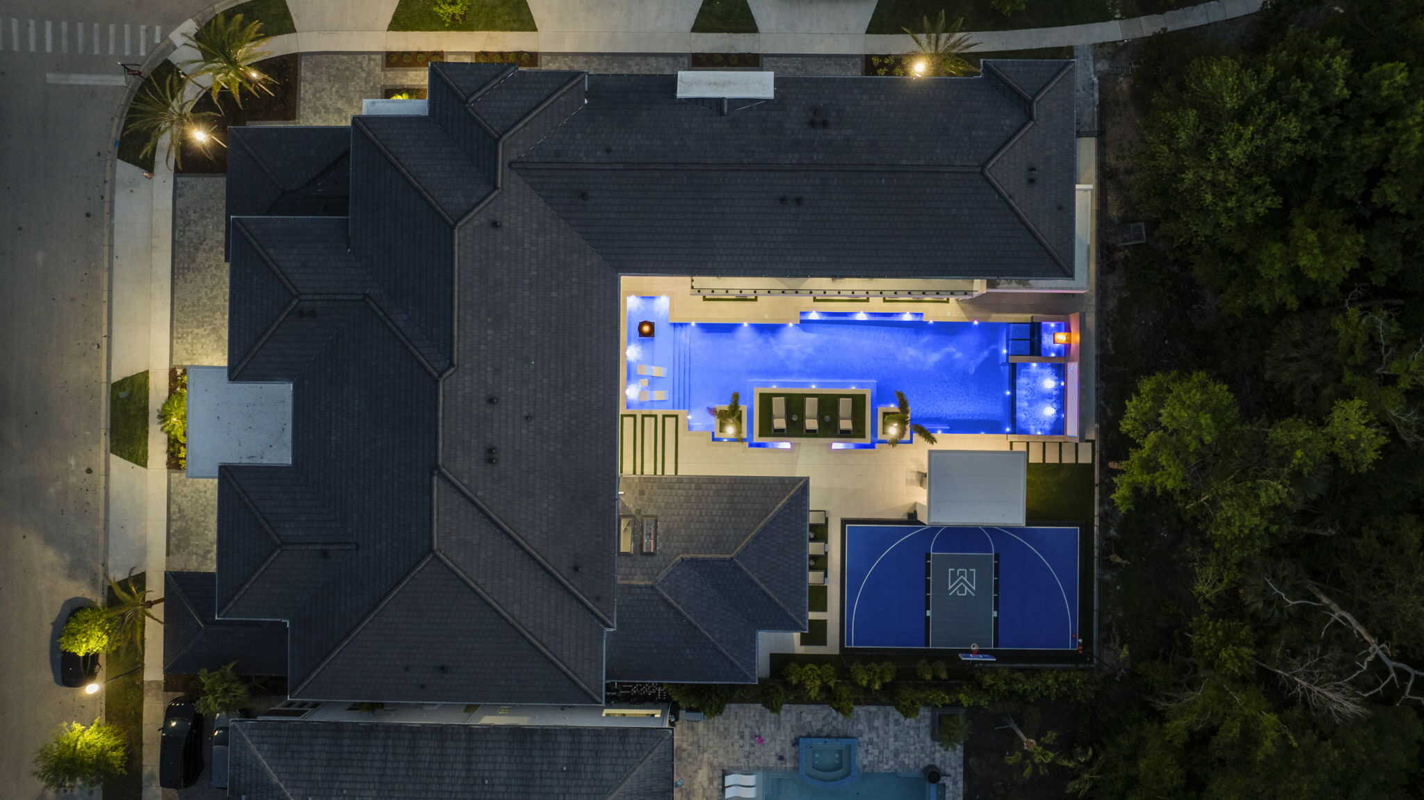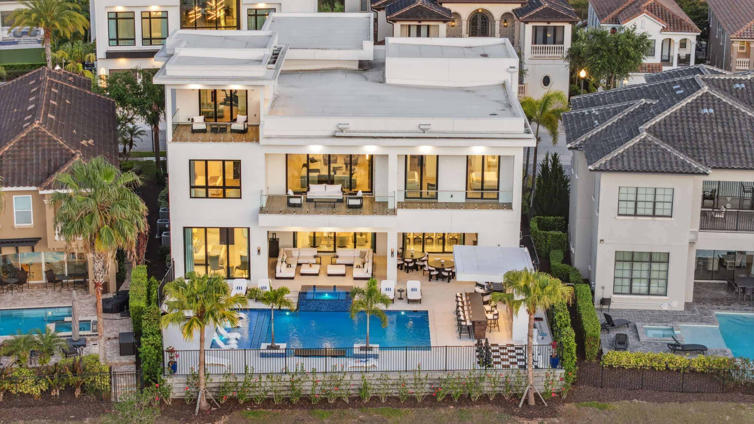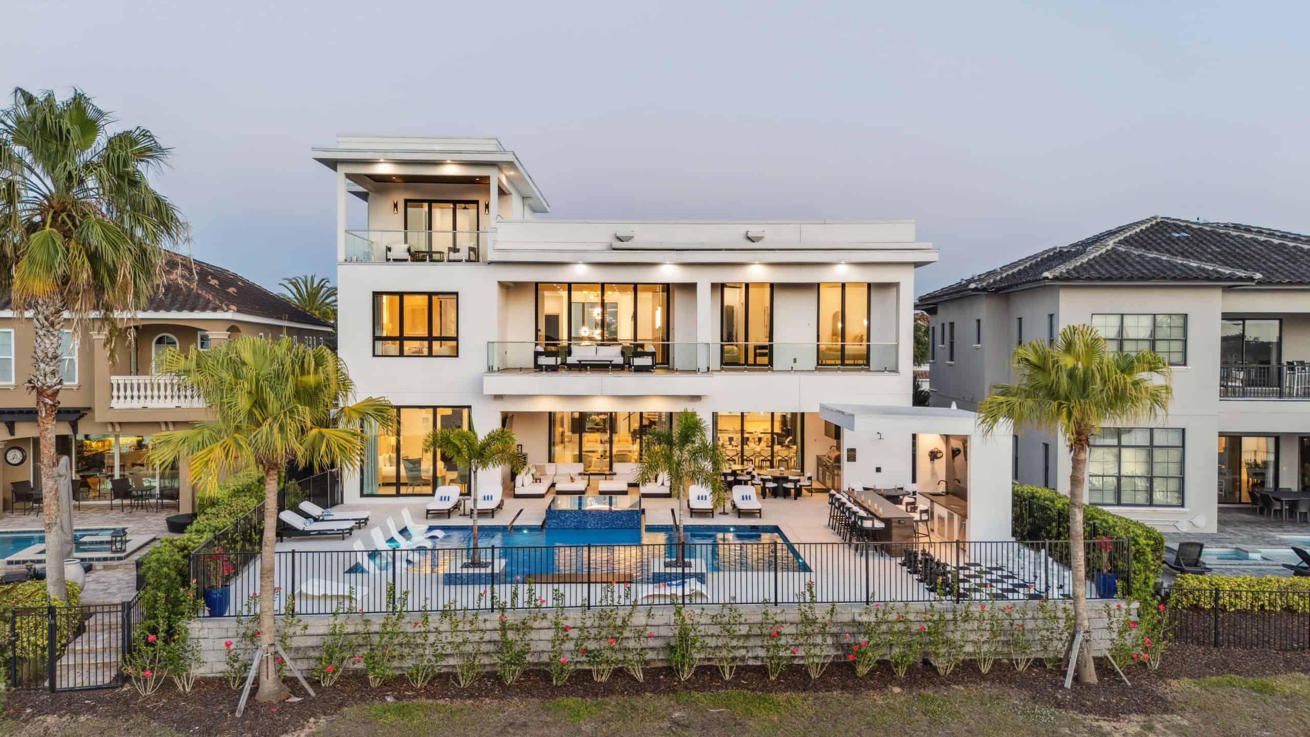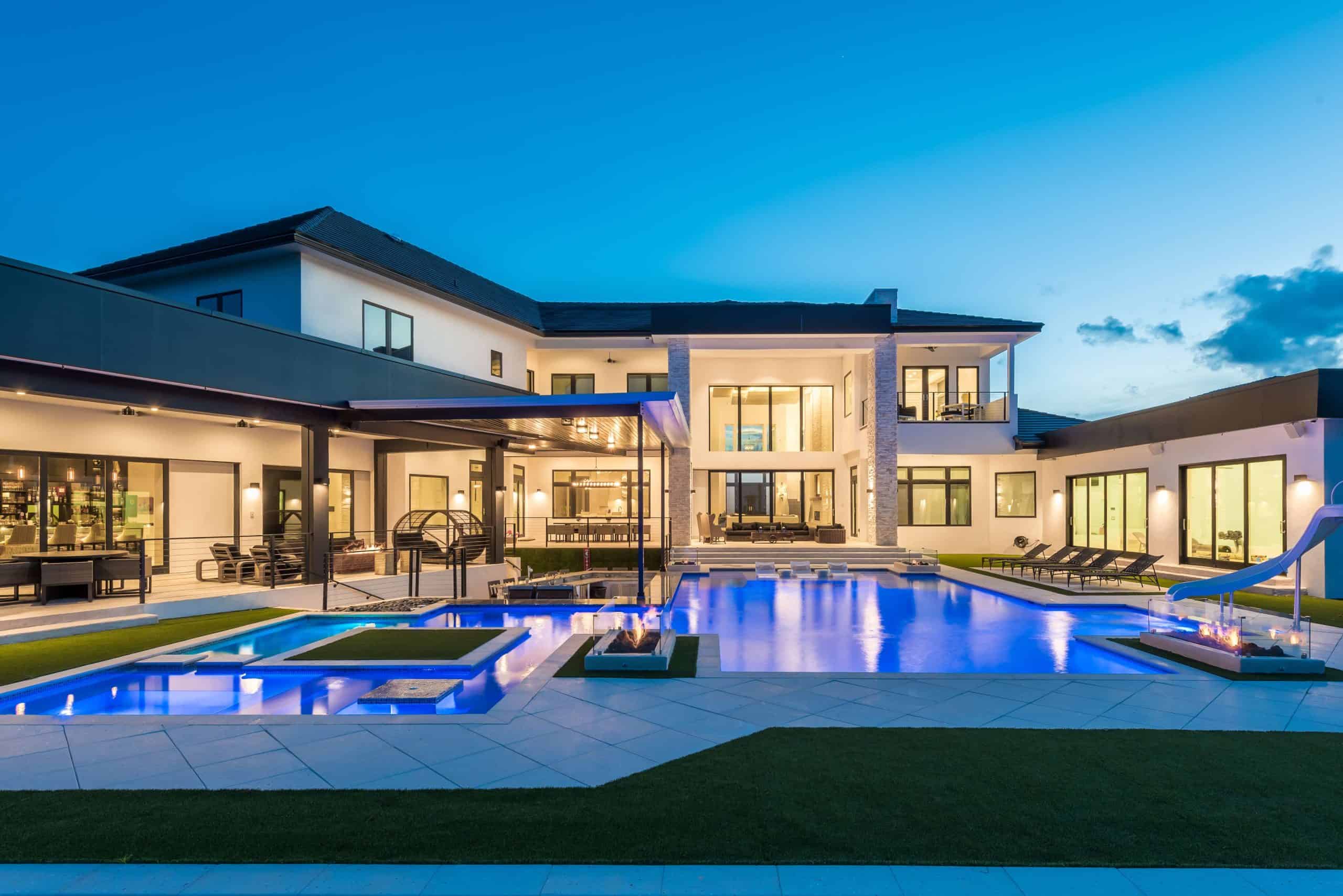 Florida luxury pool with island spa, sun shelf, custom bridge, and integrated lighting for a high-end resort feel.