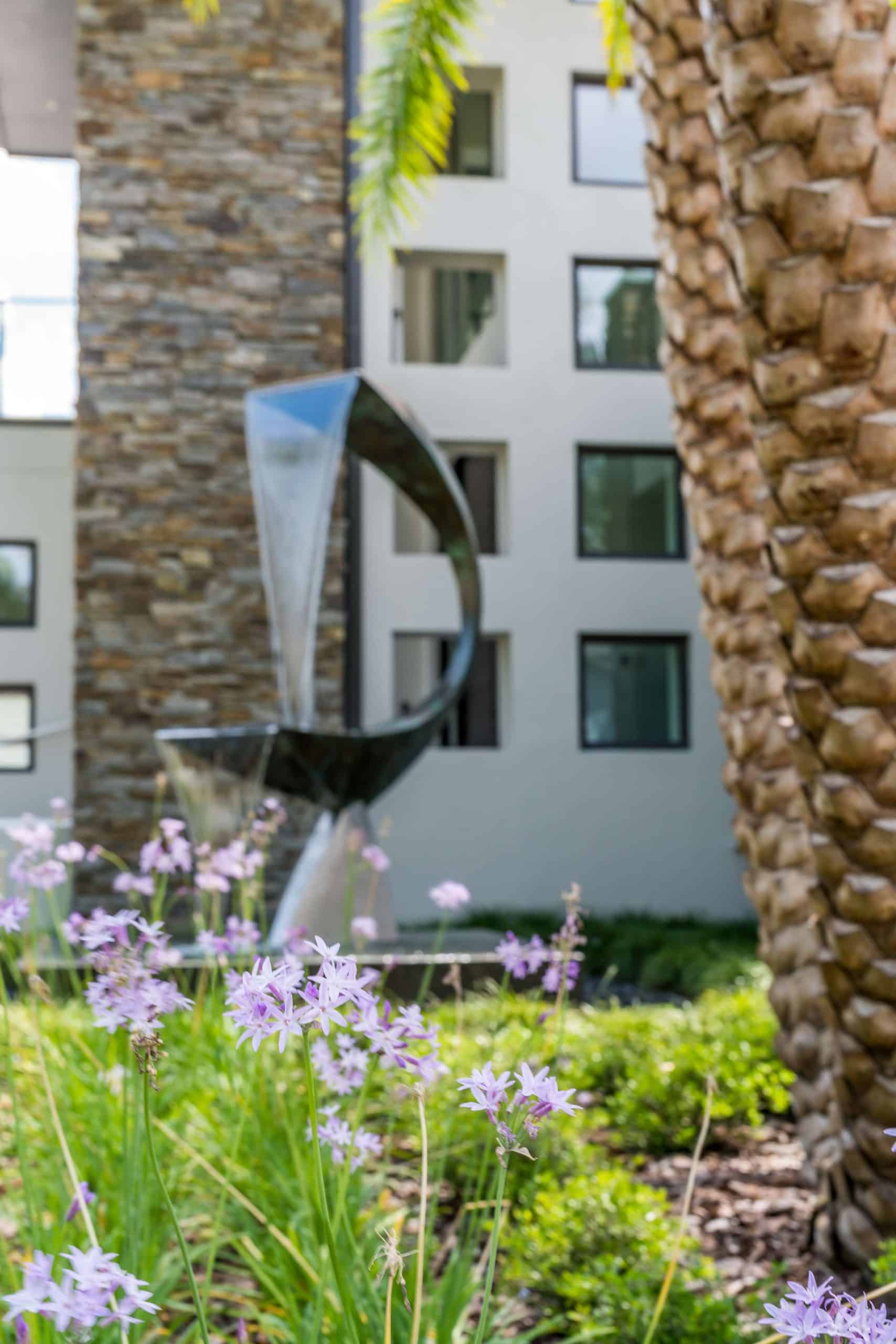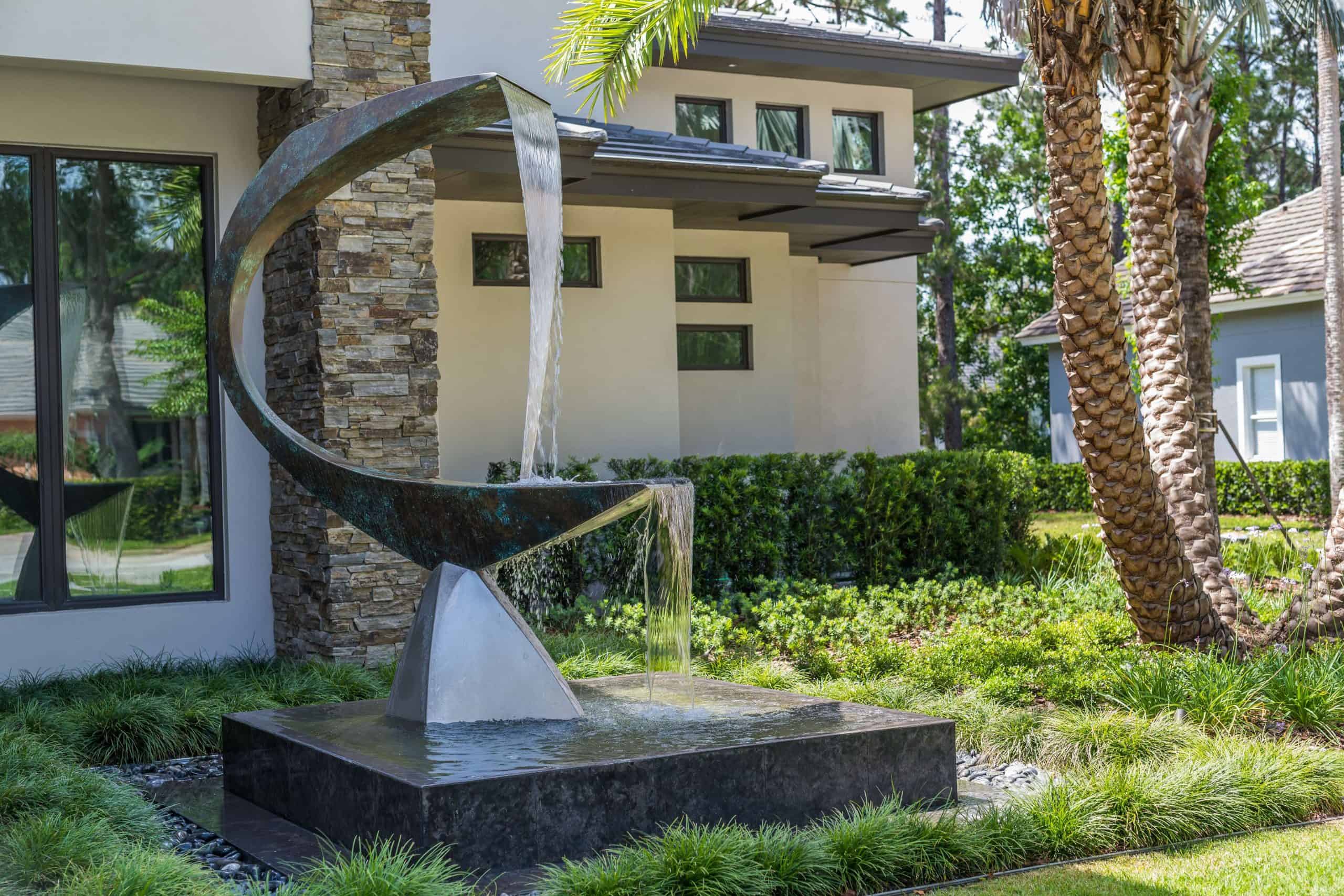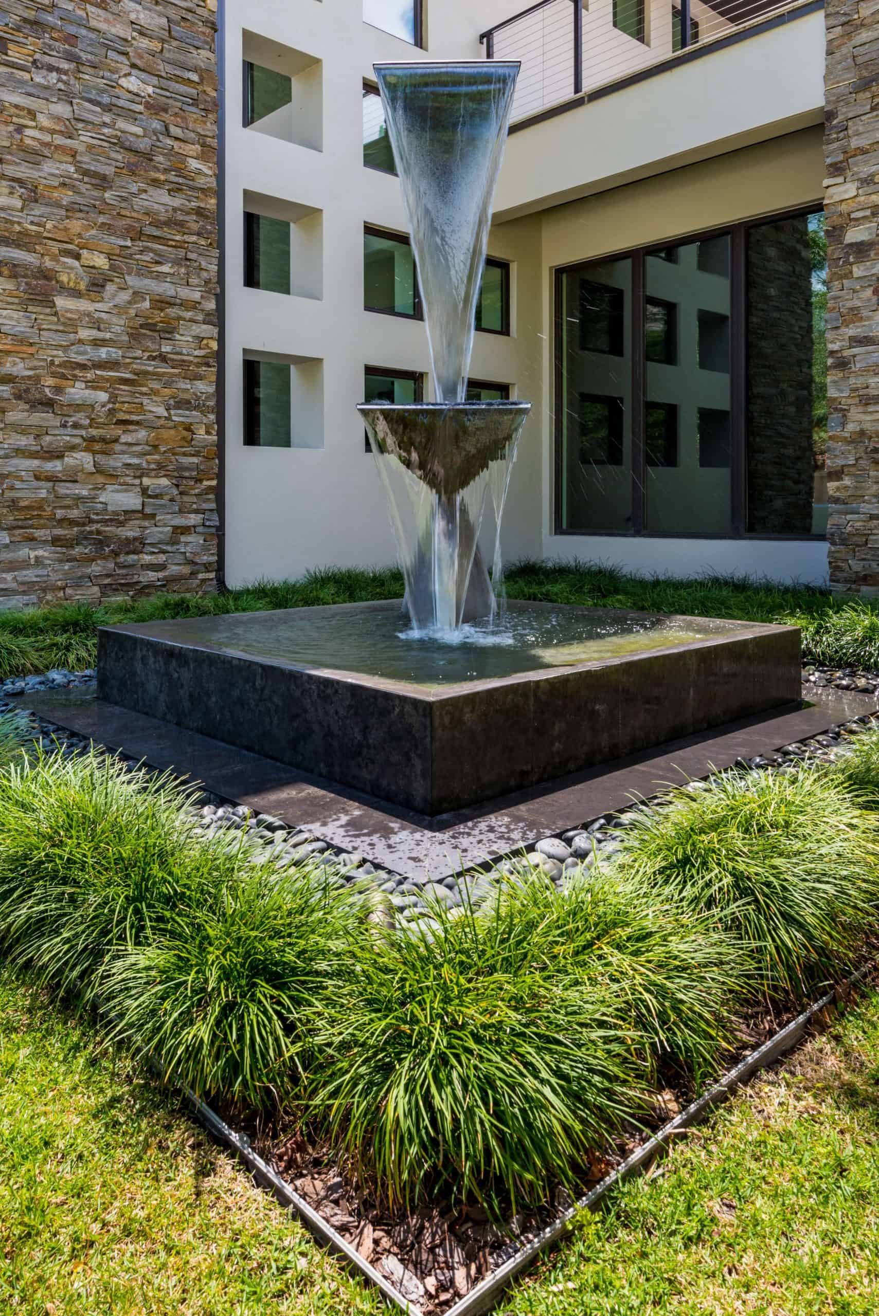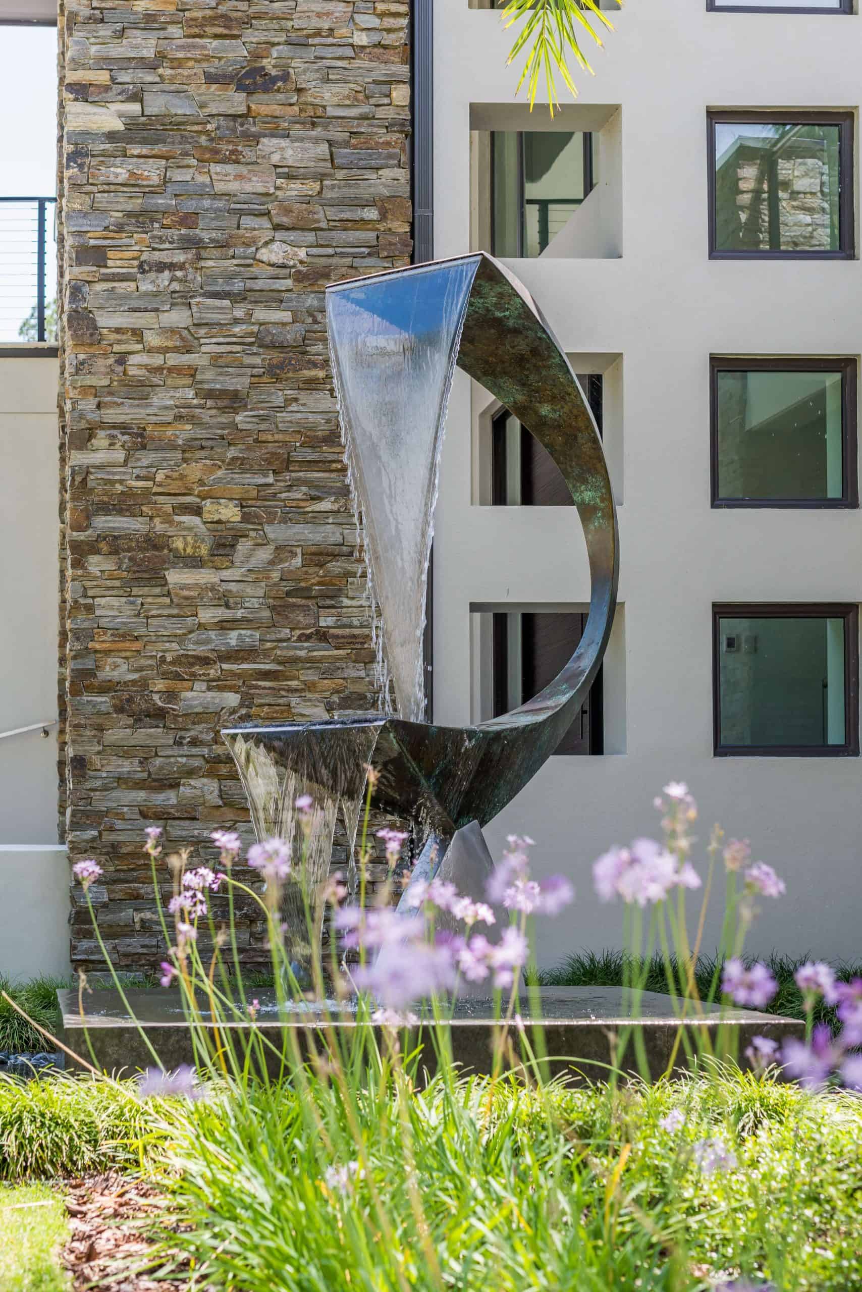 Contemporary stainless steel water feature enhances luxury landscaping with flowing movement and architectural elegance.