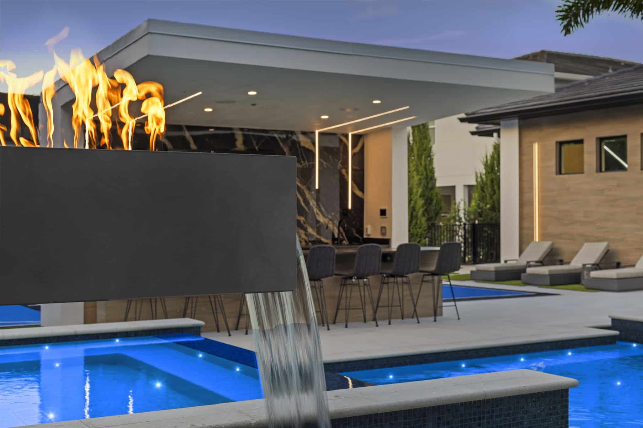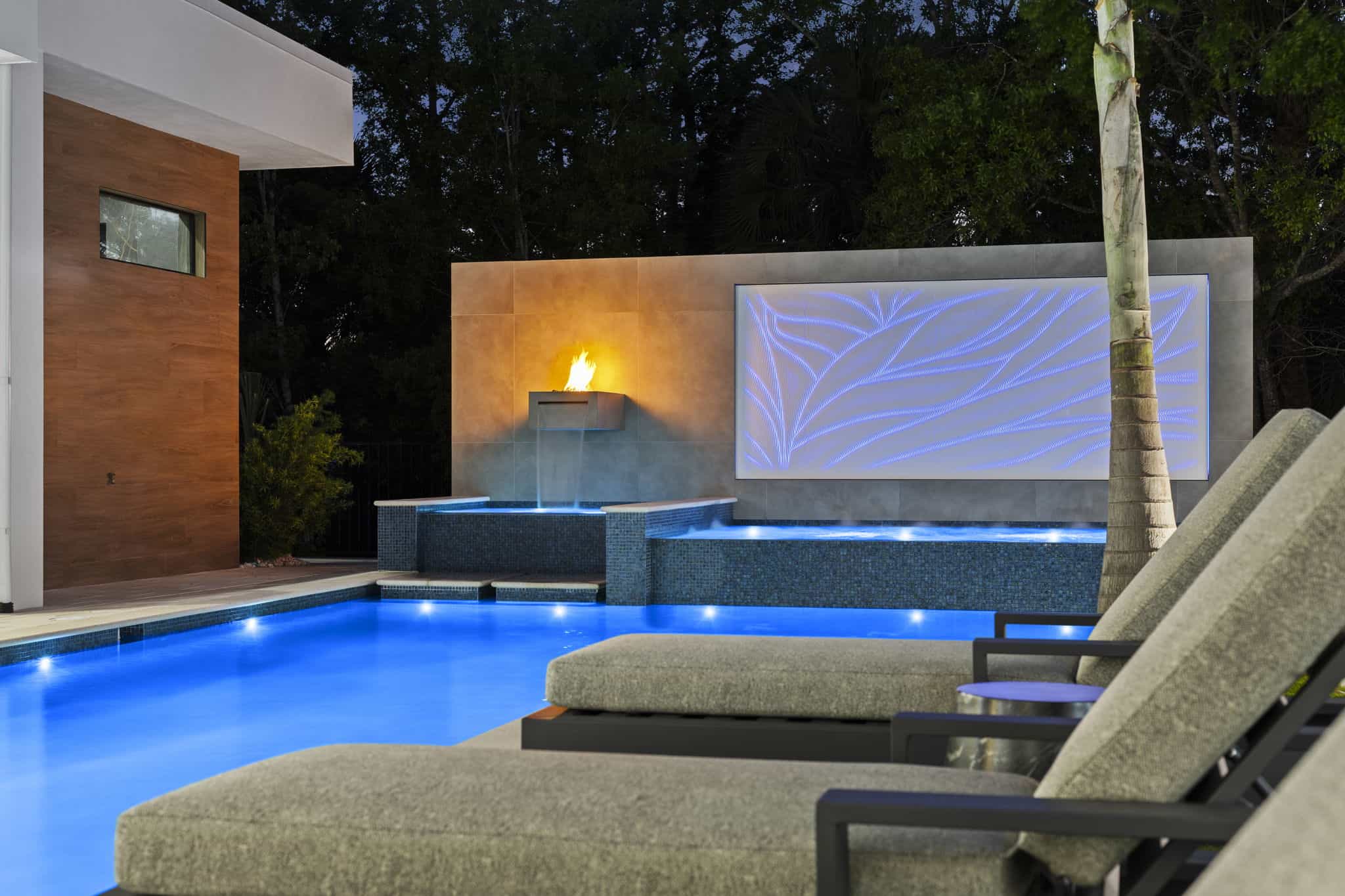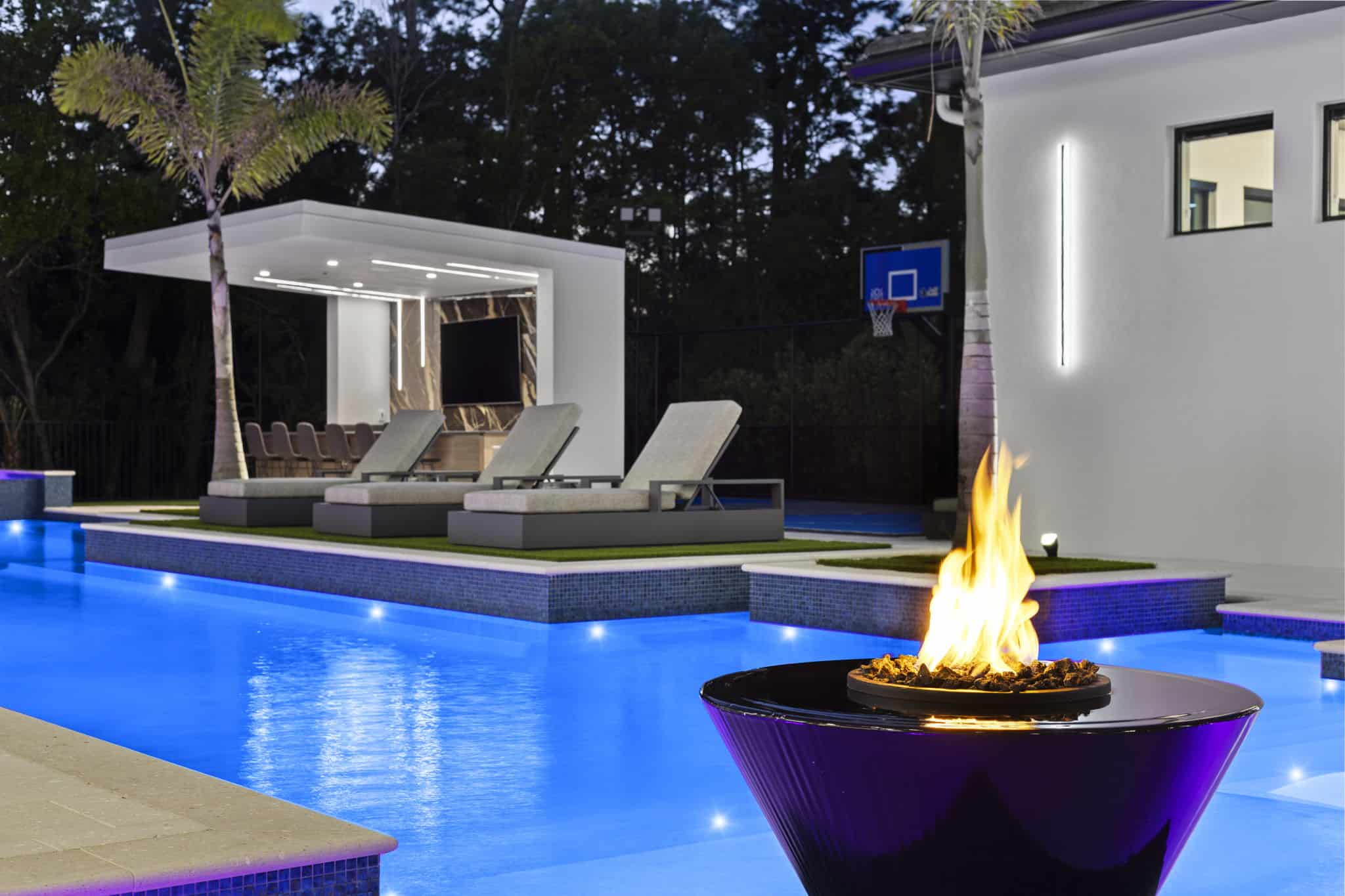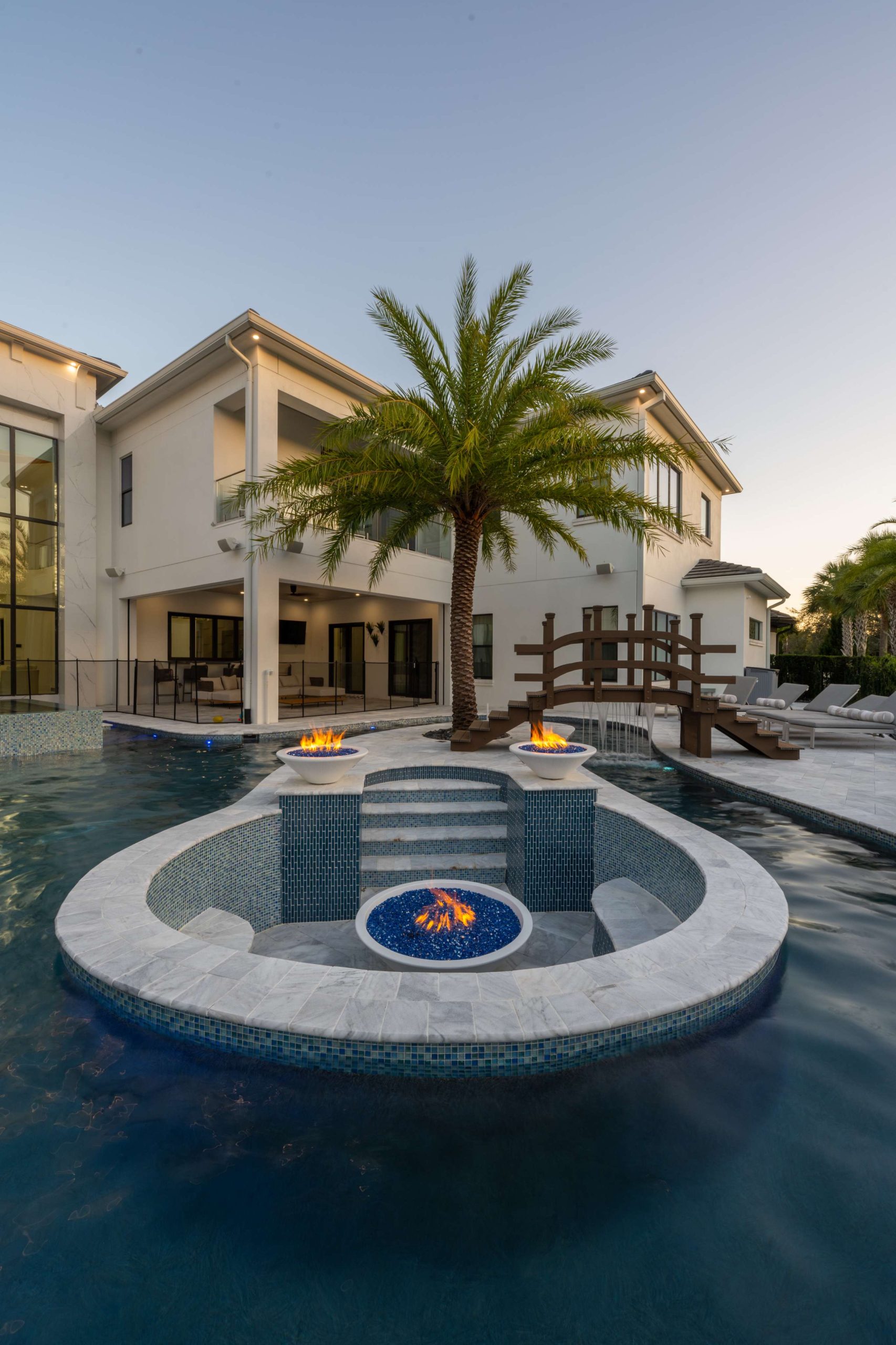 Contemporary Florida pool with in-water loungers, dual fire features, and sunken outdoor kitchen for the ultimate backyard resort design.