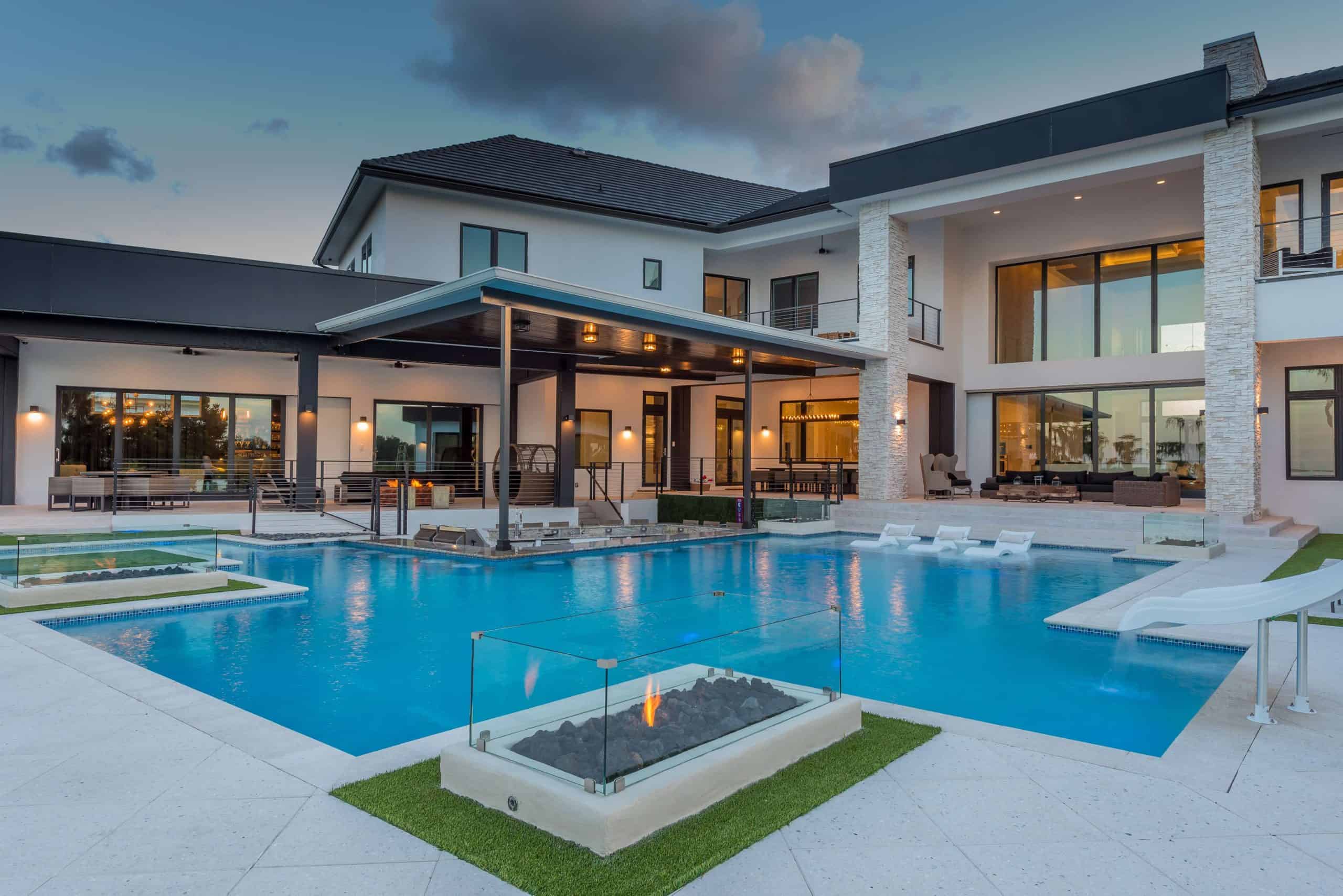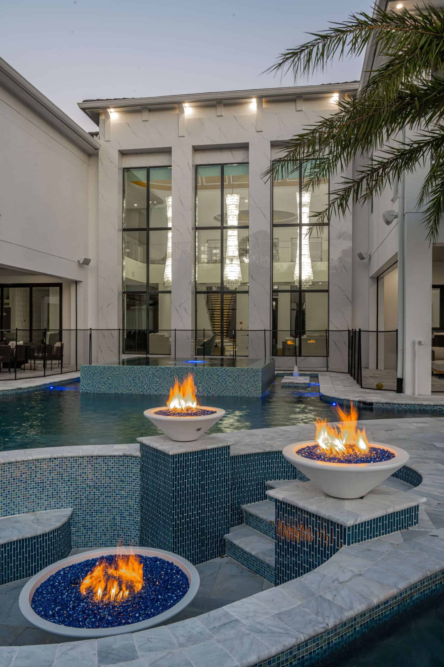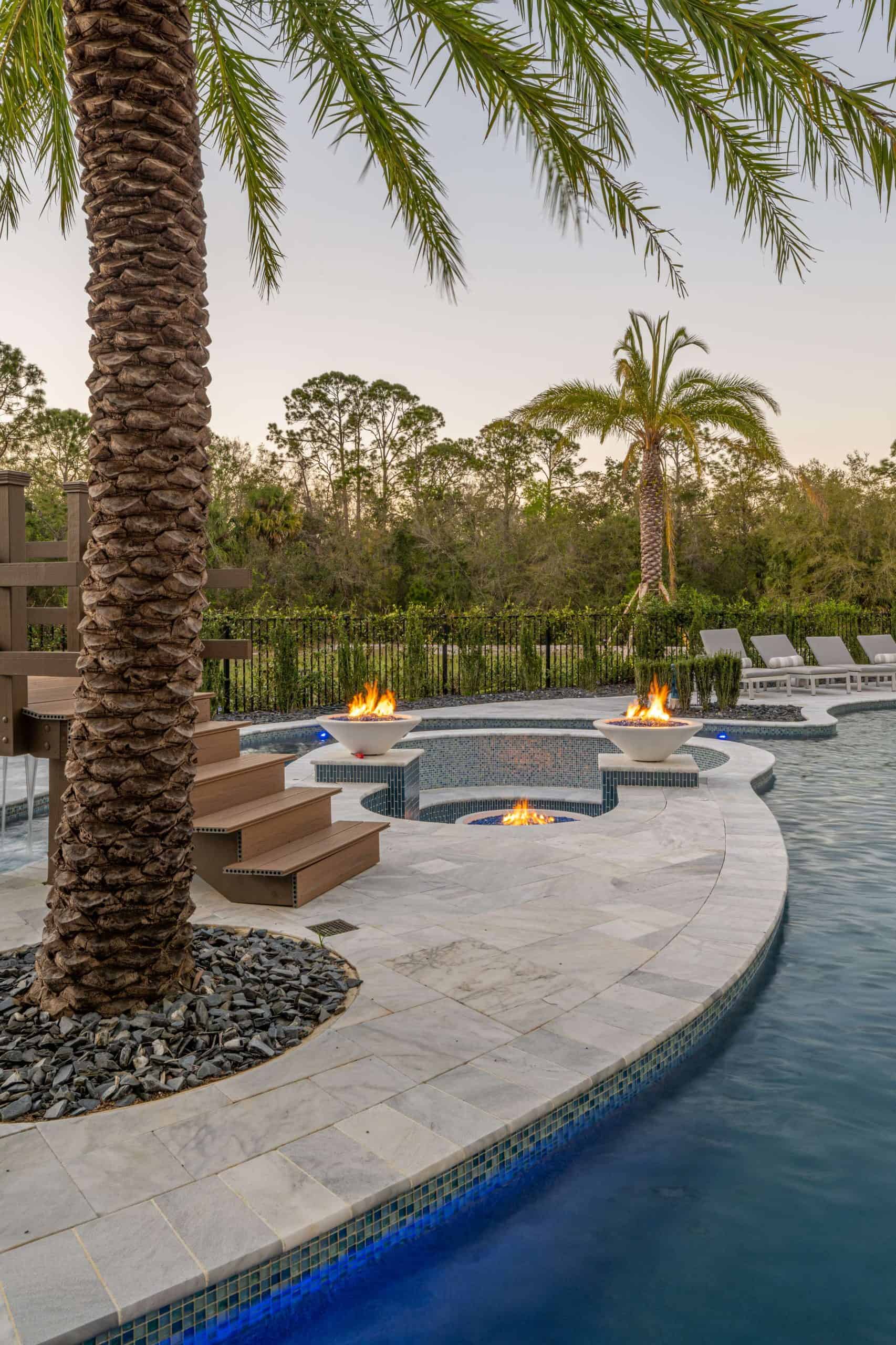 Contemporary Florida pool with in-water loungers, dual fire features, and sunken outdoor kitchen for the ultimate backyard resort design.