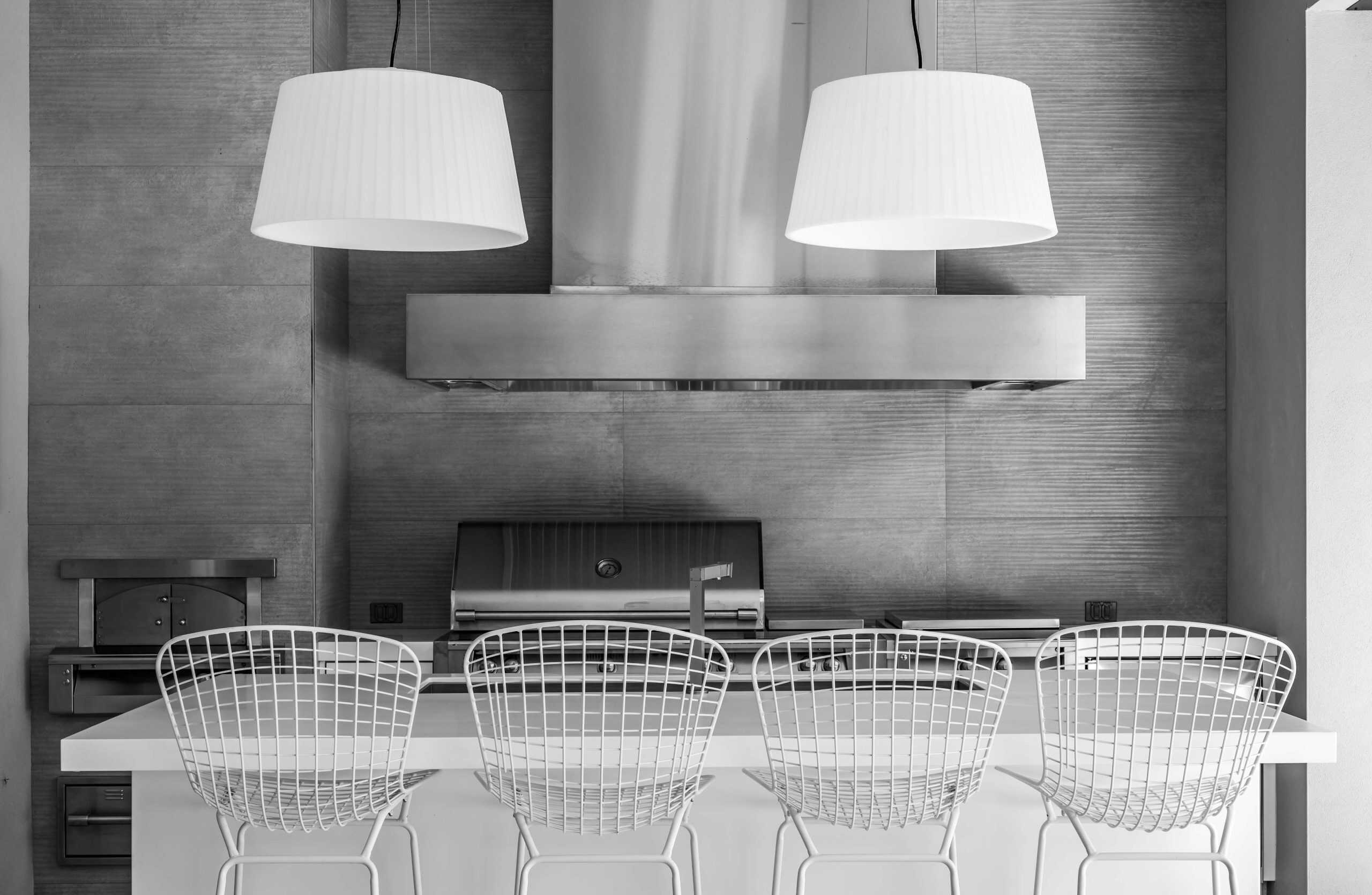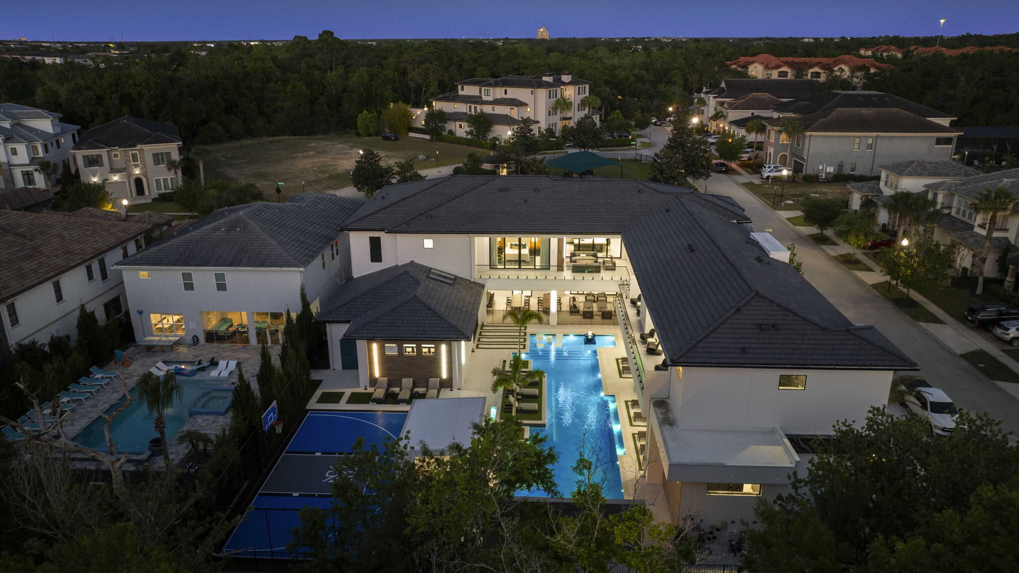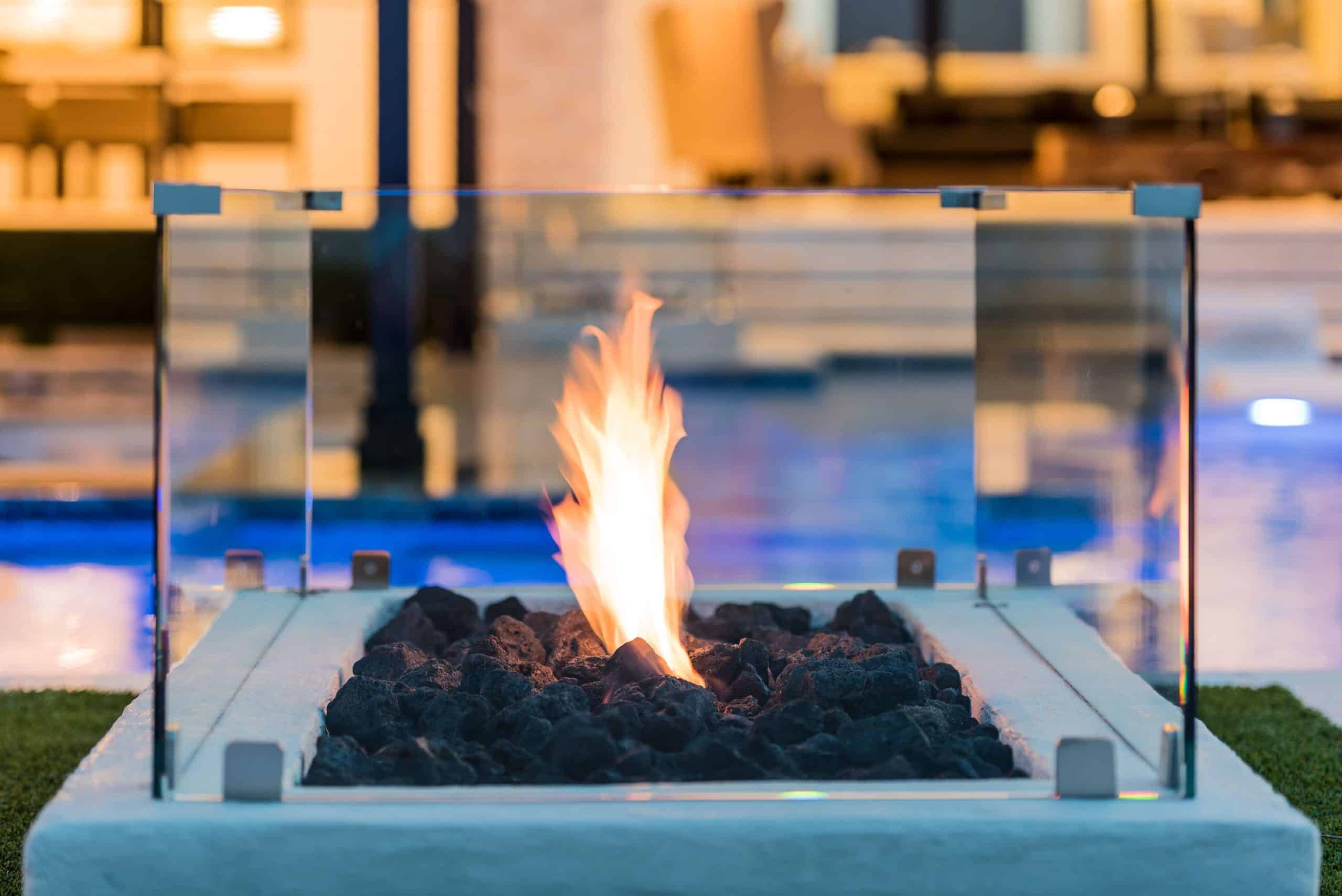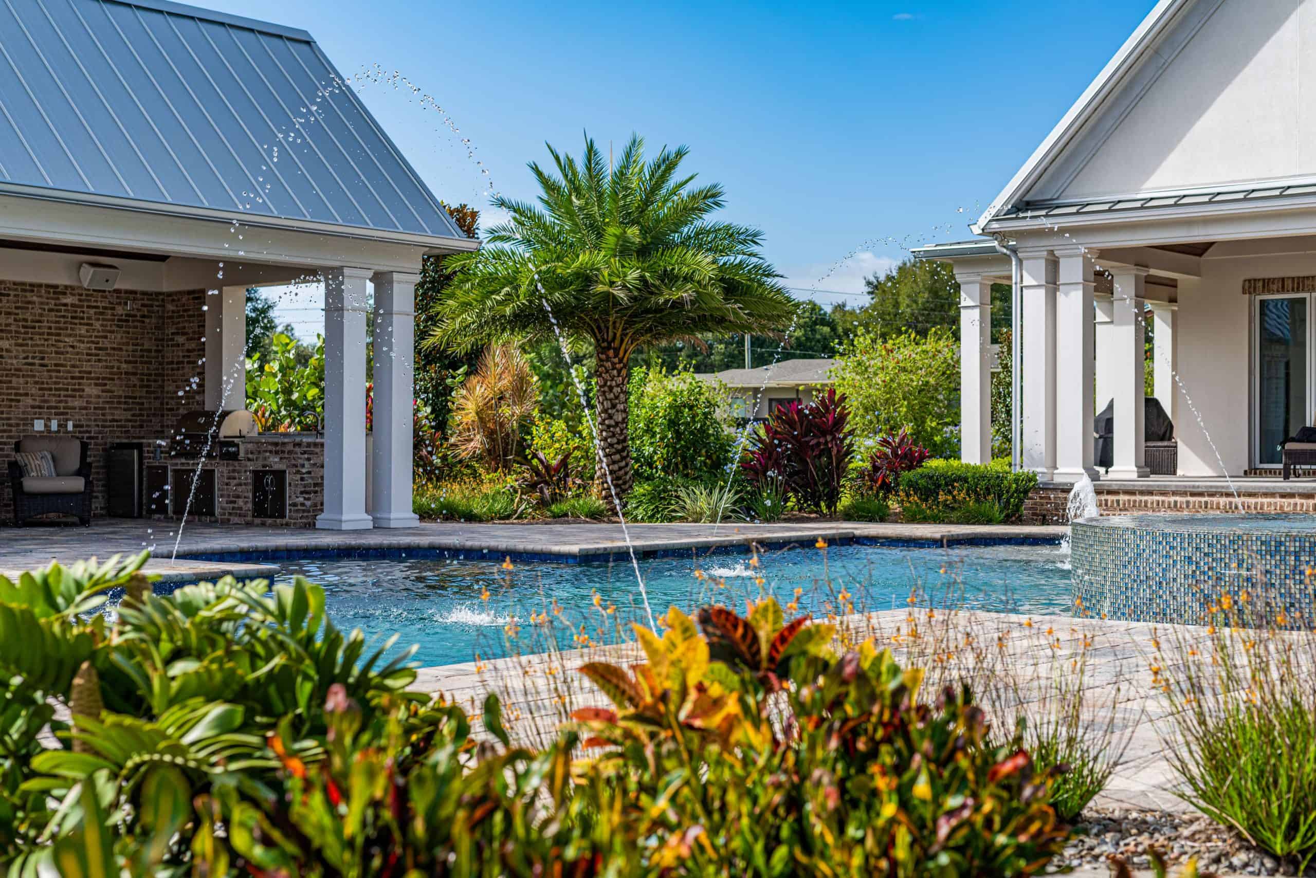 Contemporary Florida pool with in-water loungers, dual fire features, and sunken outdoor kitchen for the ultimate backyard resort design.