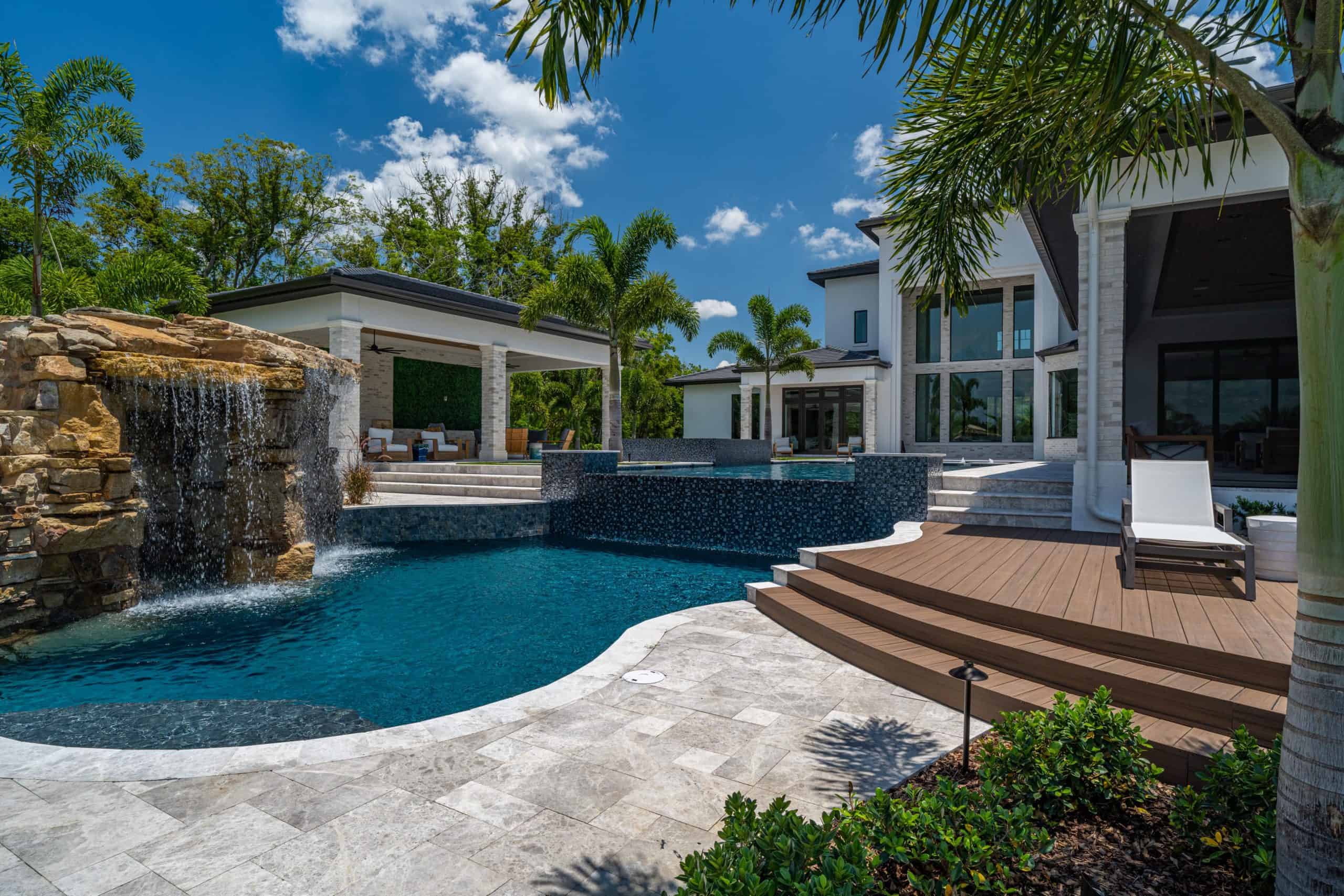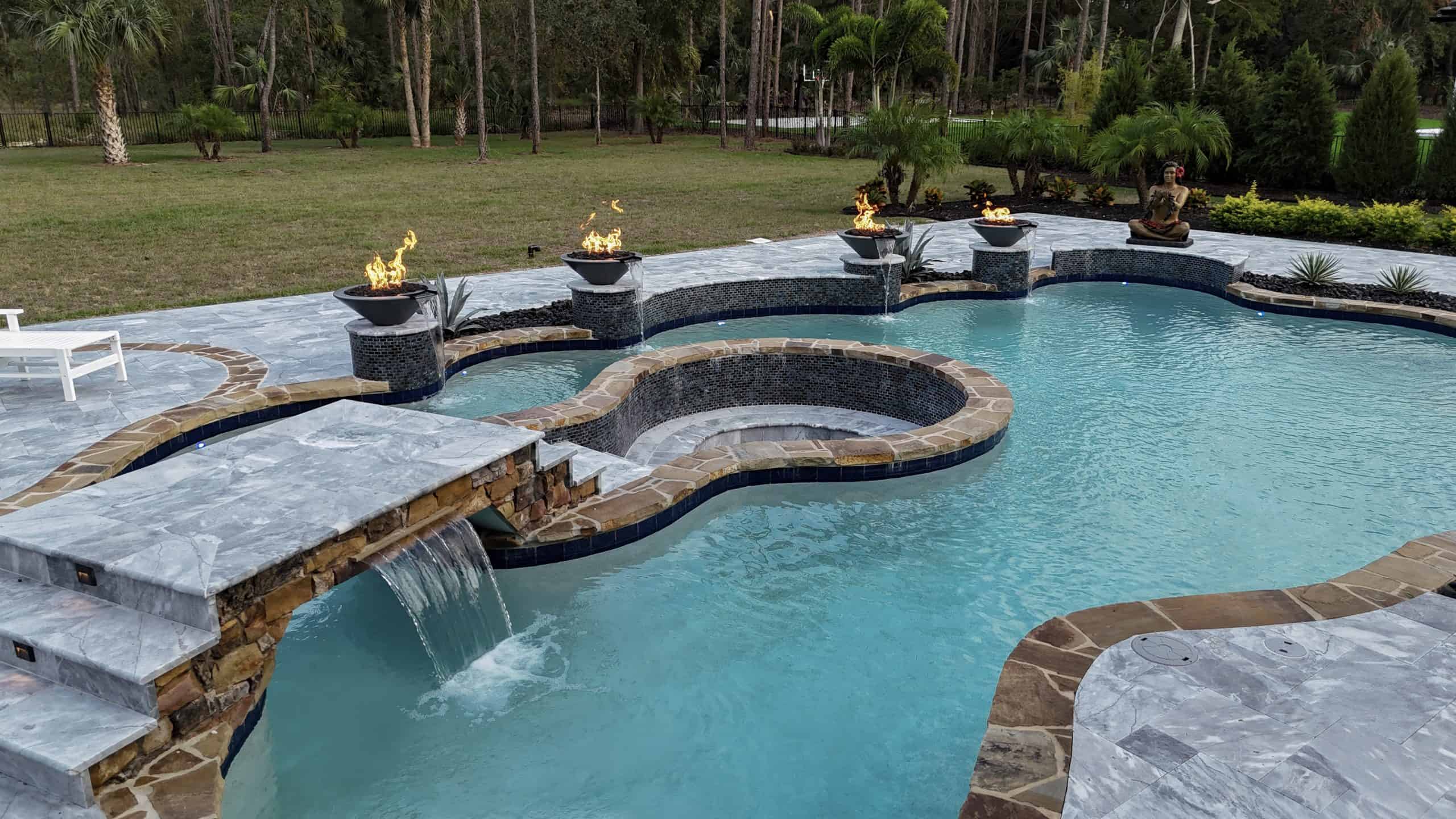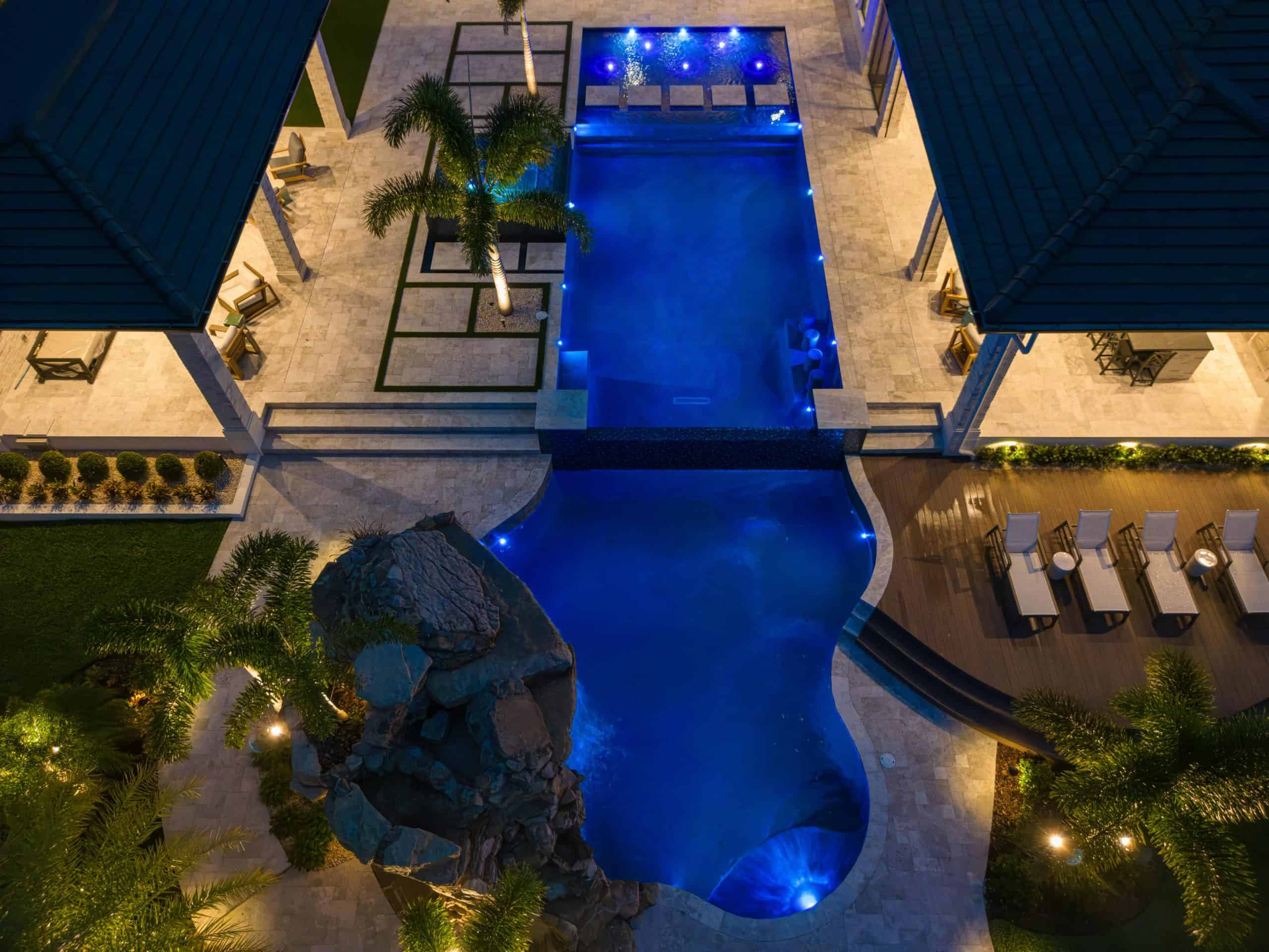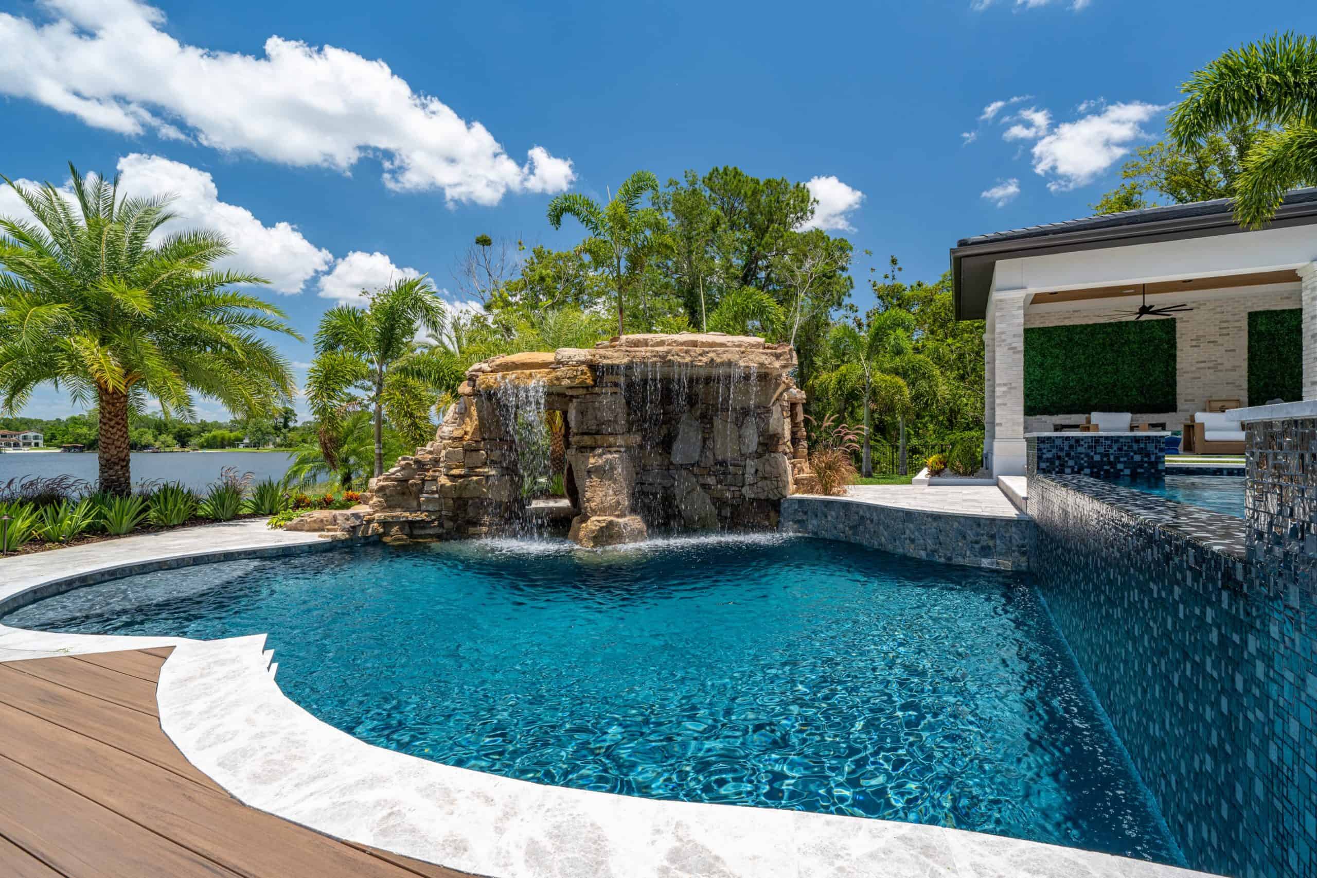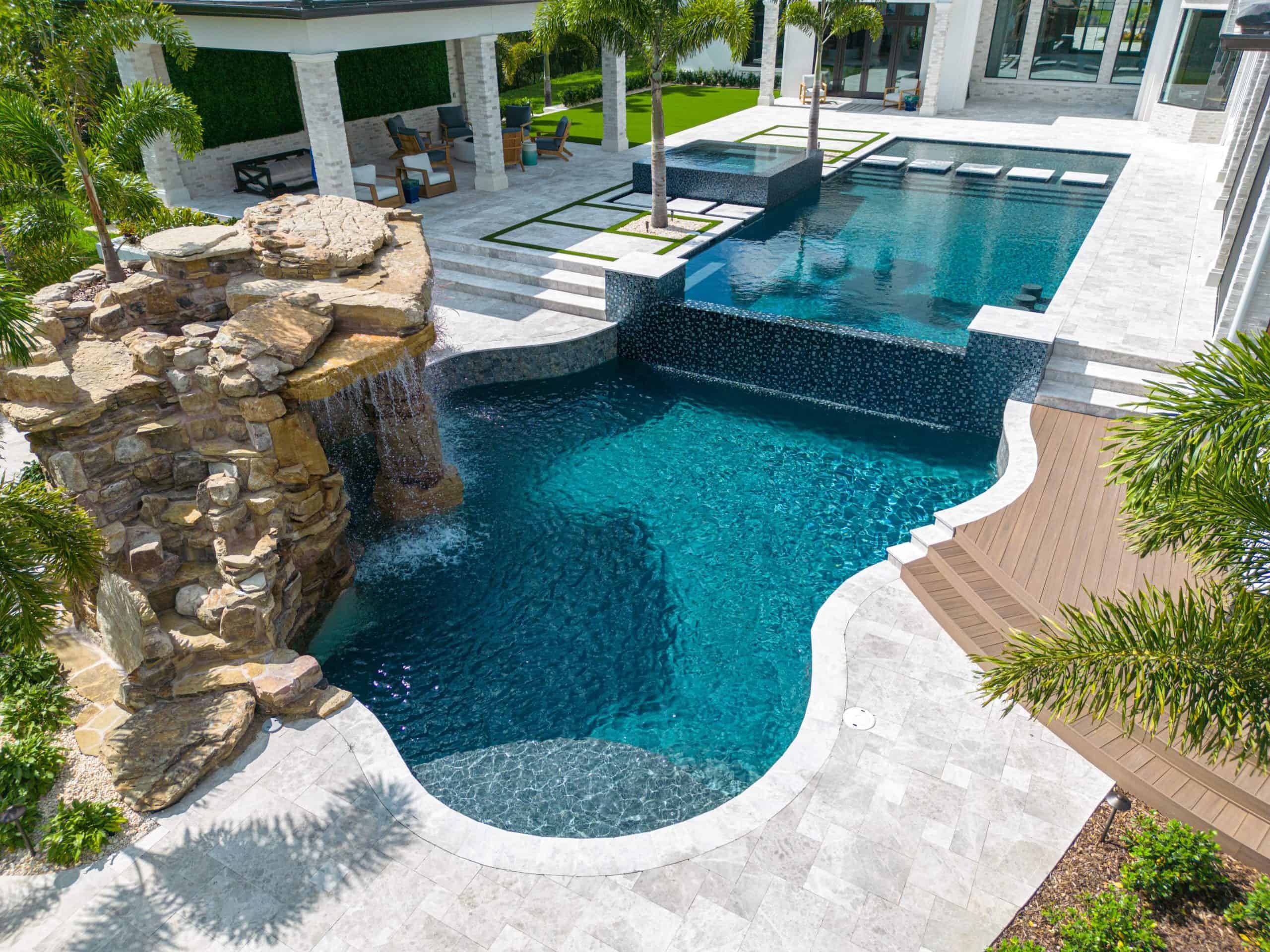 Custom-built luxury pool in Florida featuring a natural rock waterfall, elevated spa, and infinity-edge design.