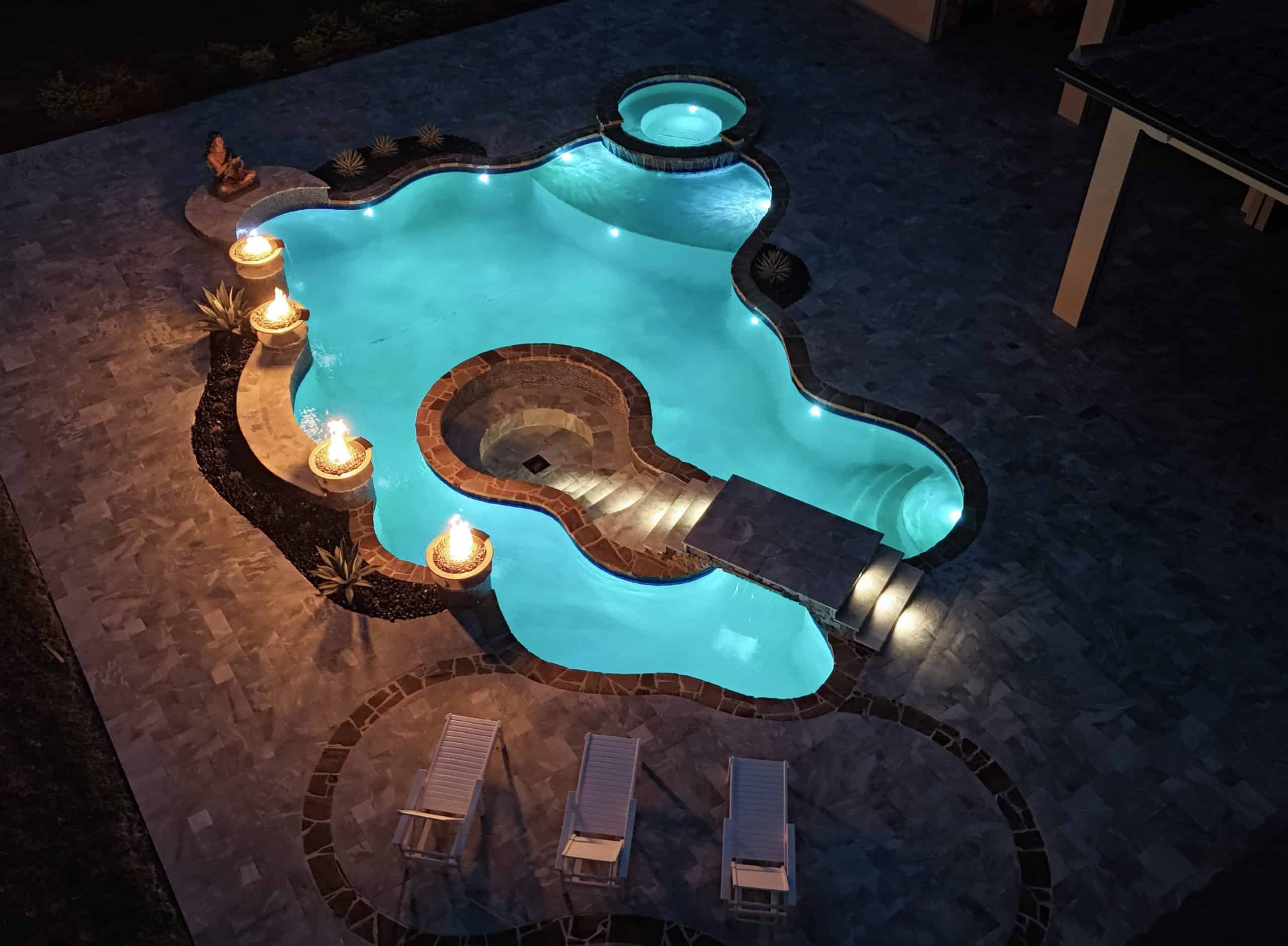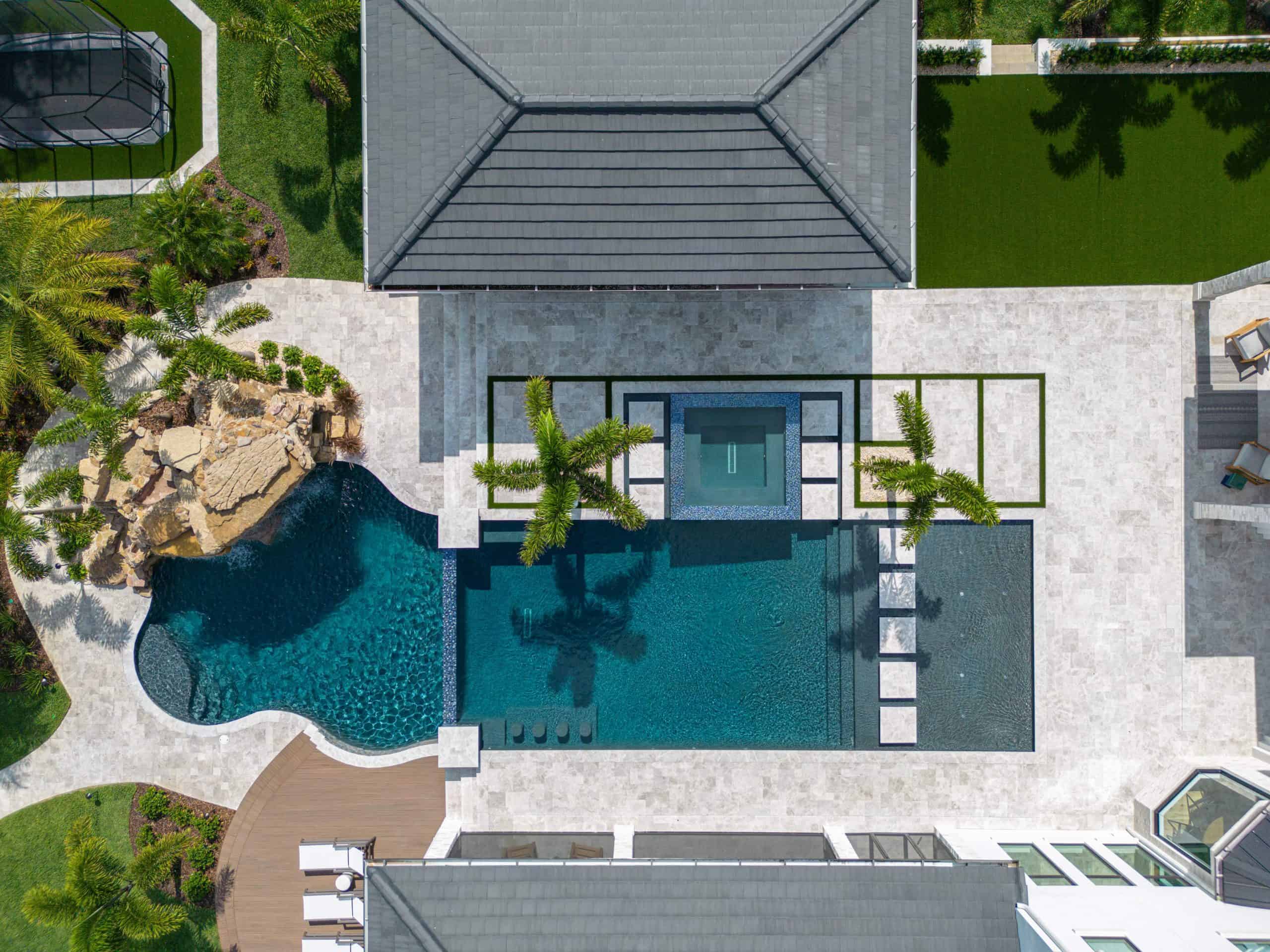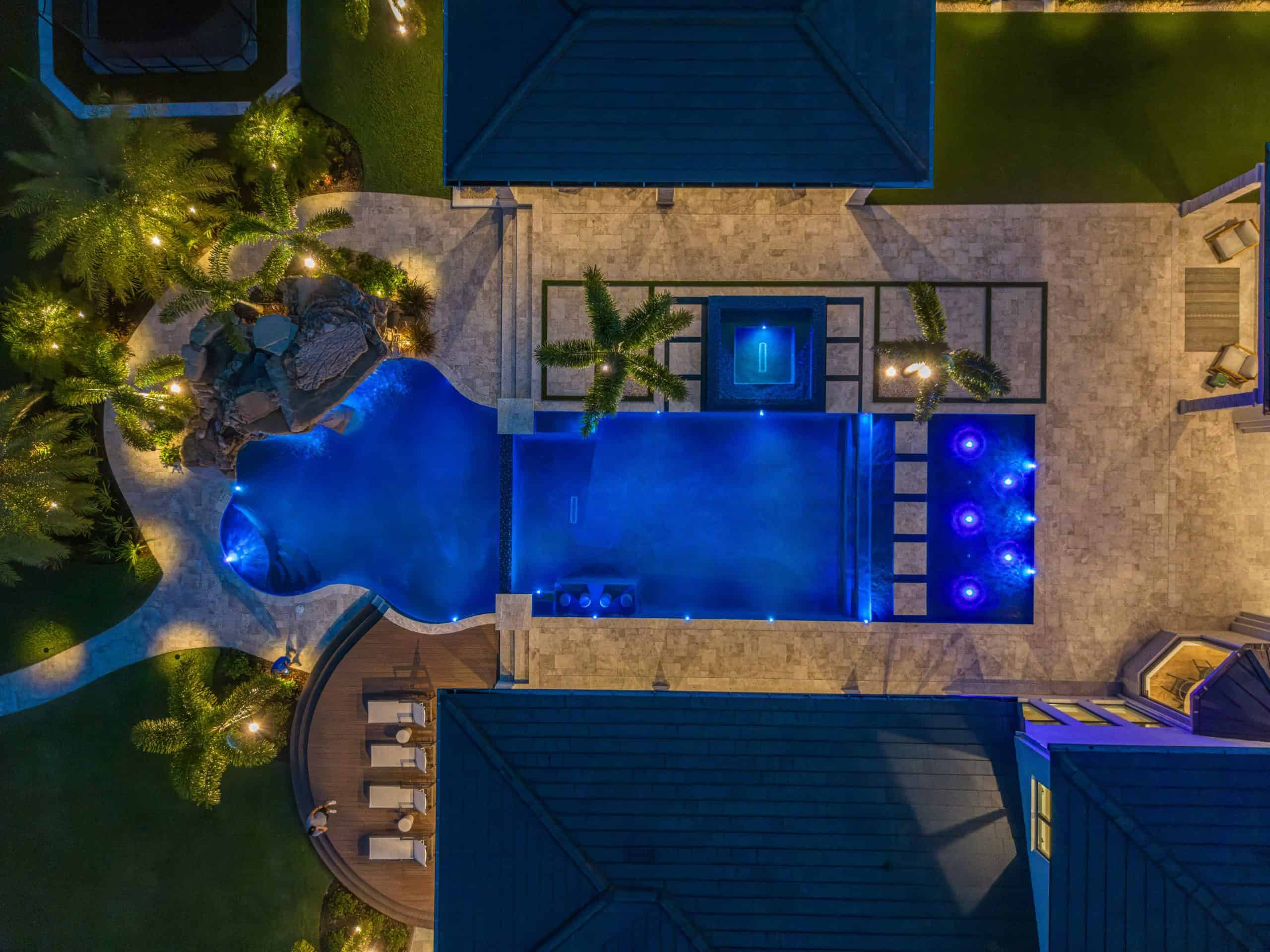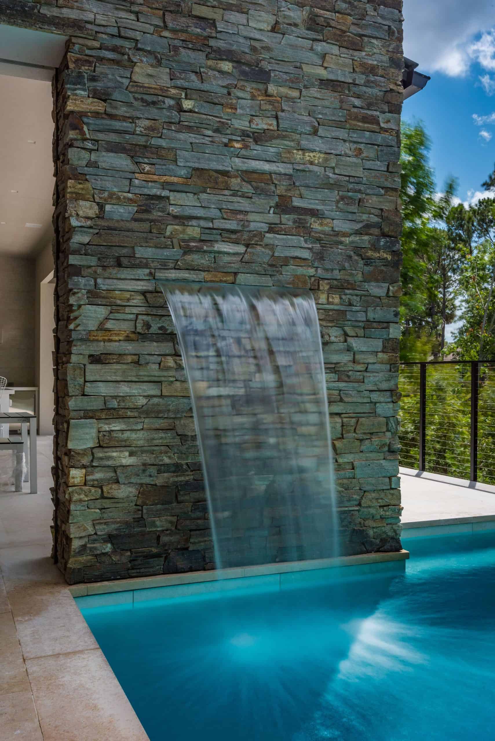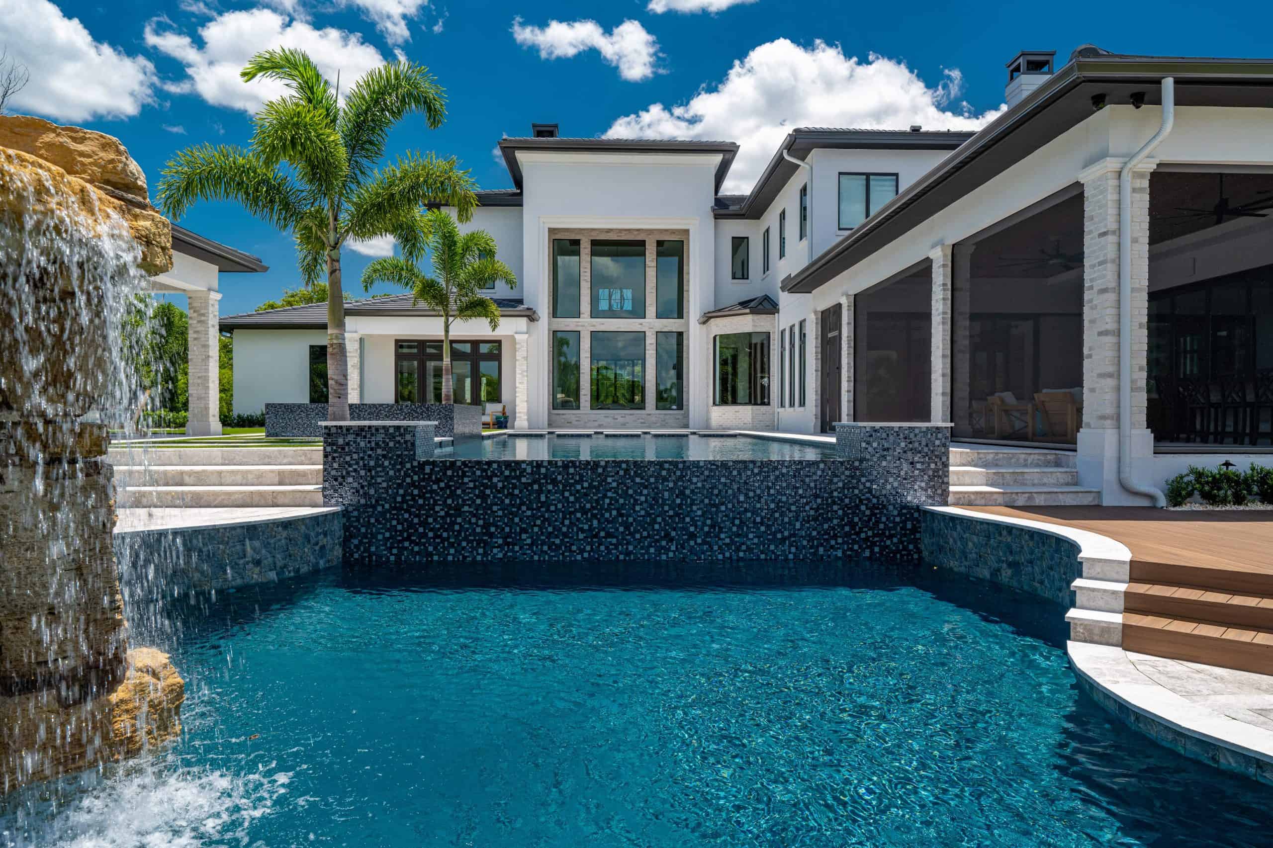 Custom-built luxury pool in Florida featuring a natural rock waterfall, elevated spa, and infinity-edge design.