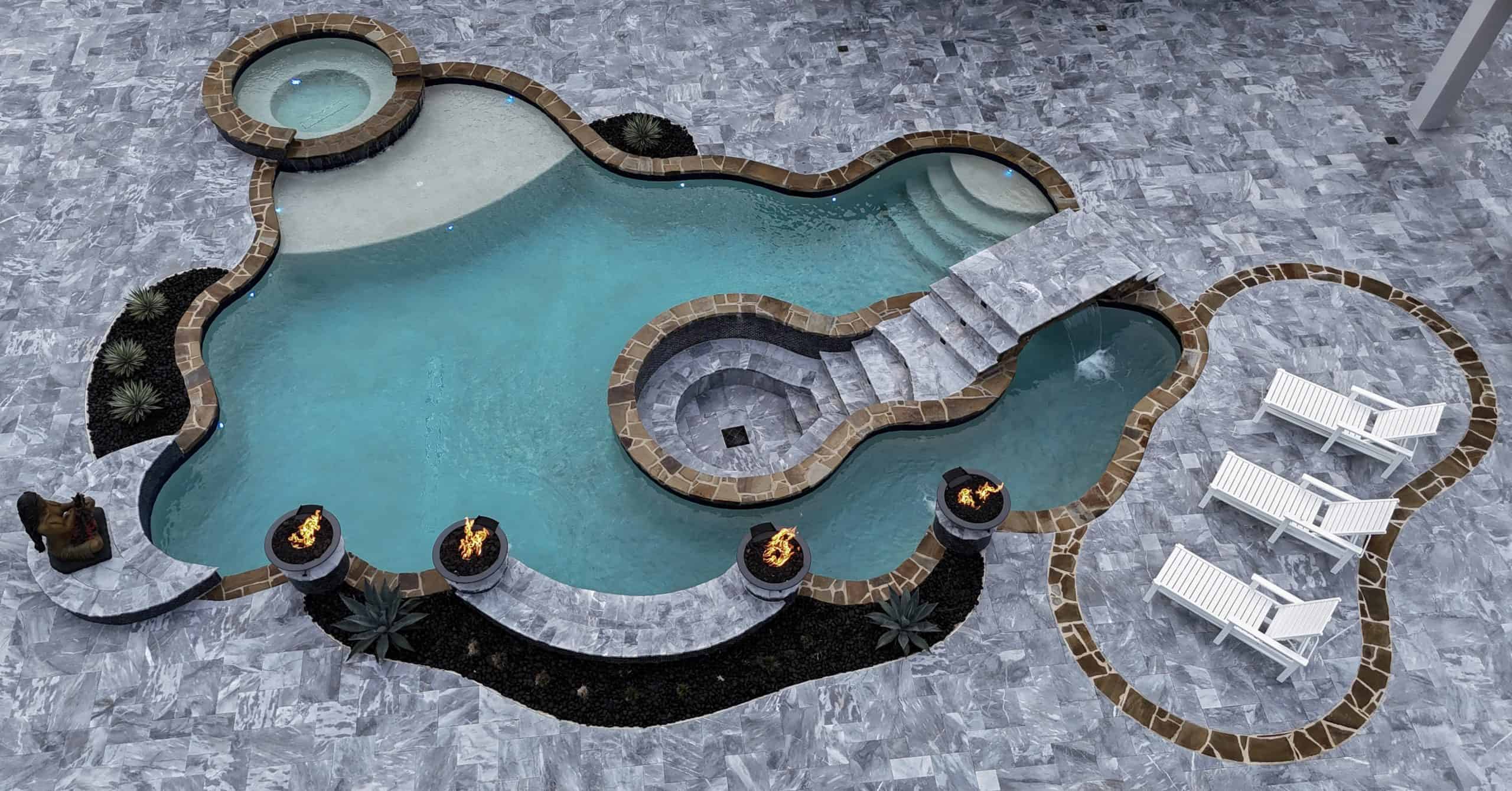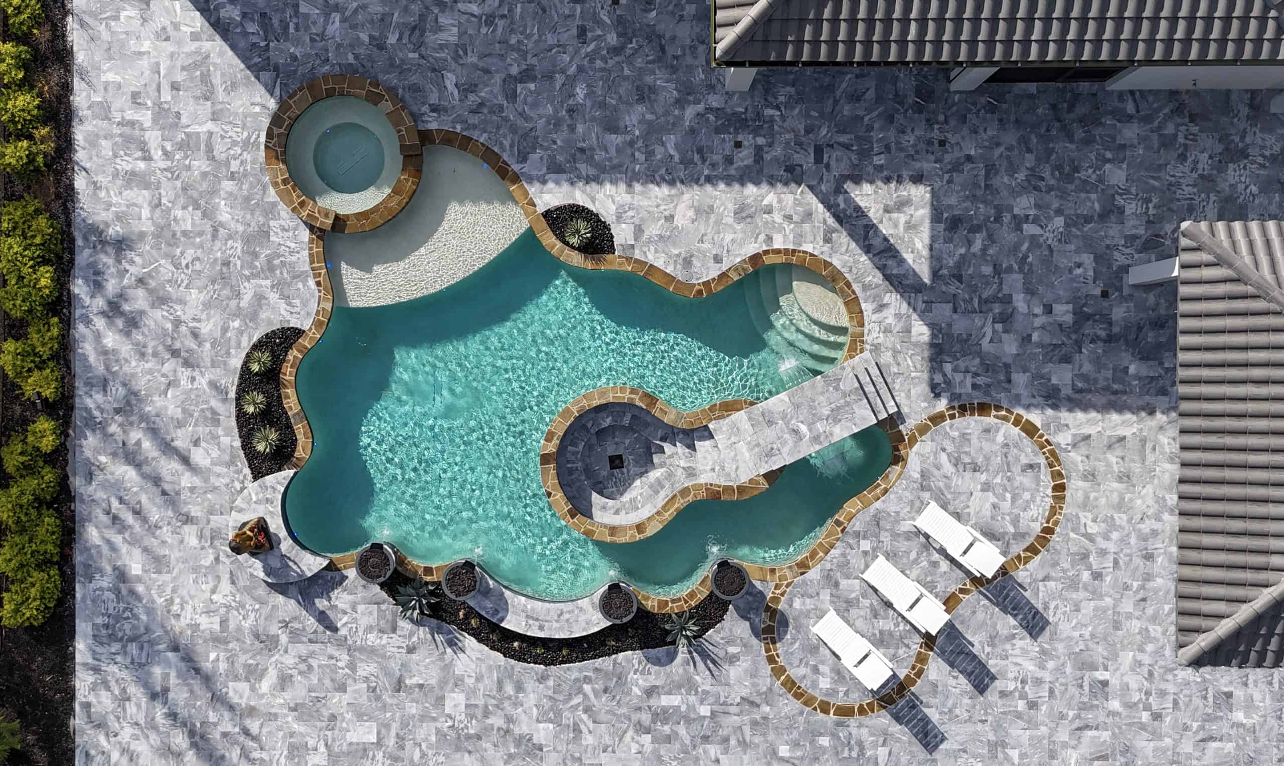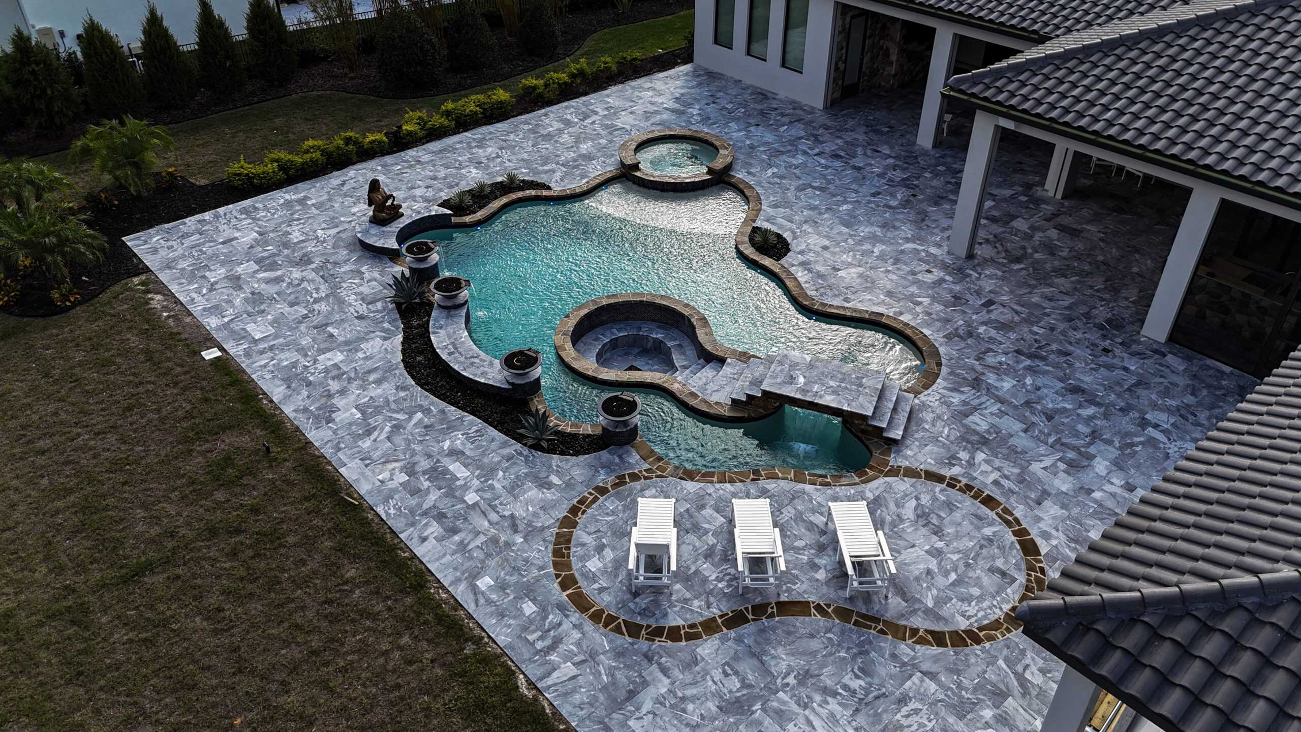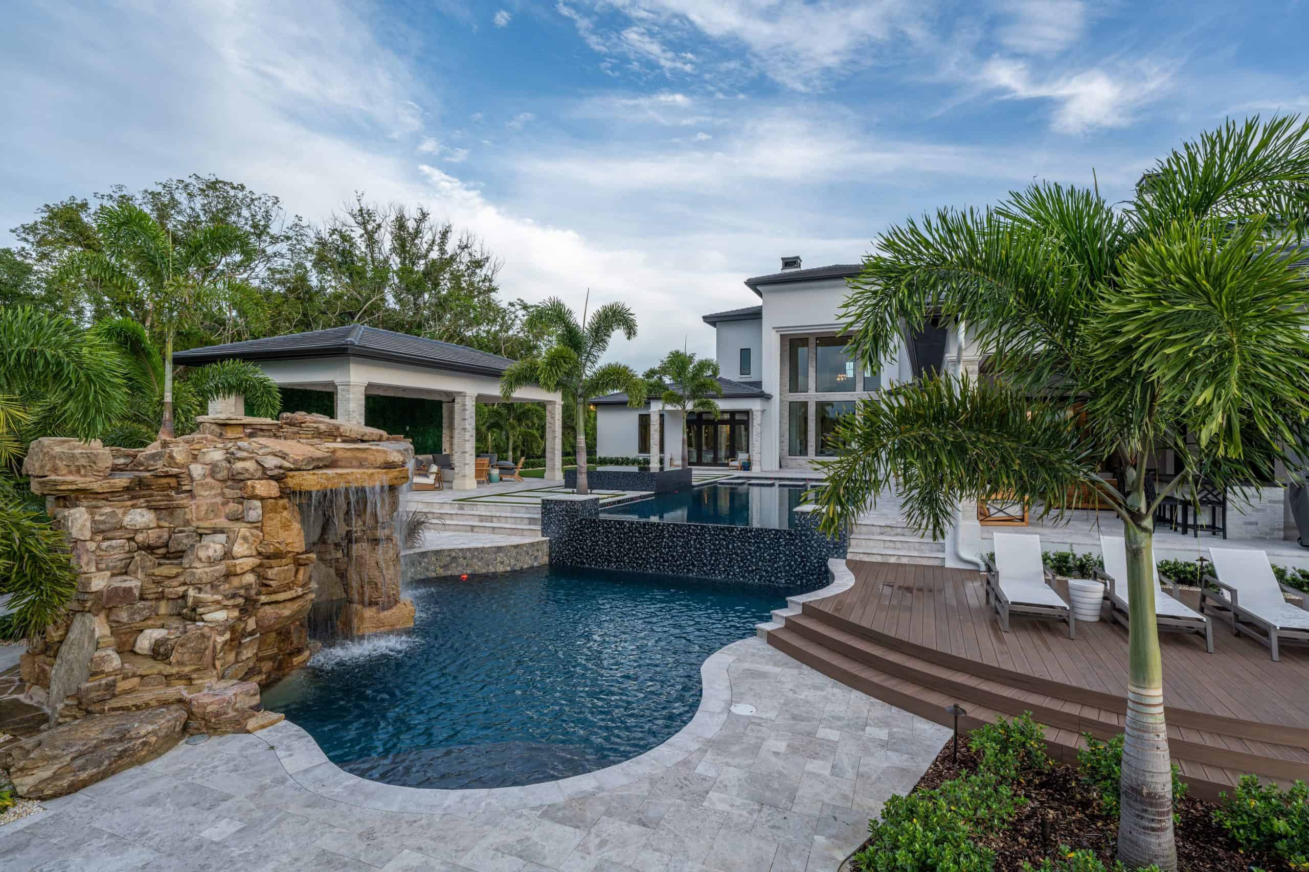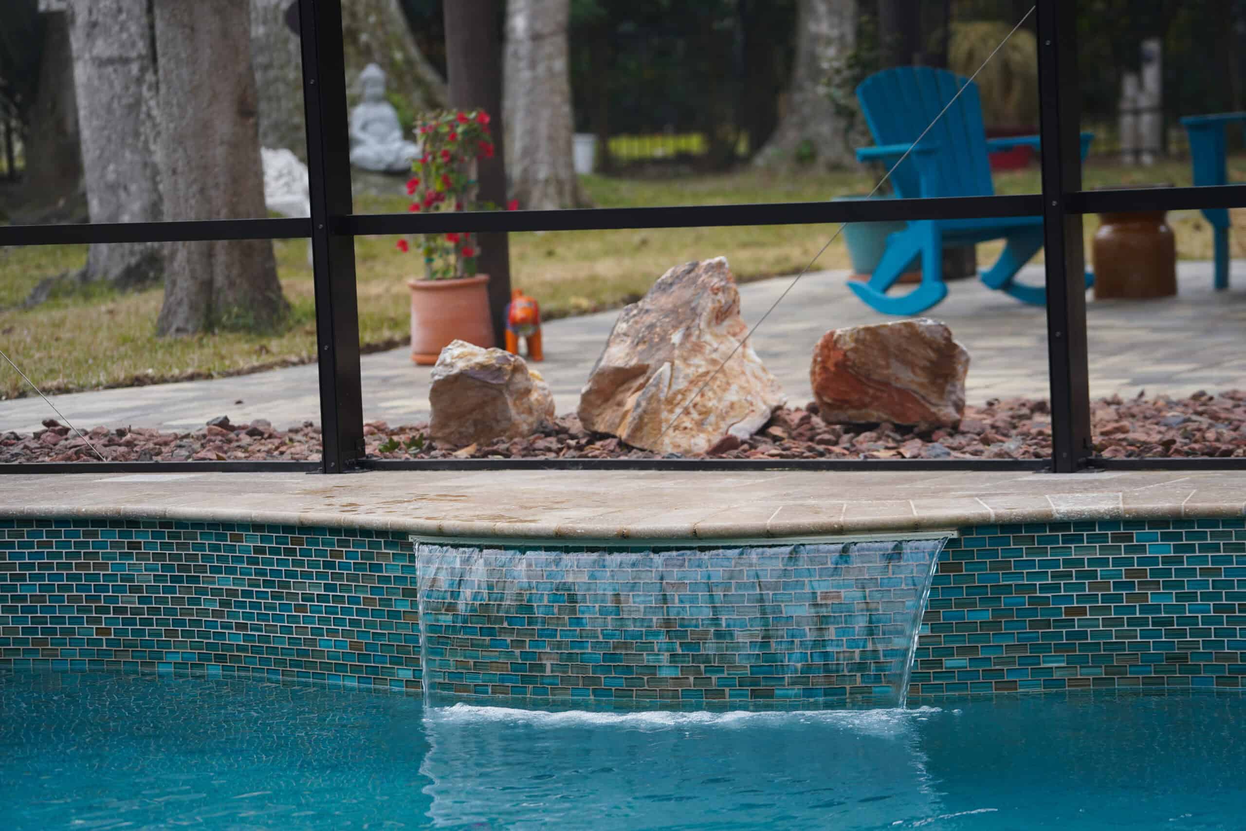 Custom-built luxury pool in Florida featuring a natural rock waterfall, elevated spa, and infinity-edge design.