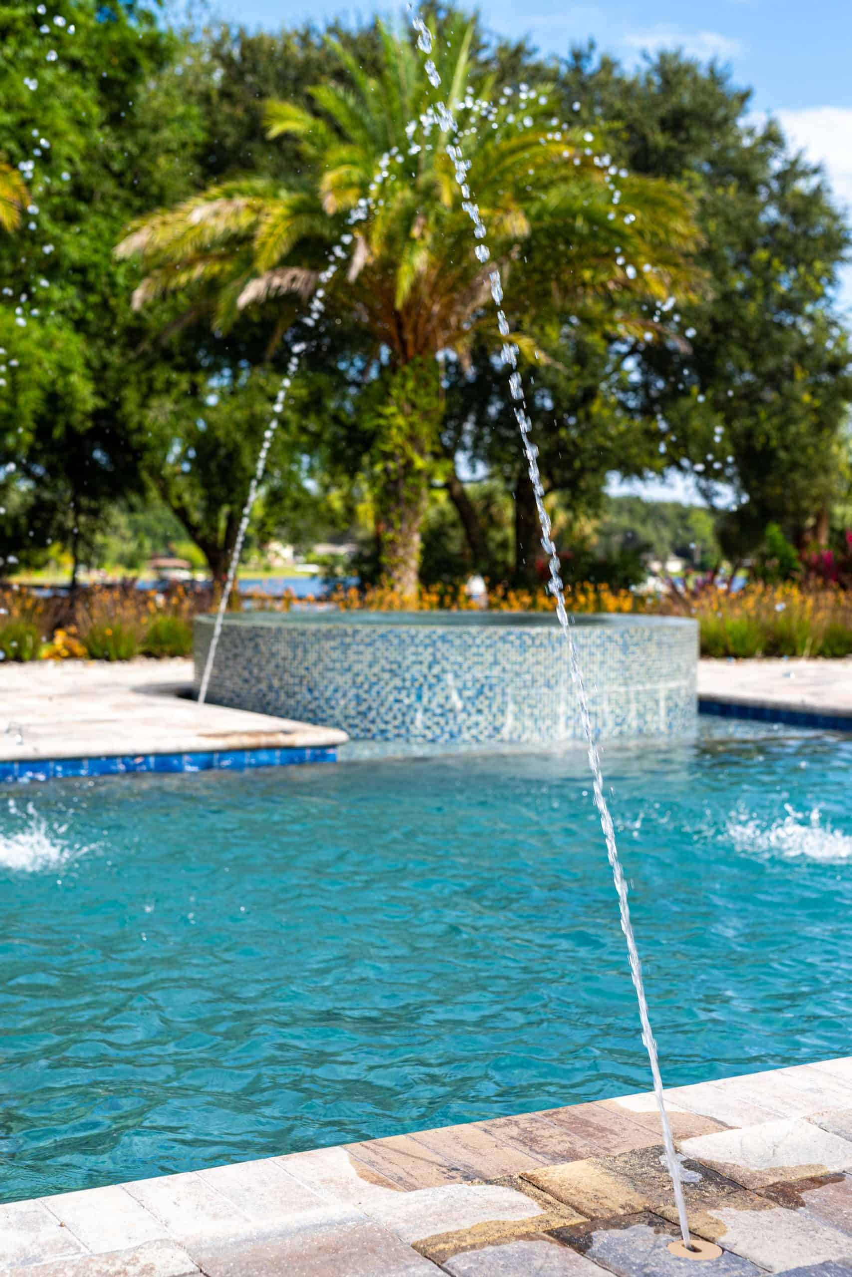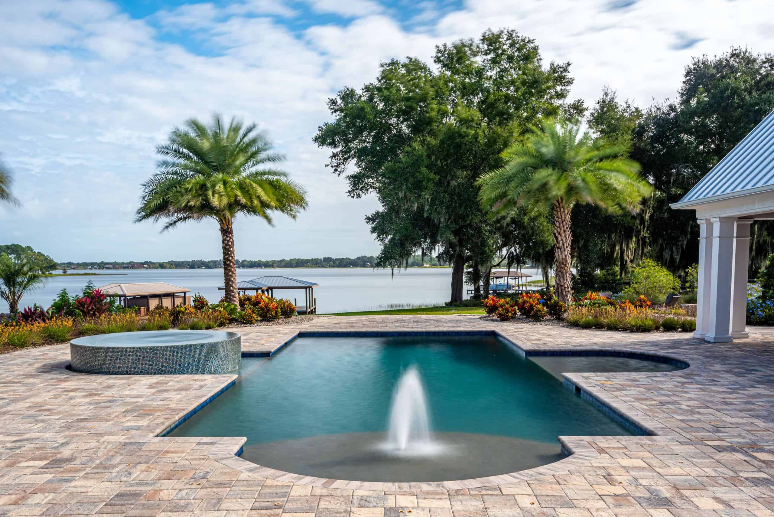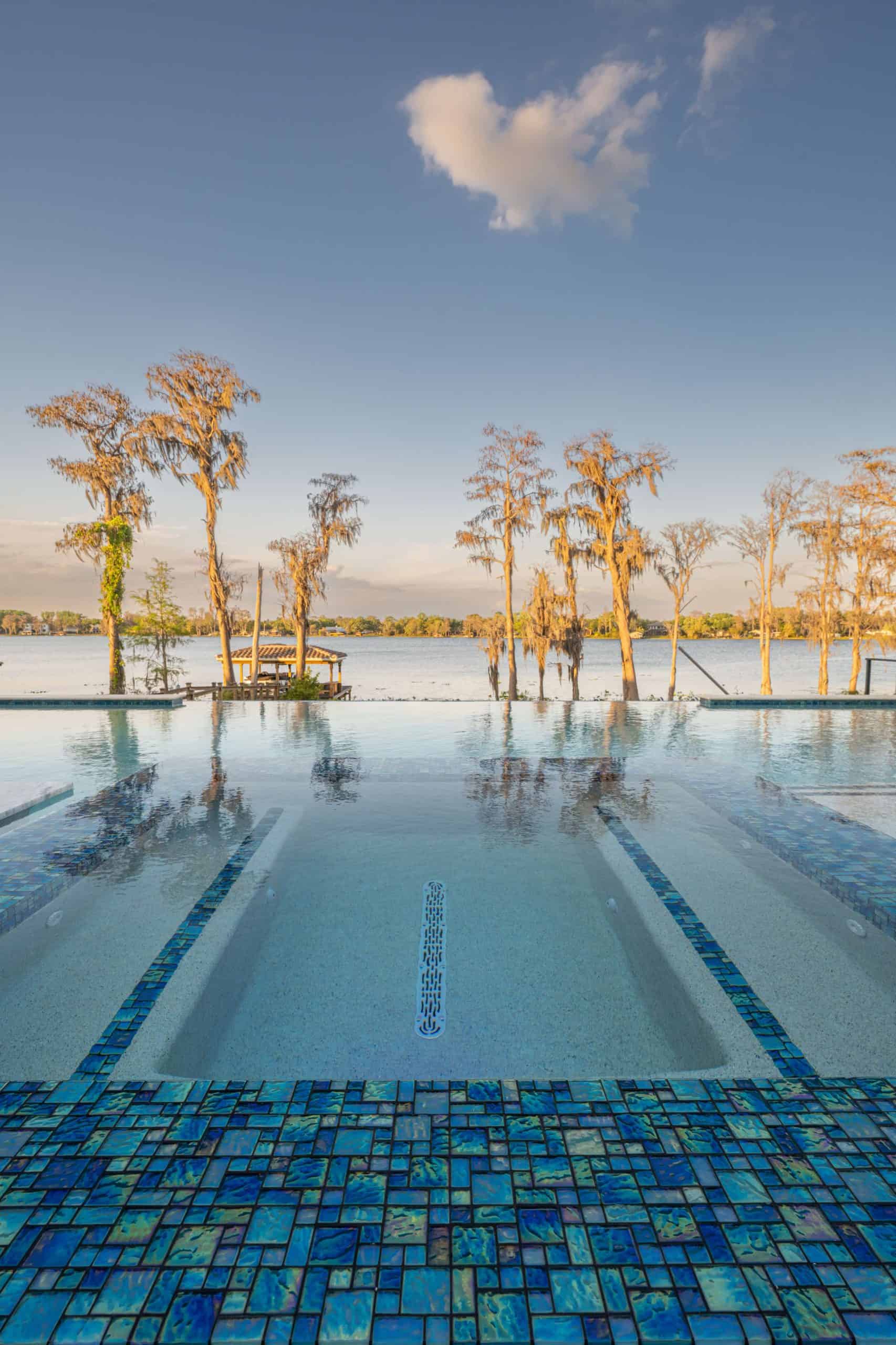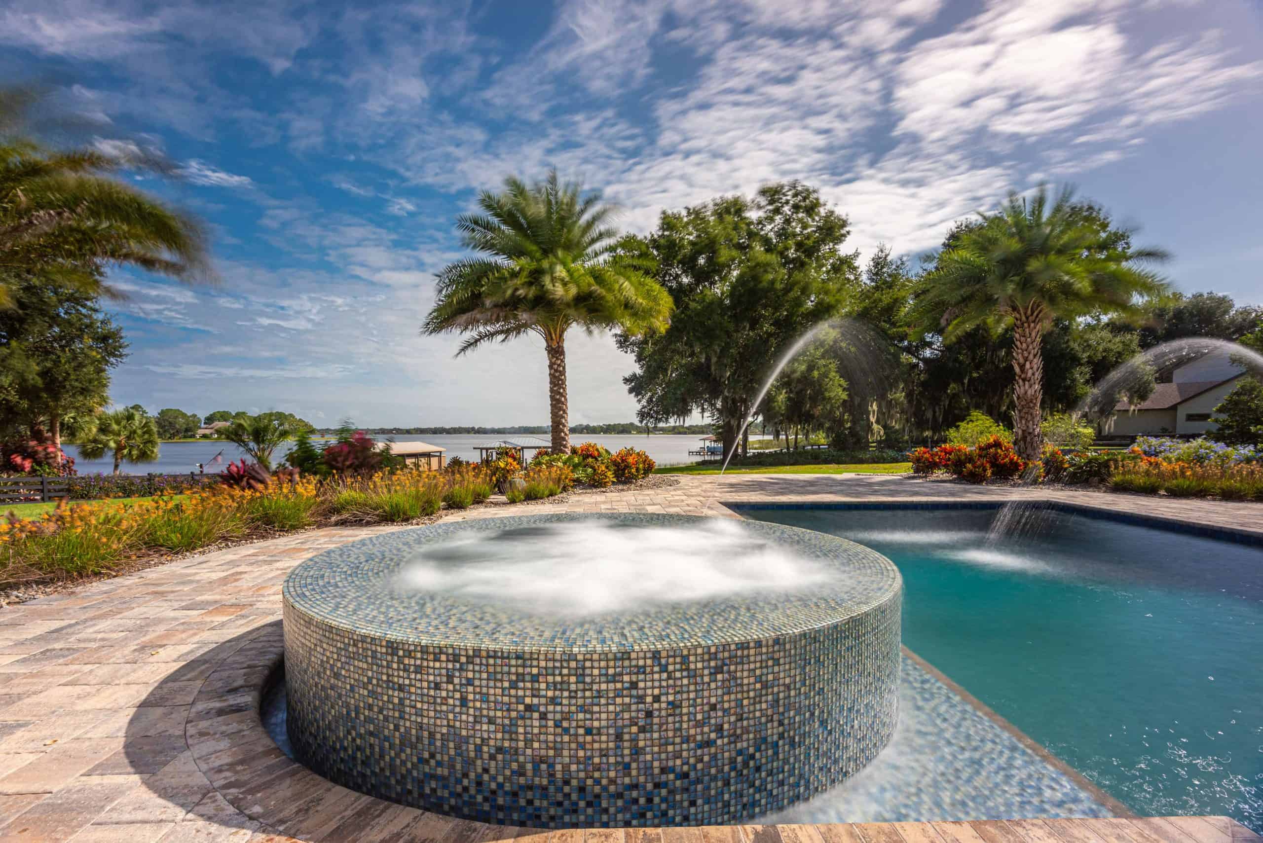 Custom pool with lake views, raised spa with mosaic tile, and bubbler feature for a resort-style outdoor living space.
