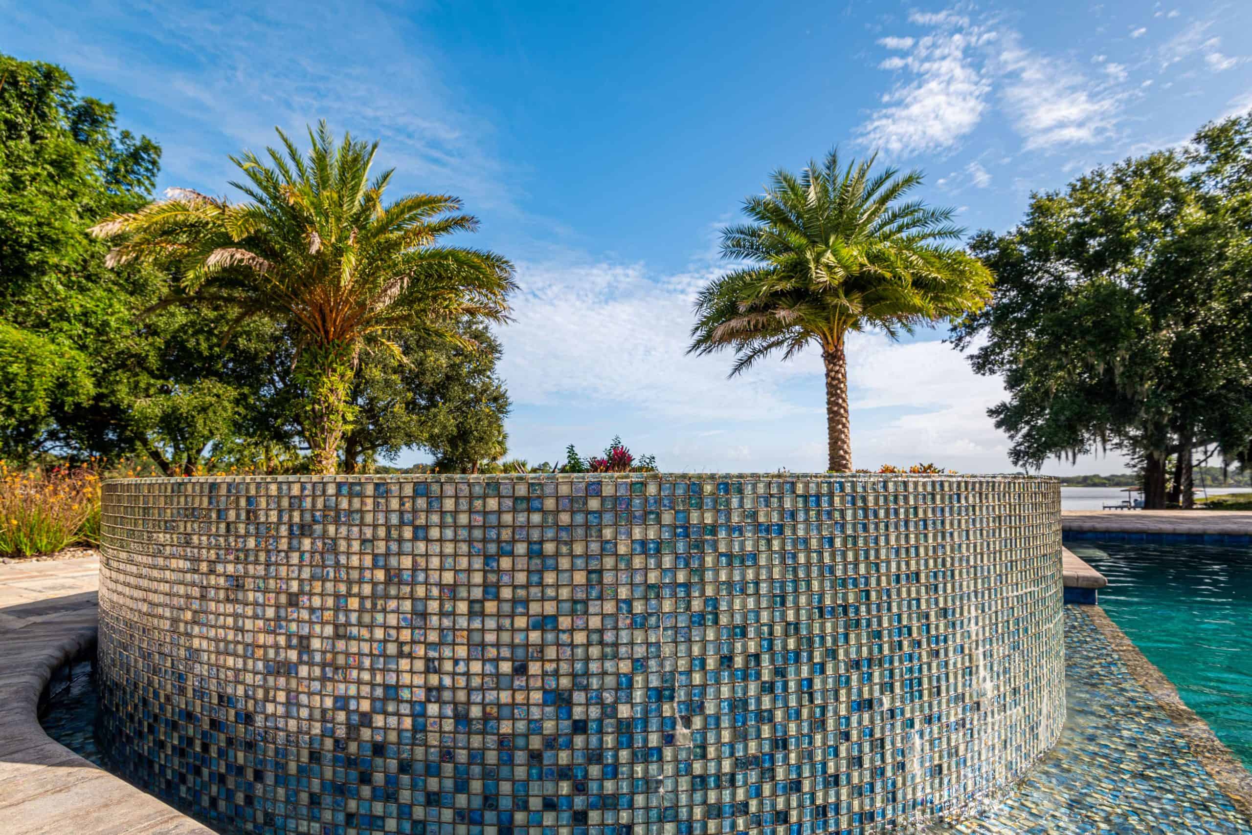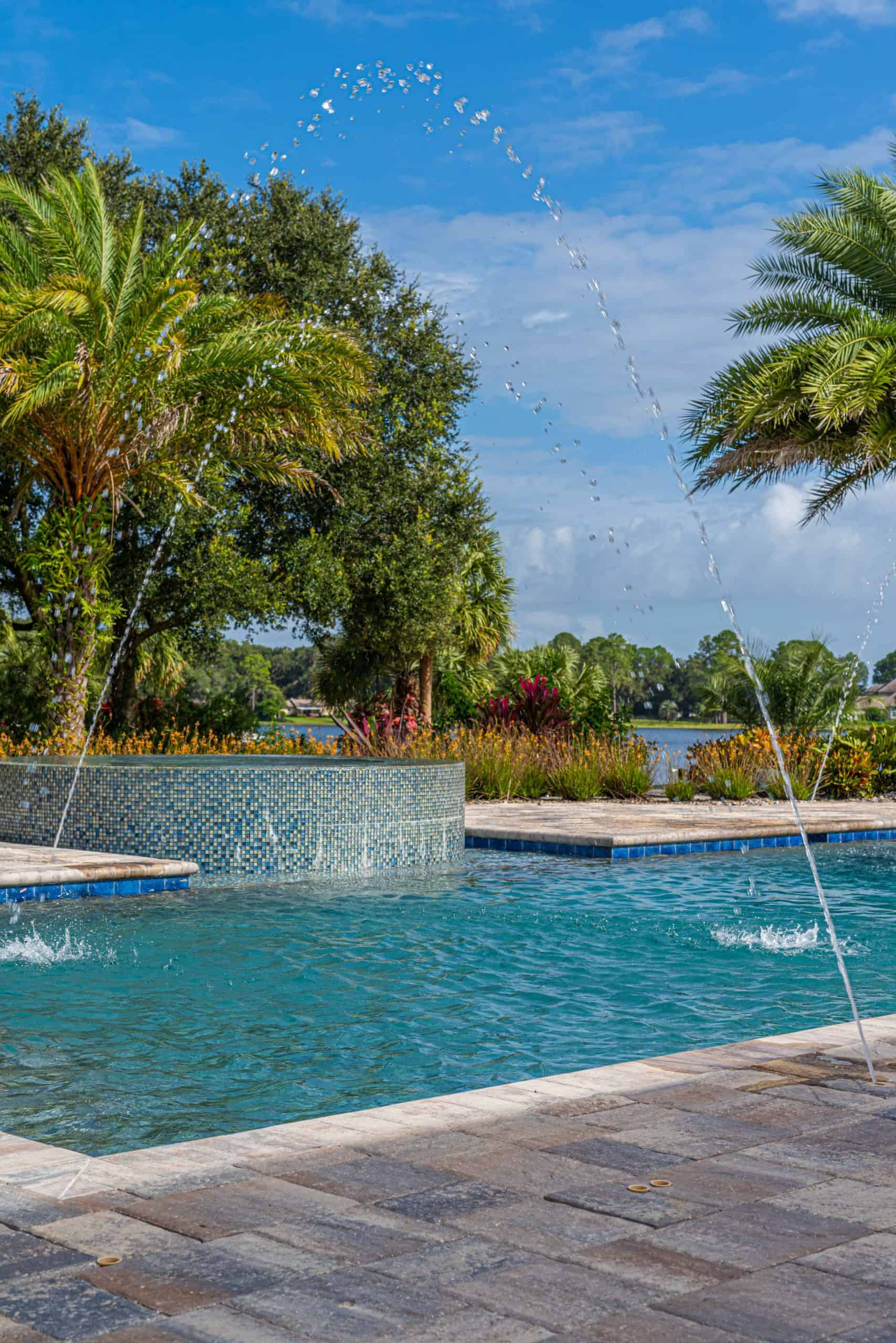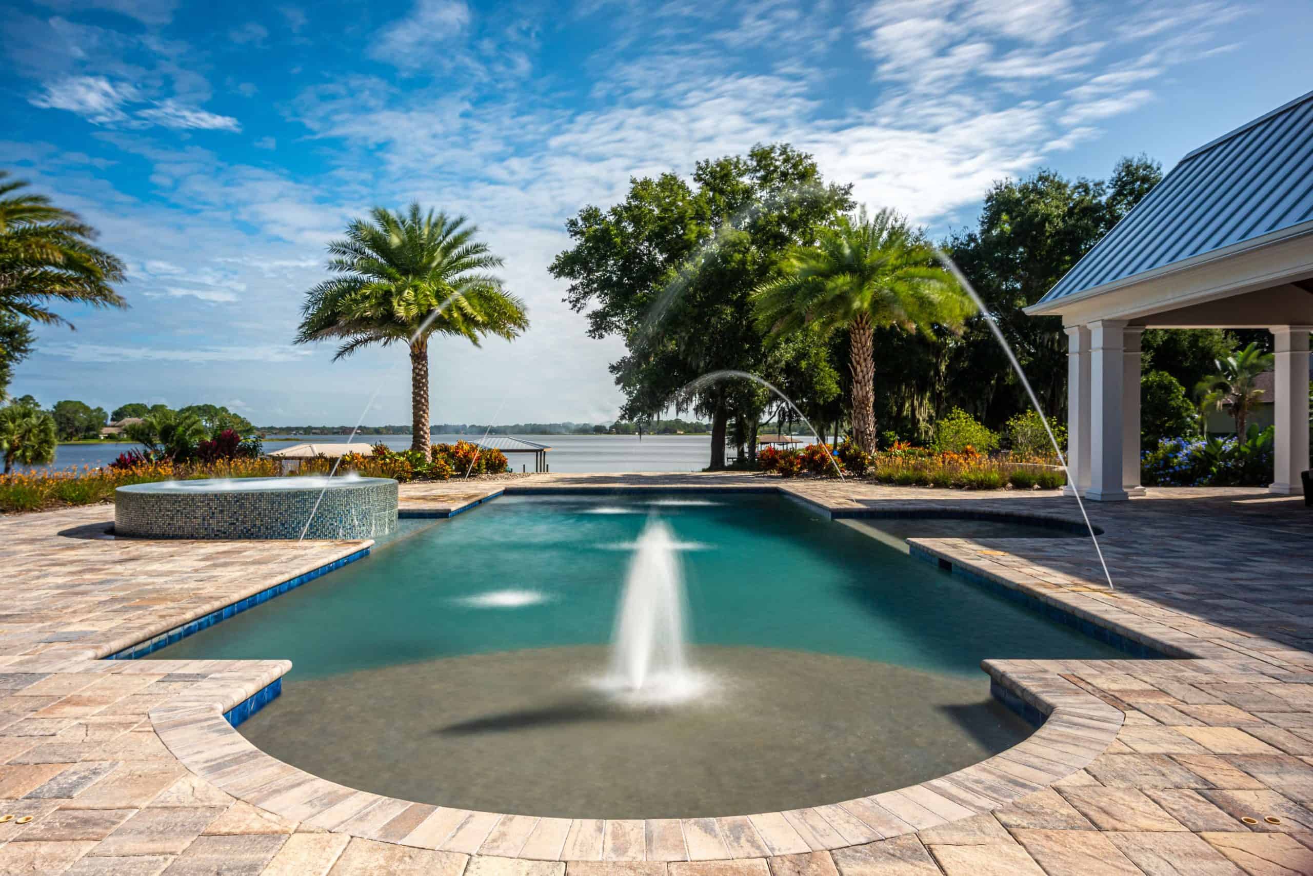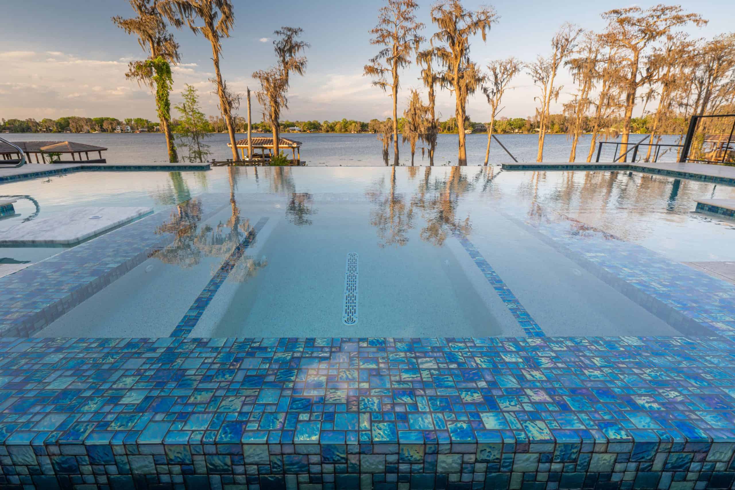 Custom pool with lake views, raised spa with mosaic tile, and bubbler feature for a resort-style outdoor living space.