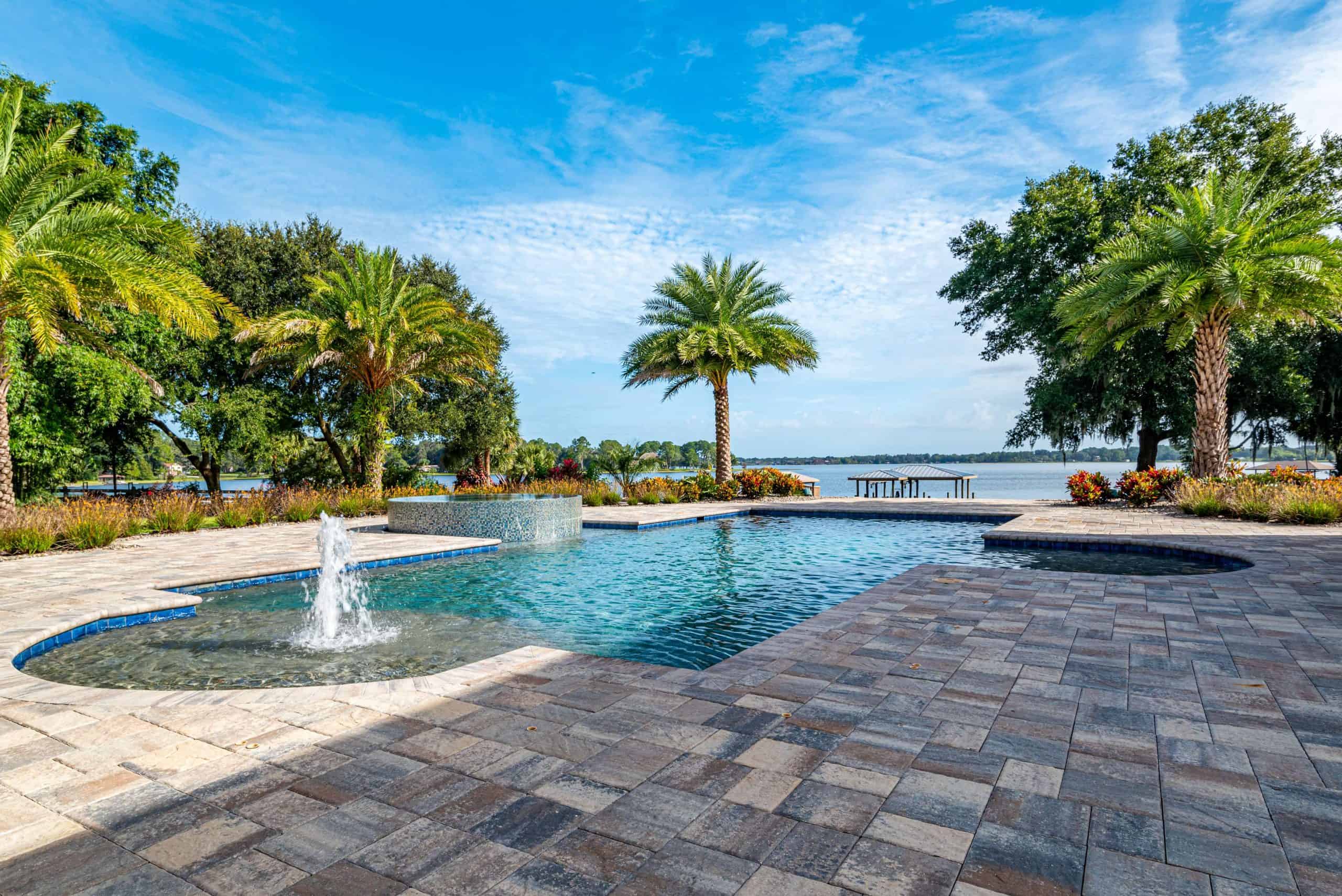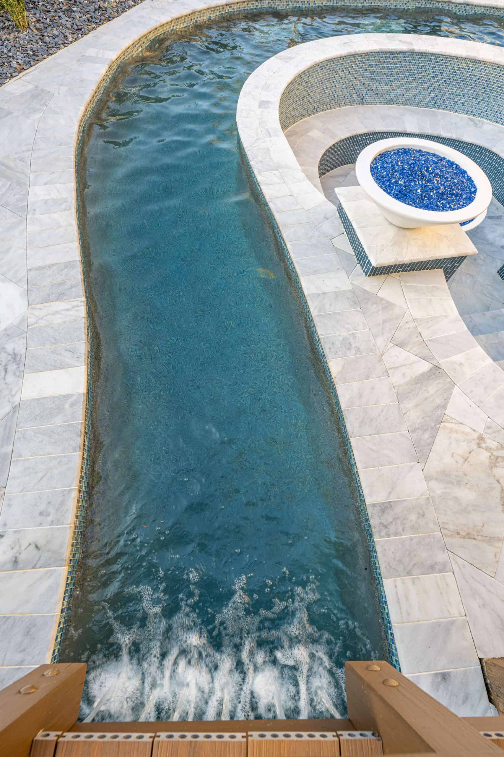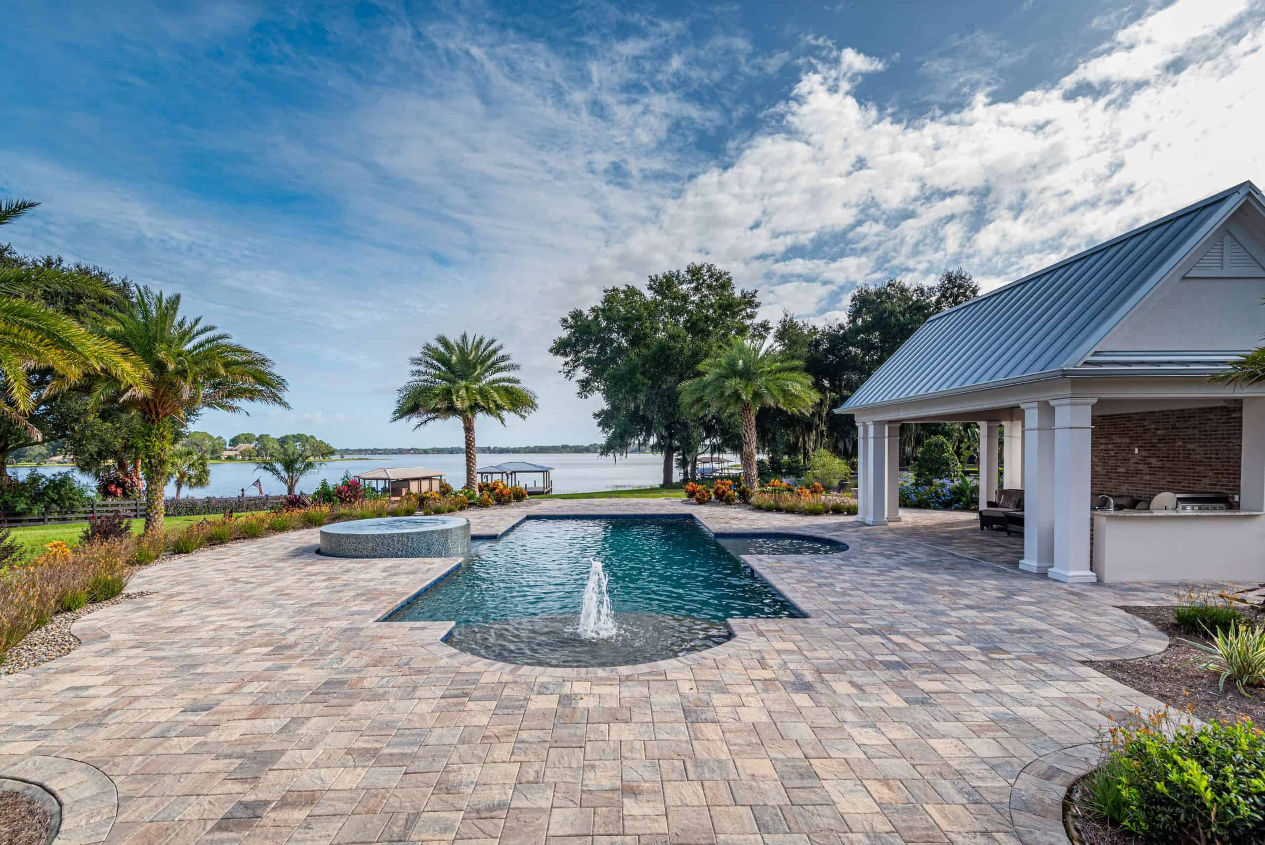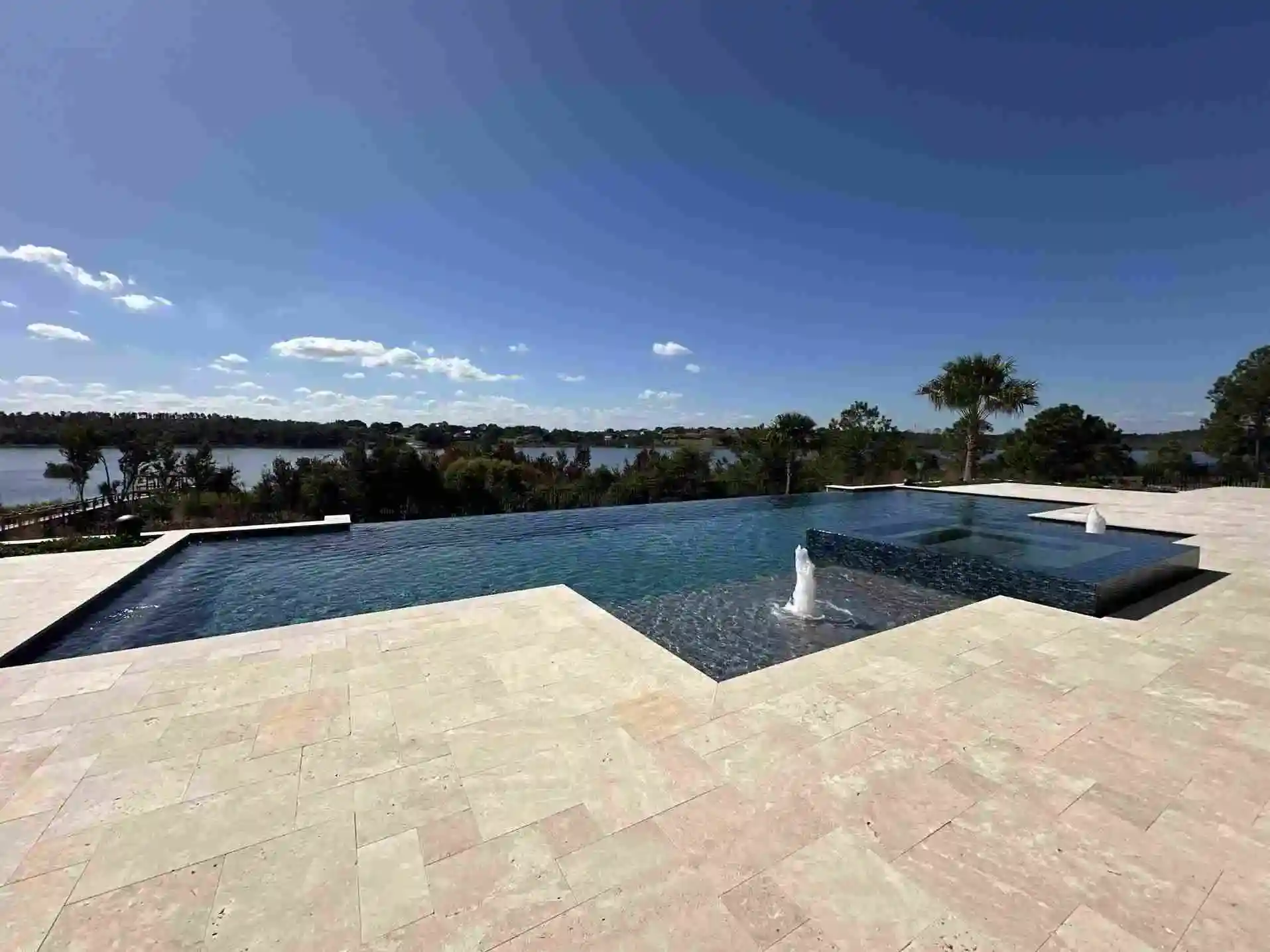 Custom pool with lake views, raised spa with mosaic tile, and bubbler feature for a resort-style outdoor living space.