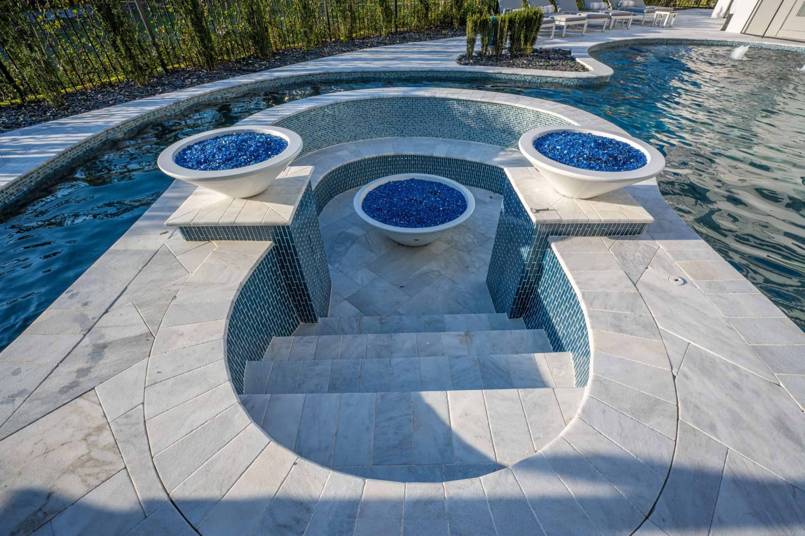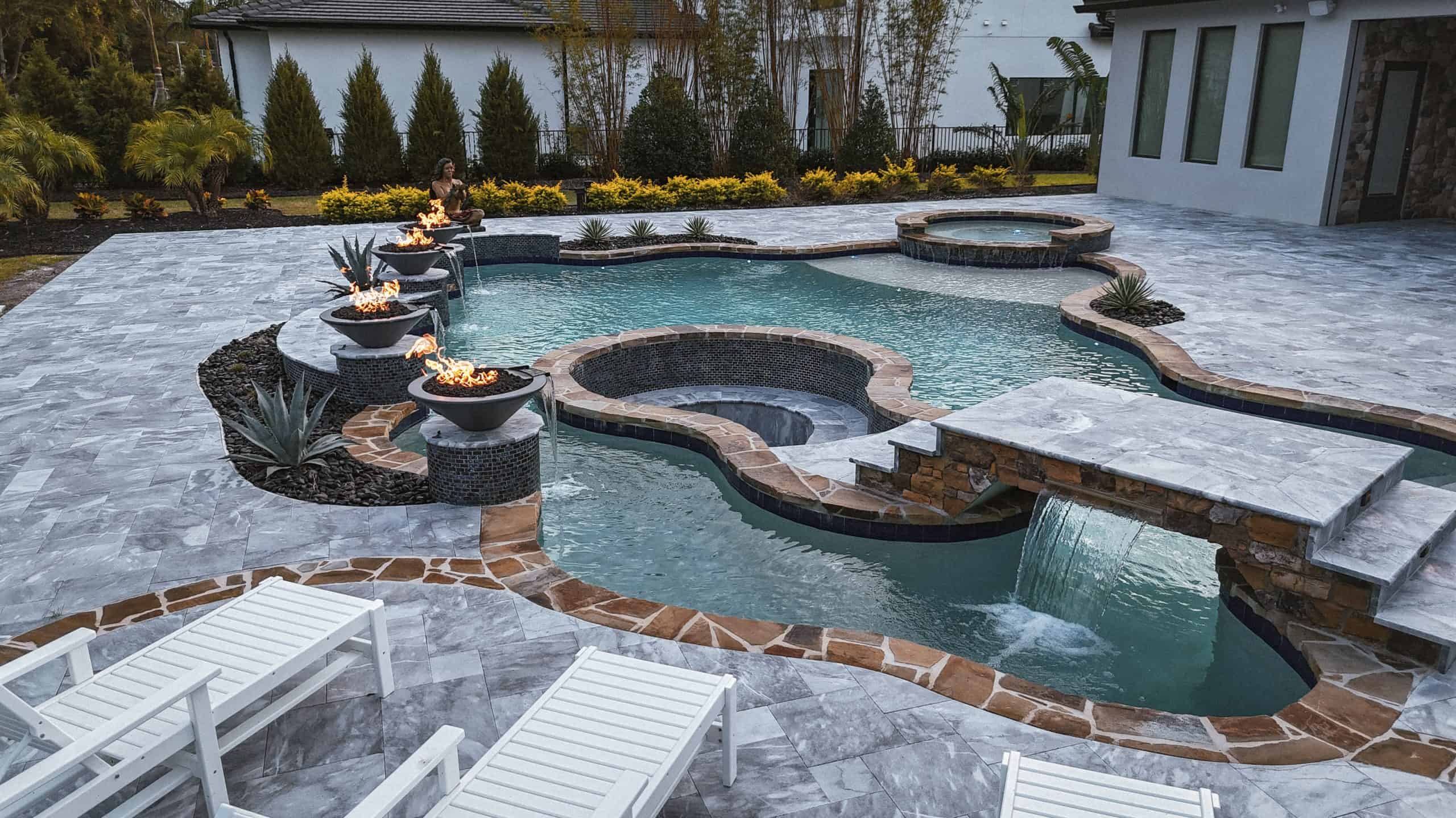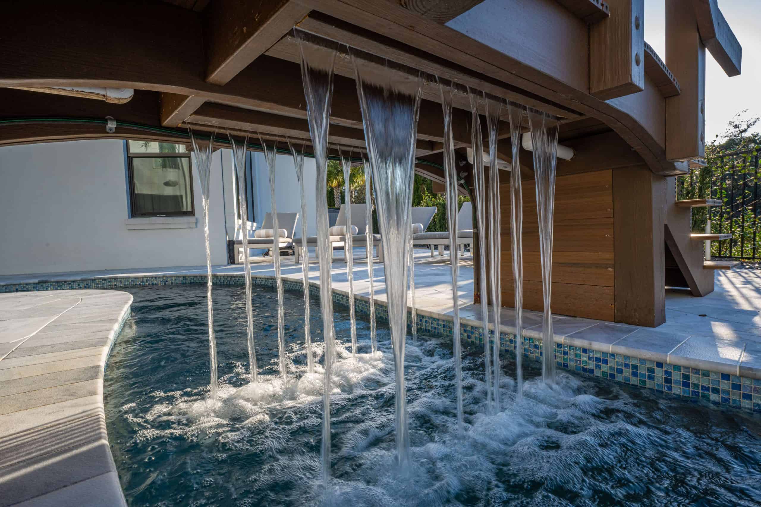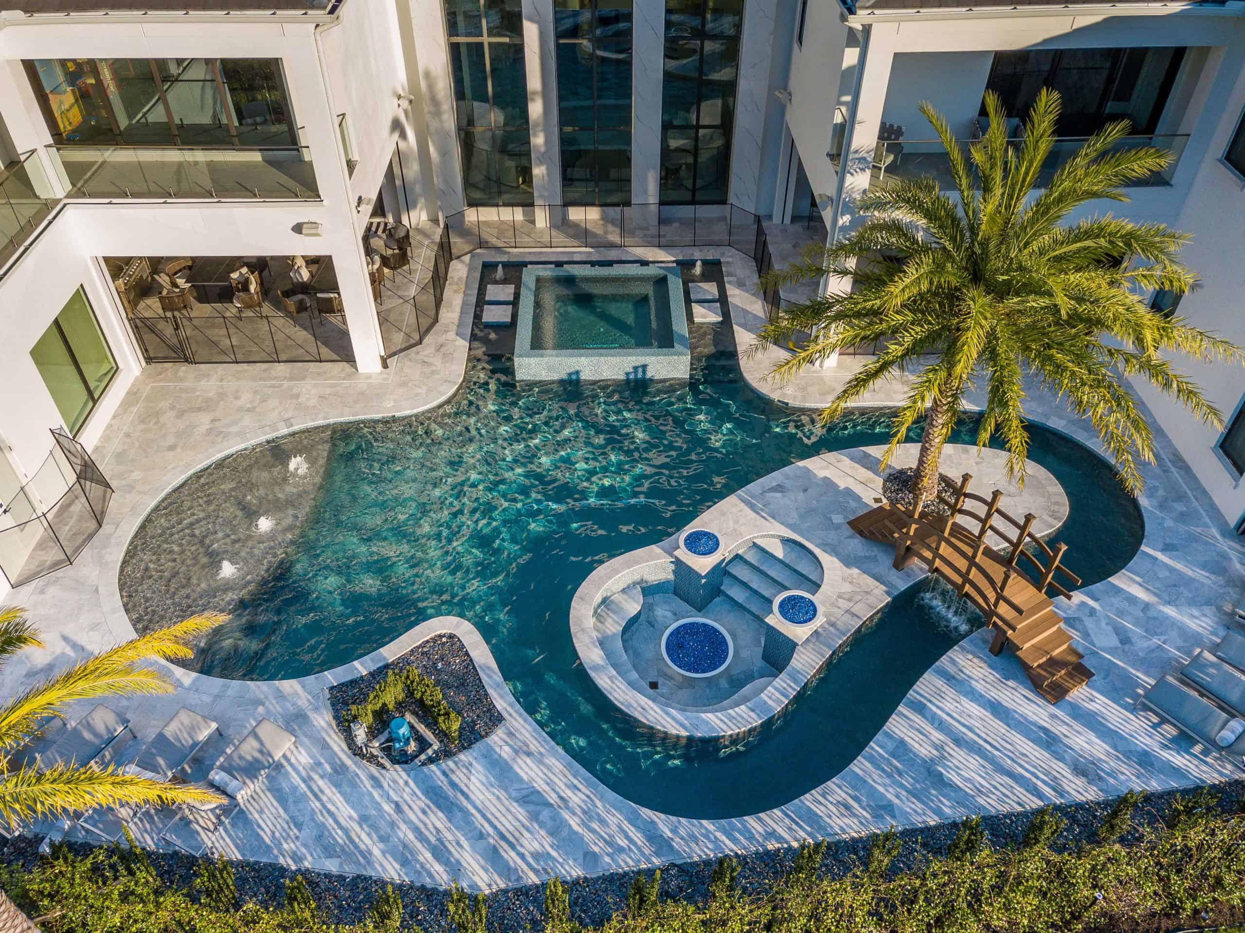 Custom Florida pool featuring a sunken seating area, raised water bowls, and curved stone bridge for high-end outdoor entertaining.