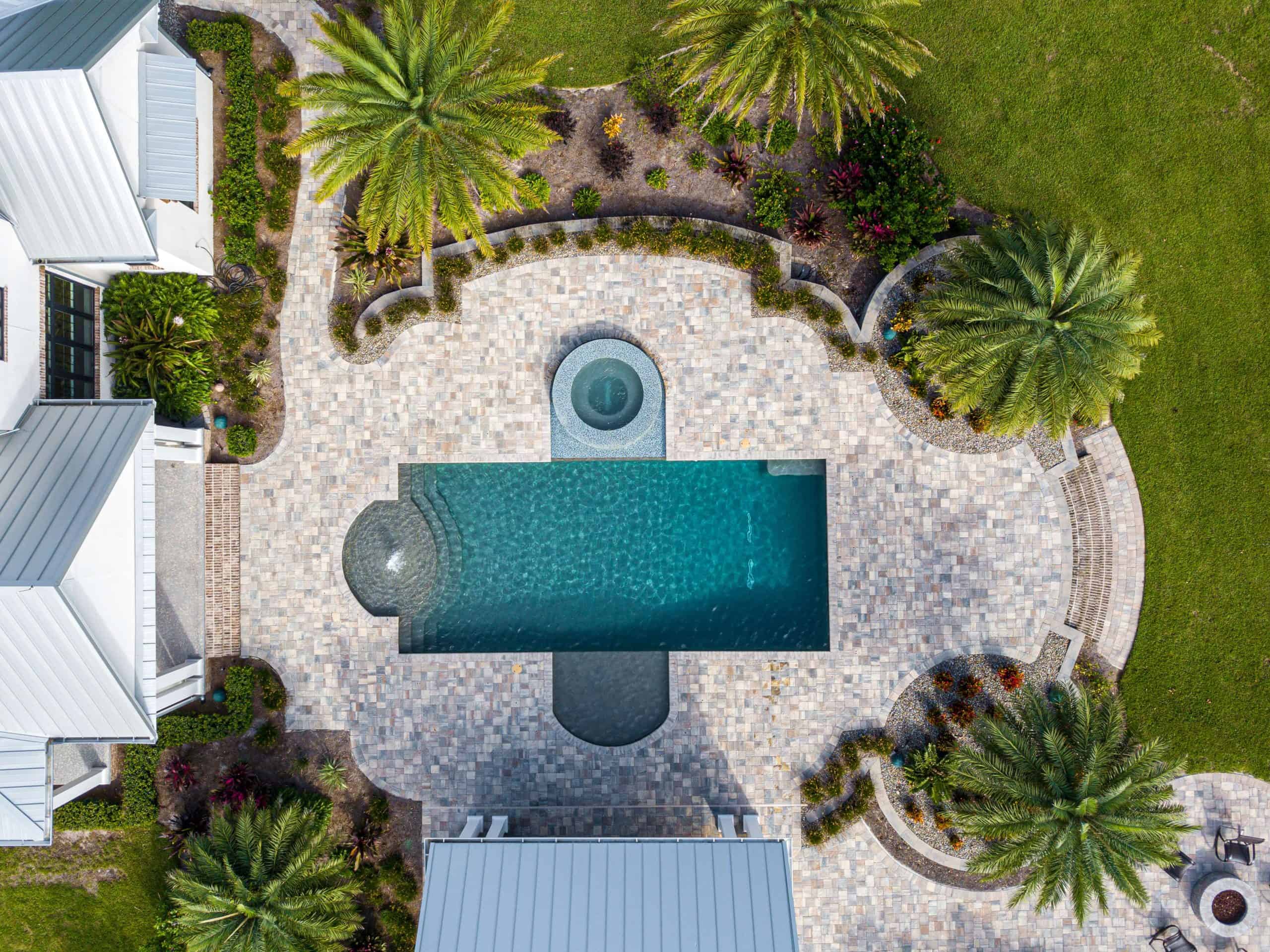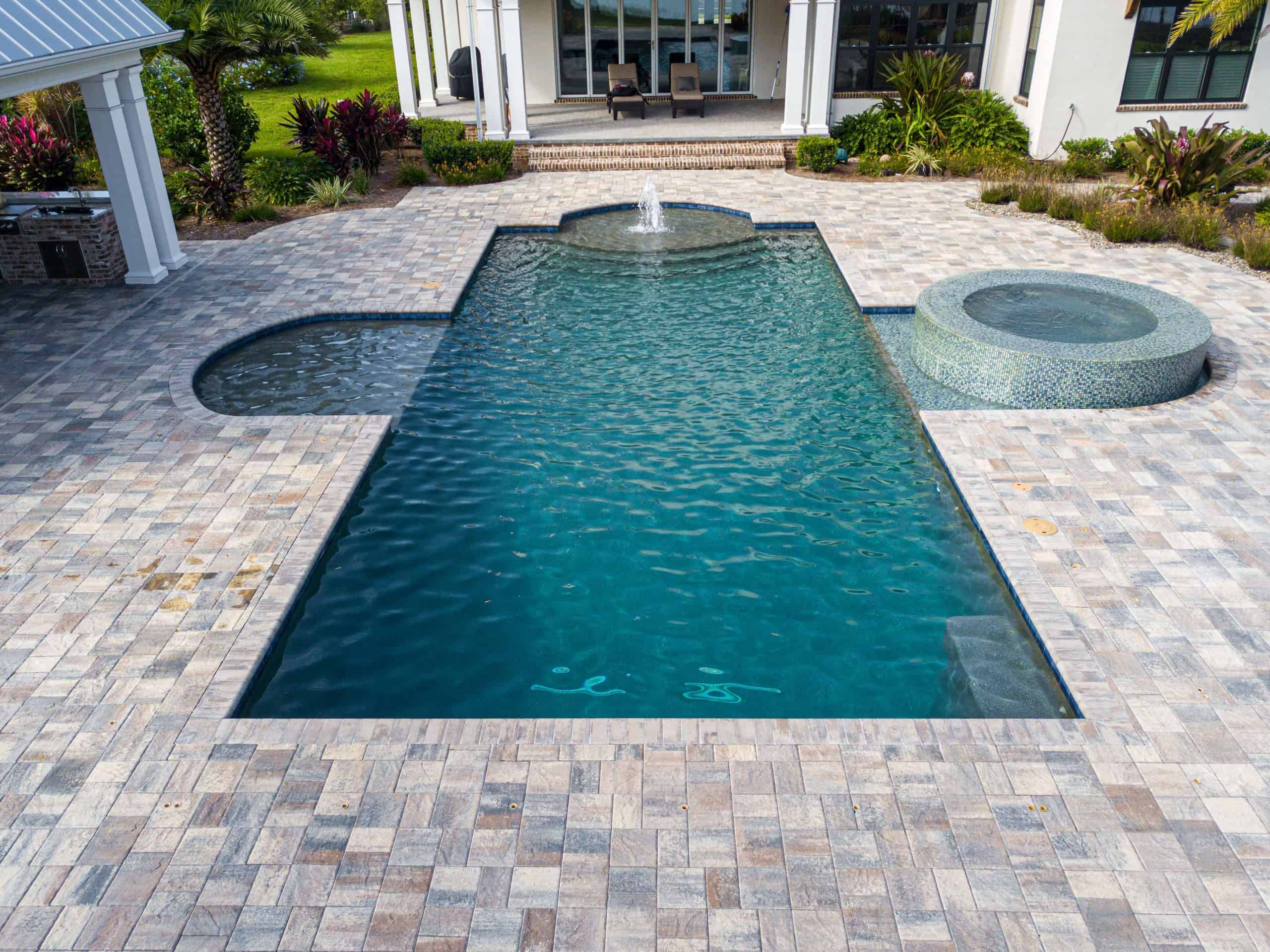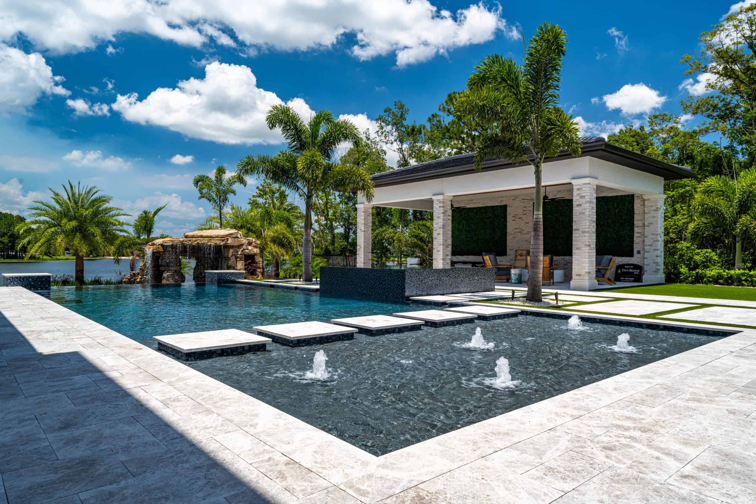 Custom Florida pool featuring a sunken seating area, raised water bowls, and curved stone bridge for high-end outdoor entertaining.