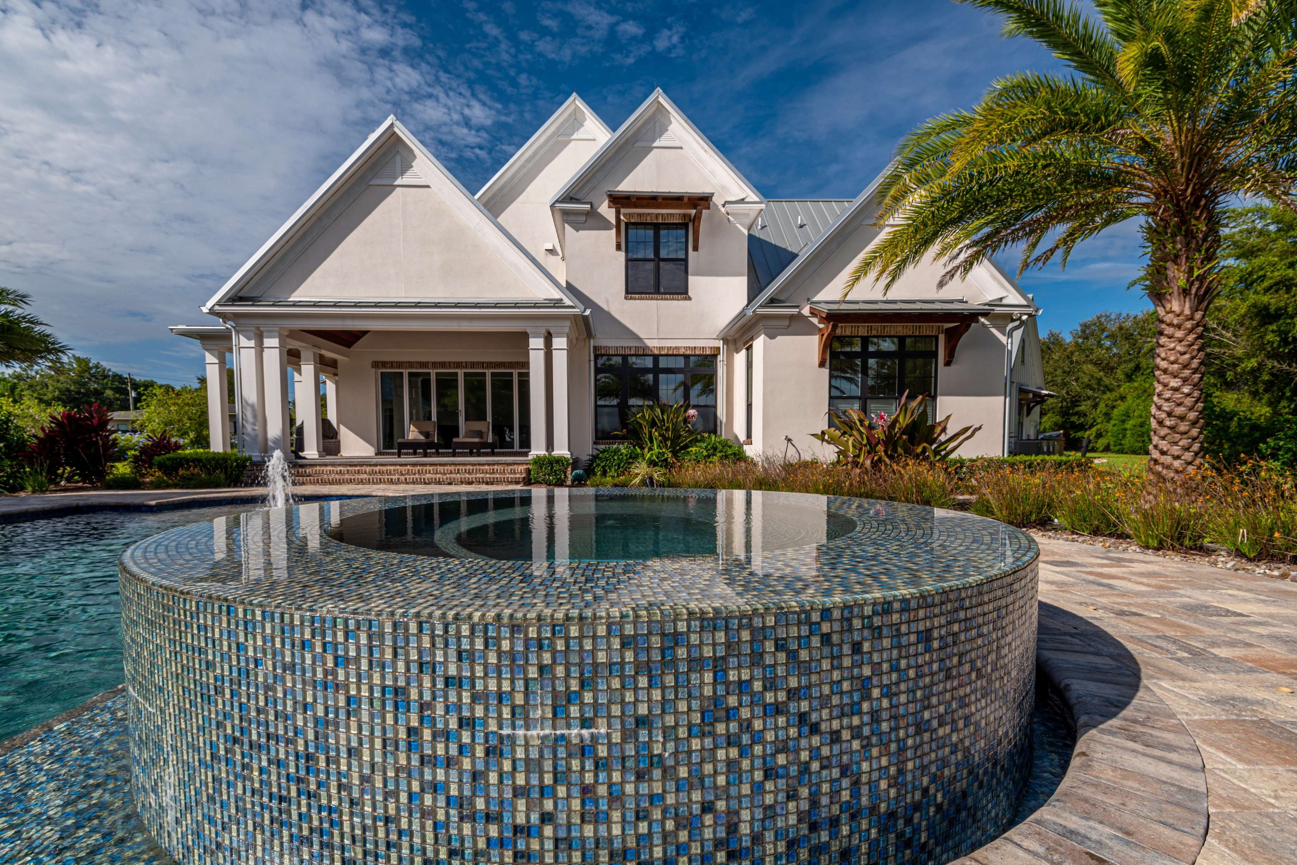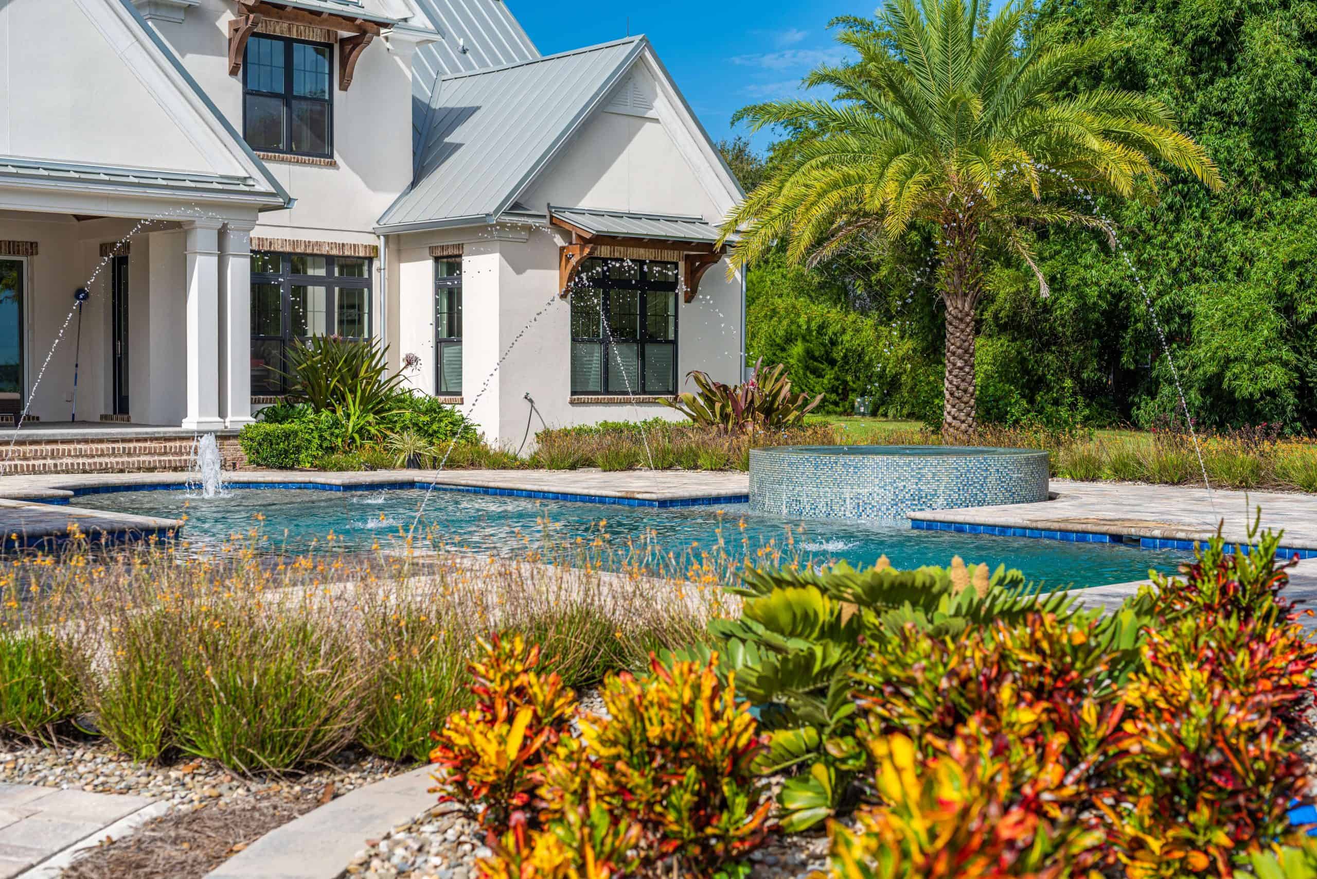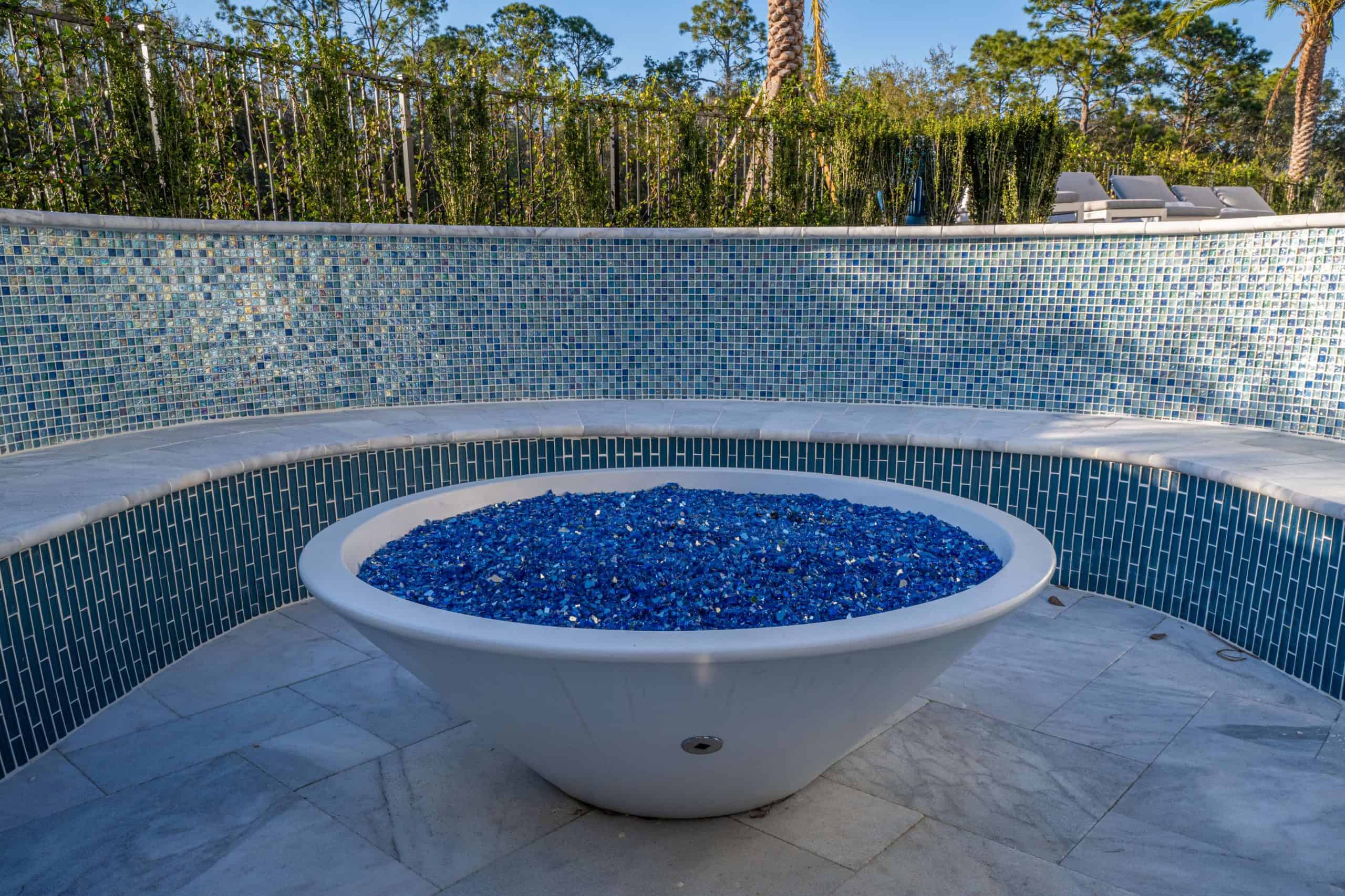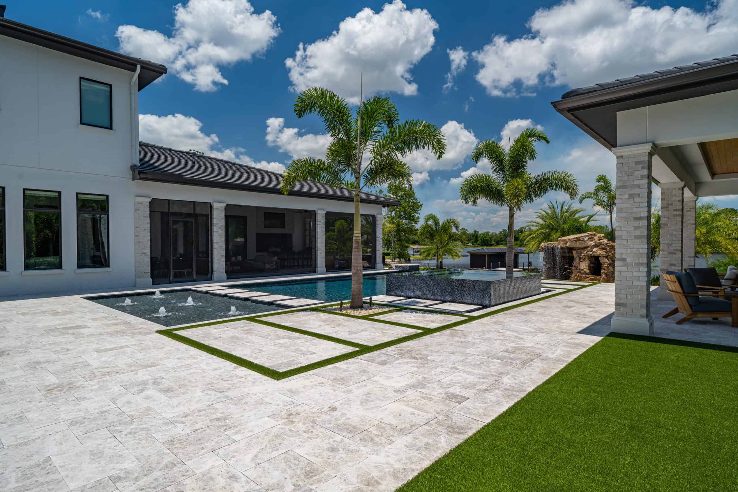 Custom Florida pool featuring a sunken seating area, raised water bowls, and curved stone bridge for high-end outdoor entertaining.