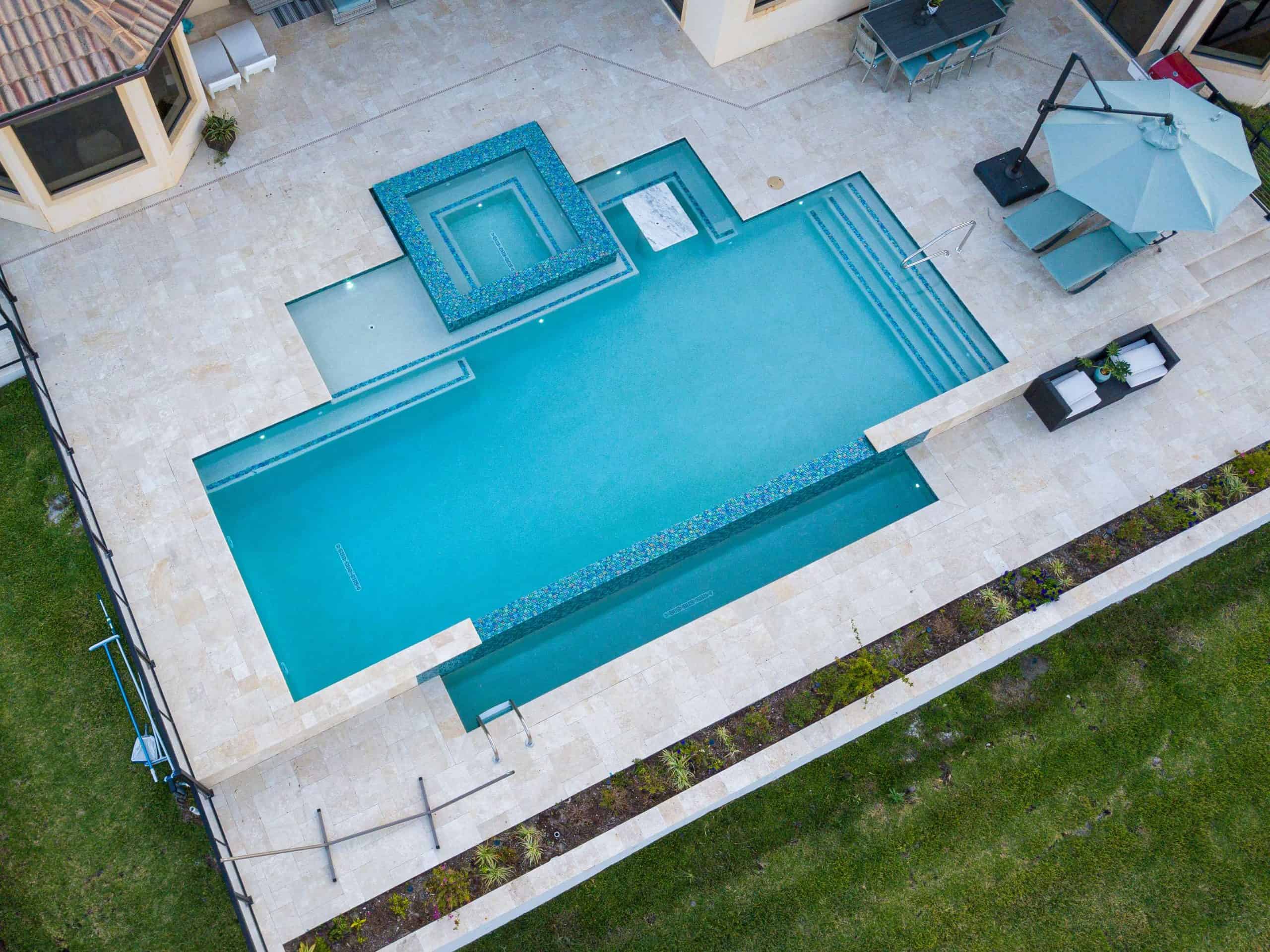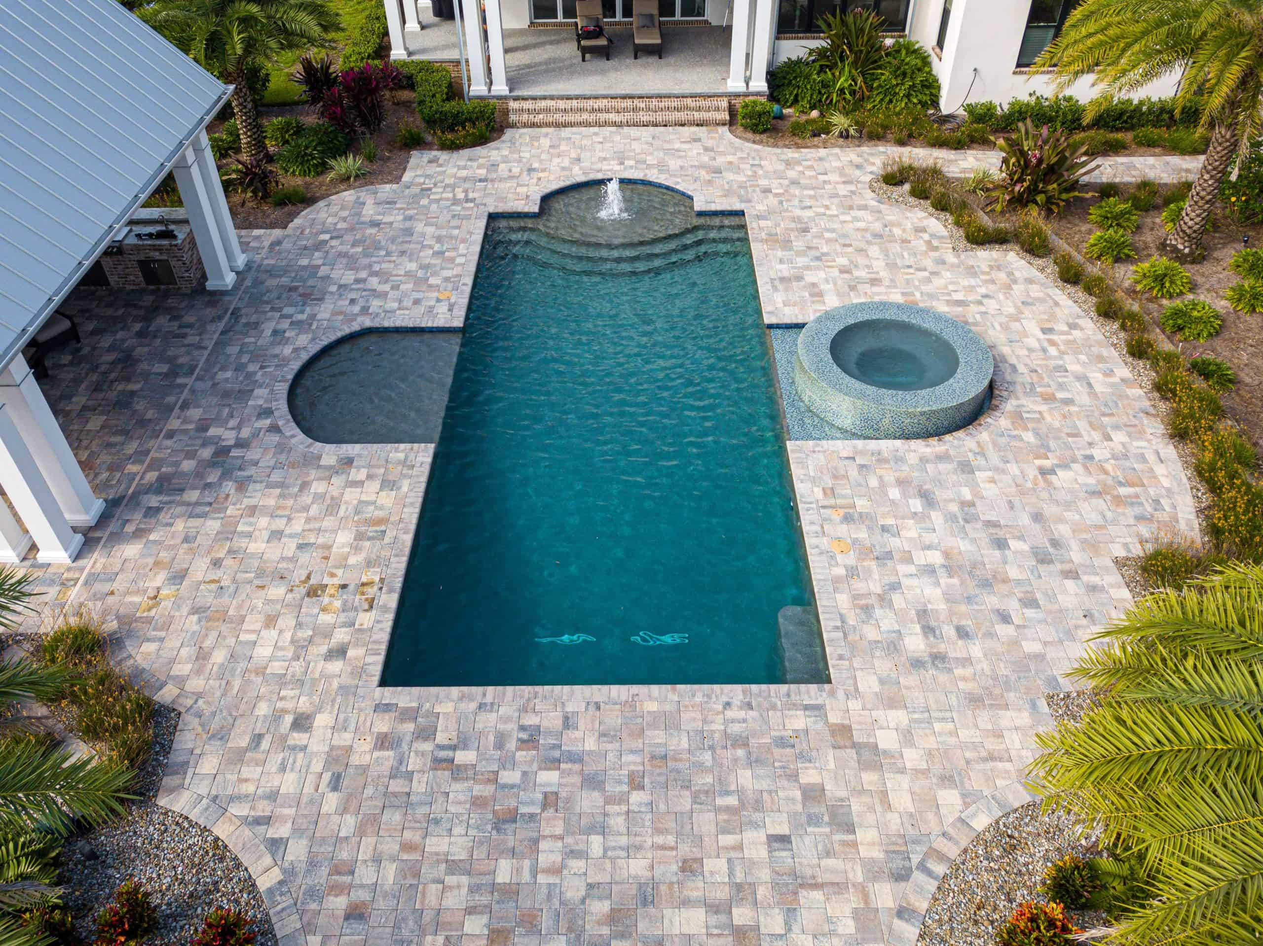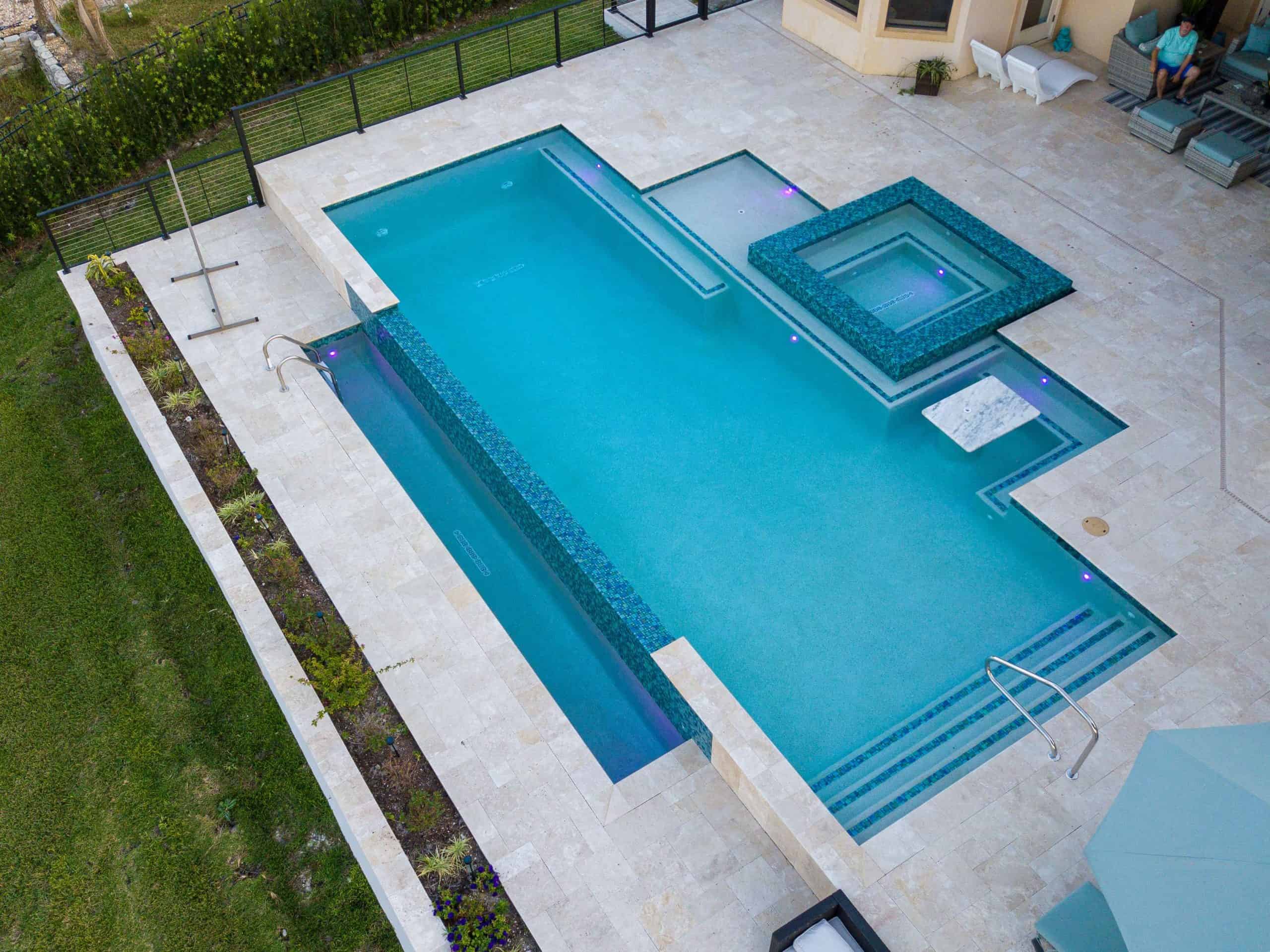 Modern Florida lap pool with integrated spa, infinity edge, and tanning ledge for sleek relaxation and exercise.