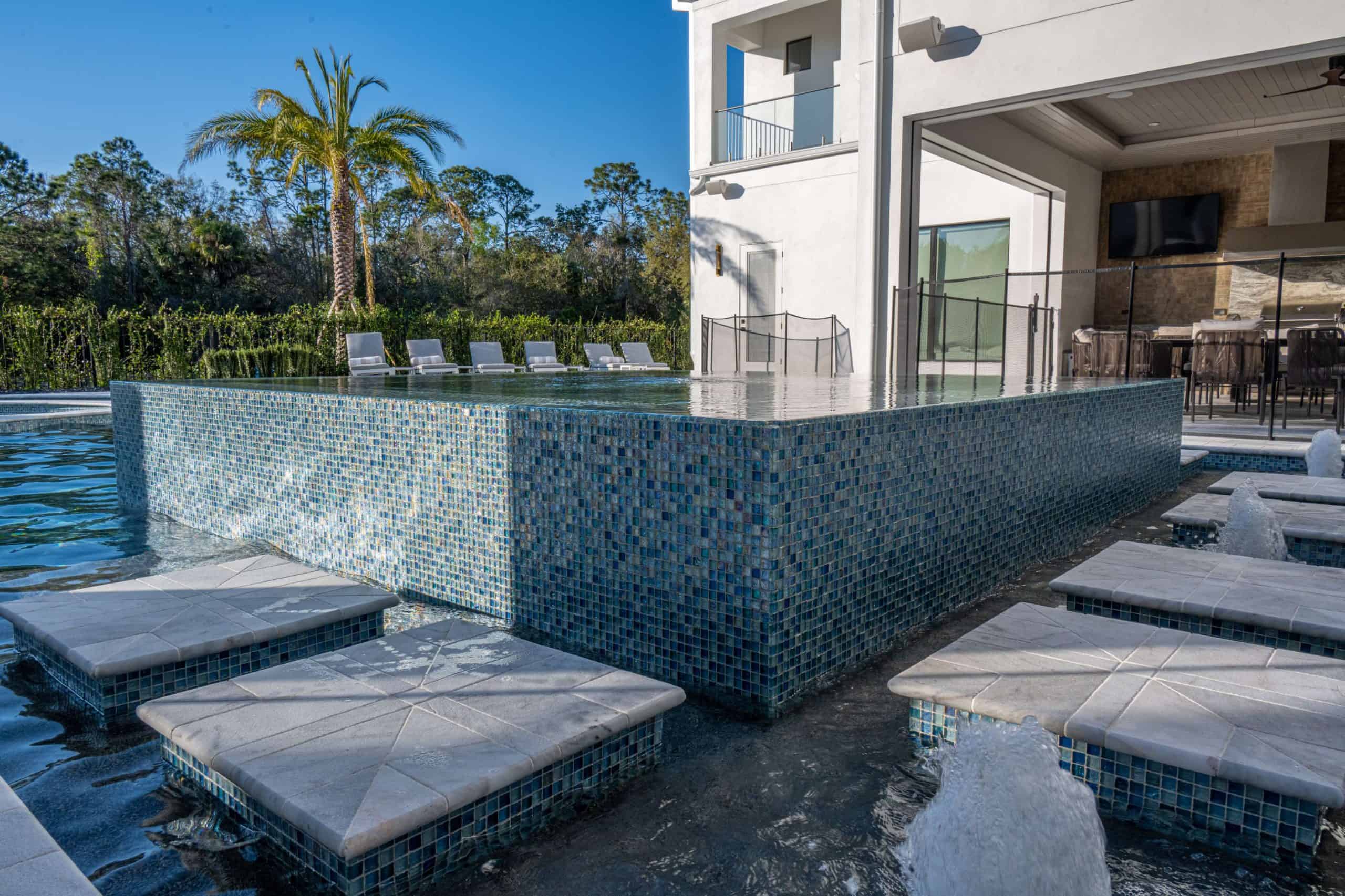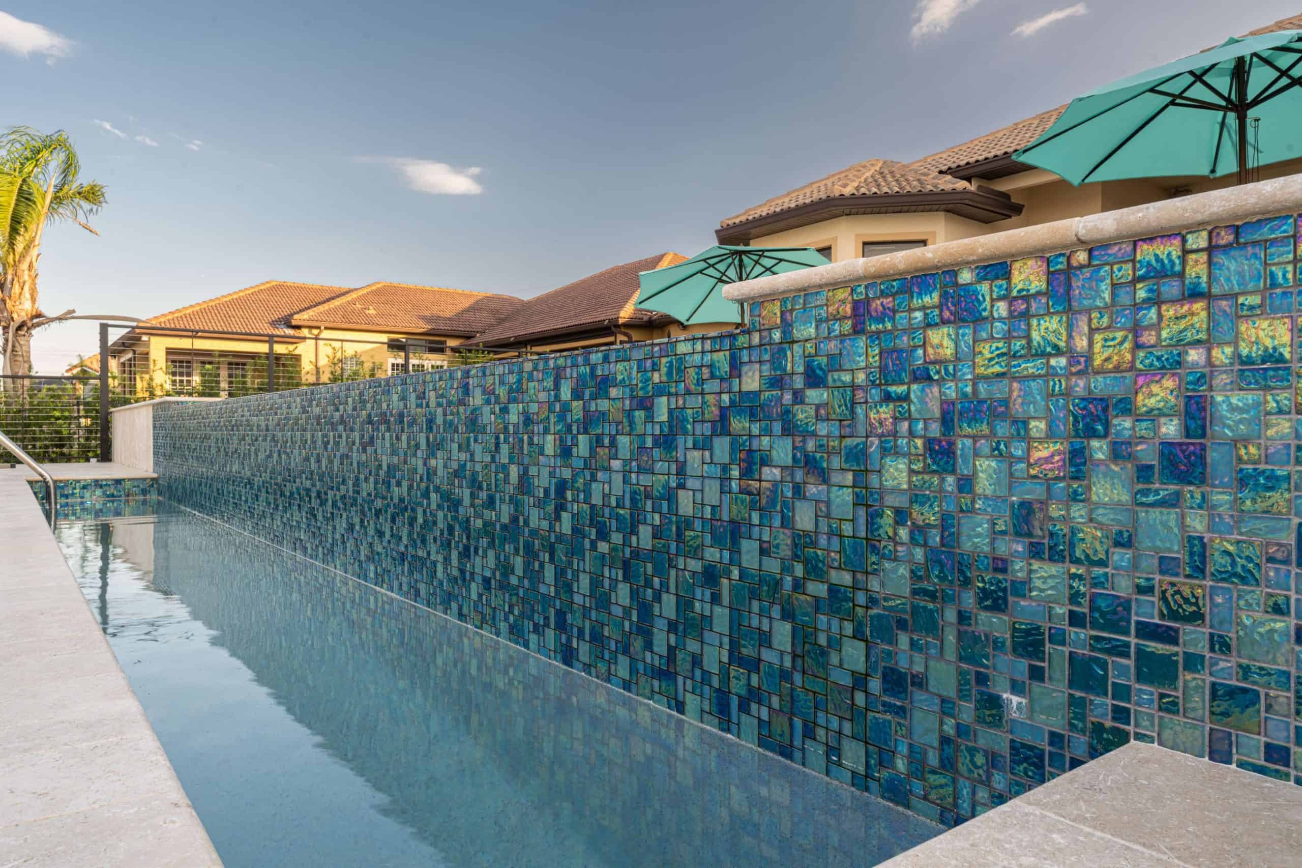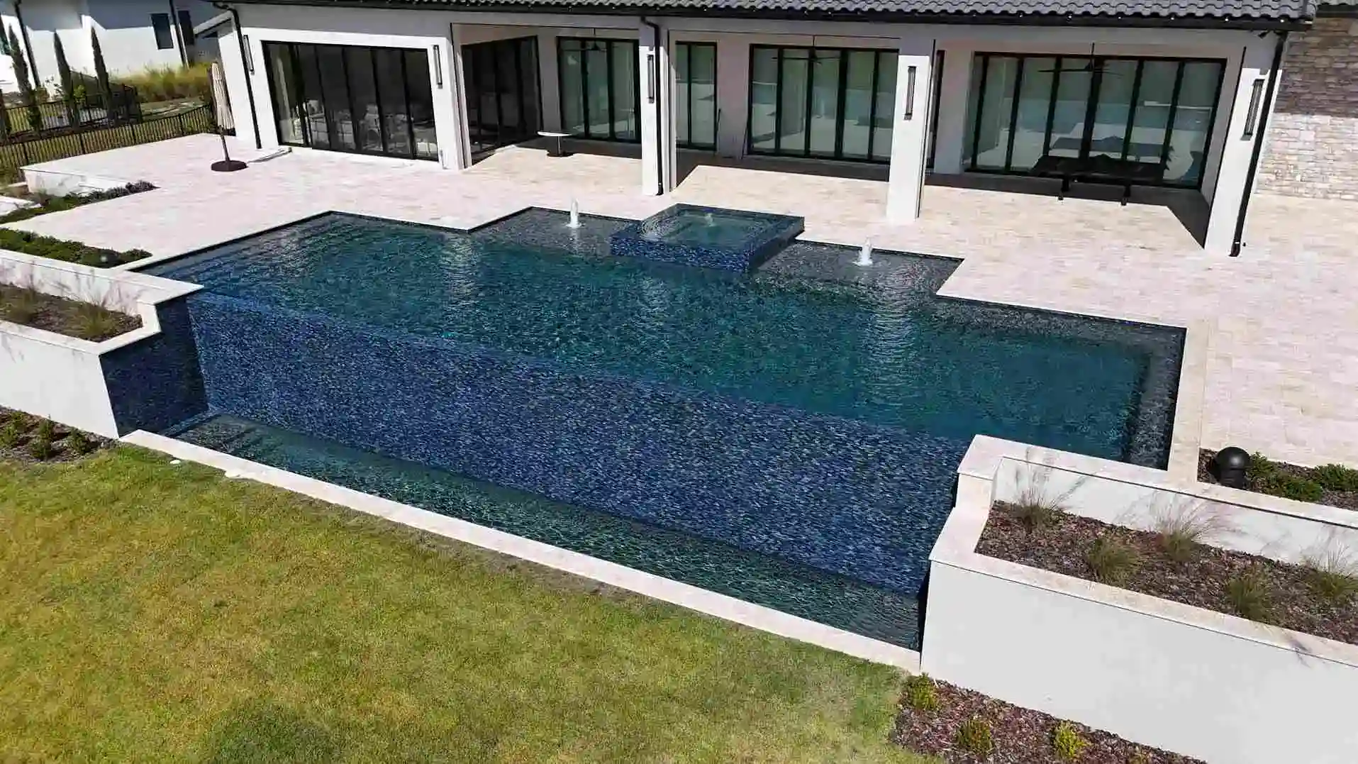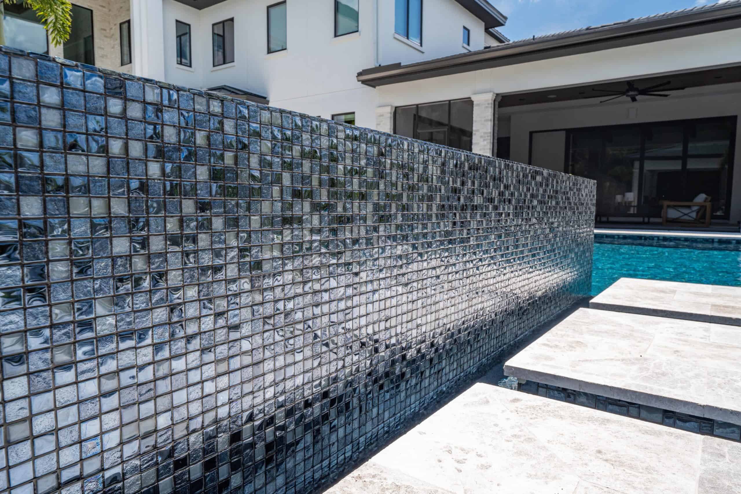Sophisticated infinity-edge pool with deep blue mosaic tile, raised spa, and seamless water wall feature.