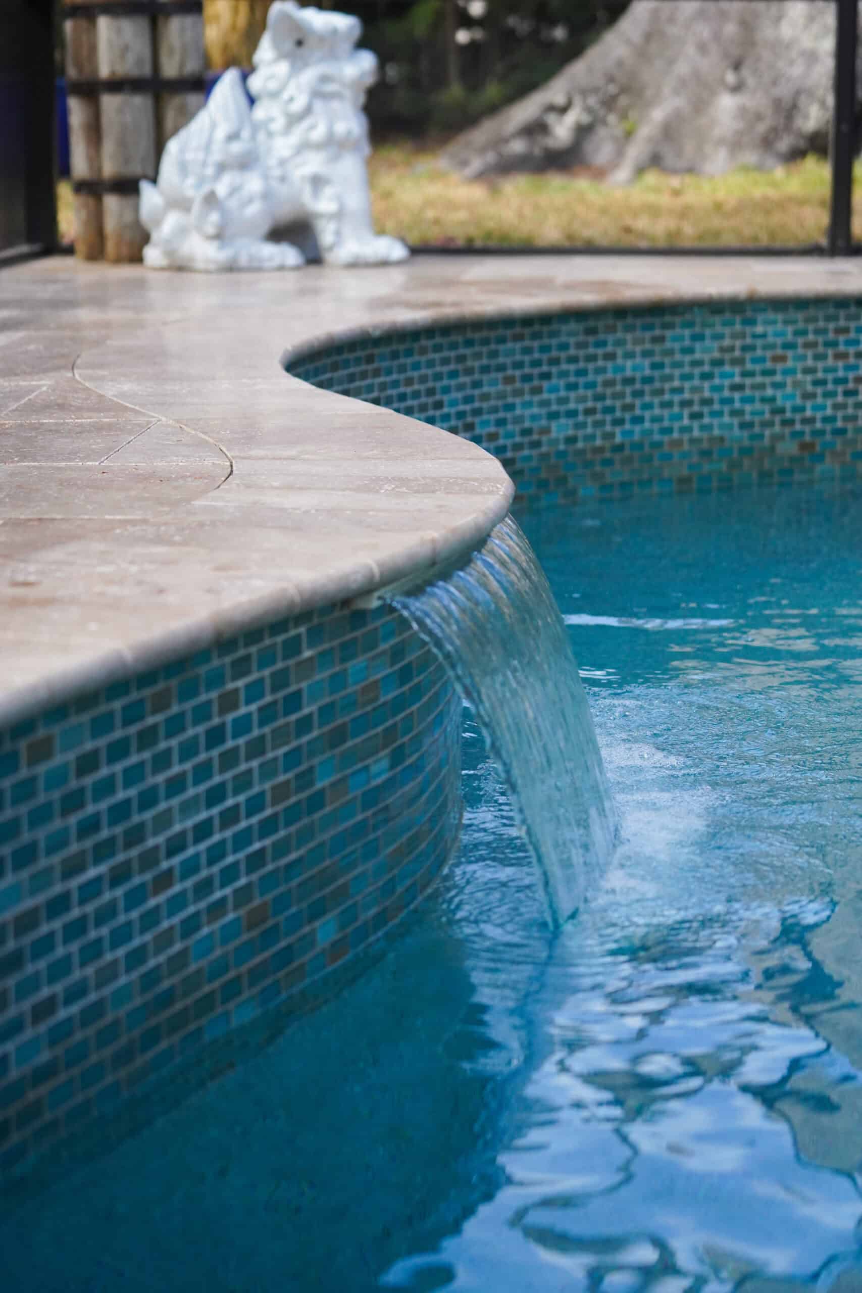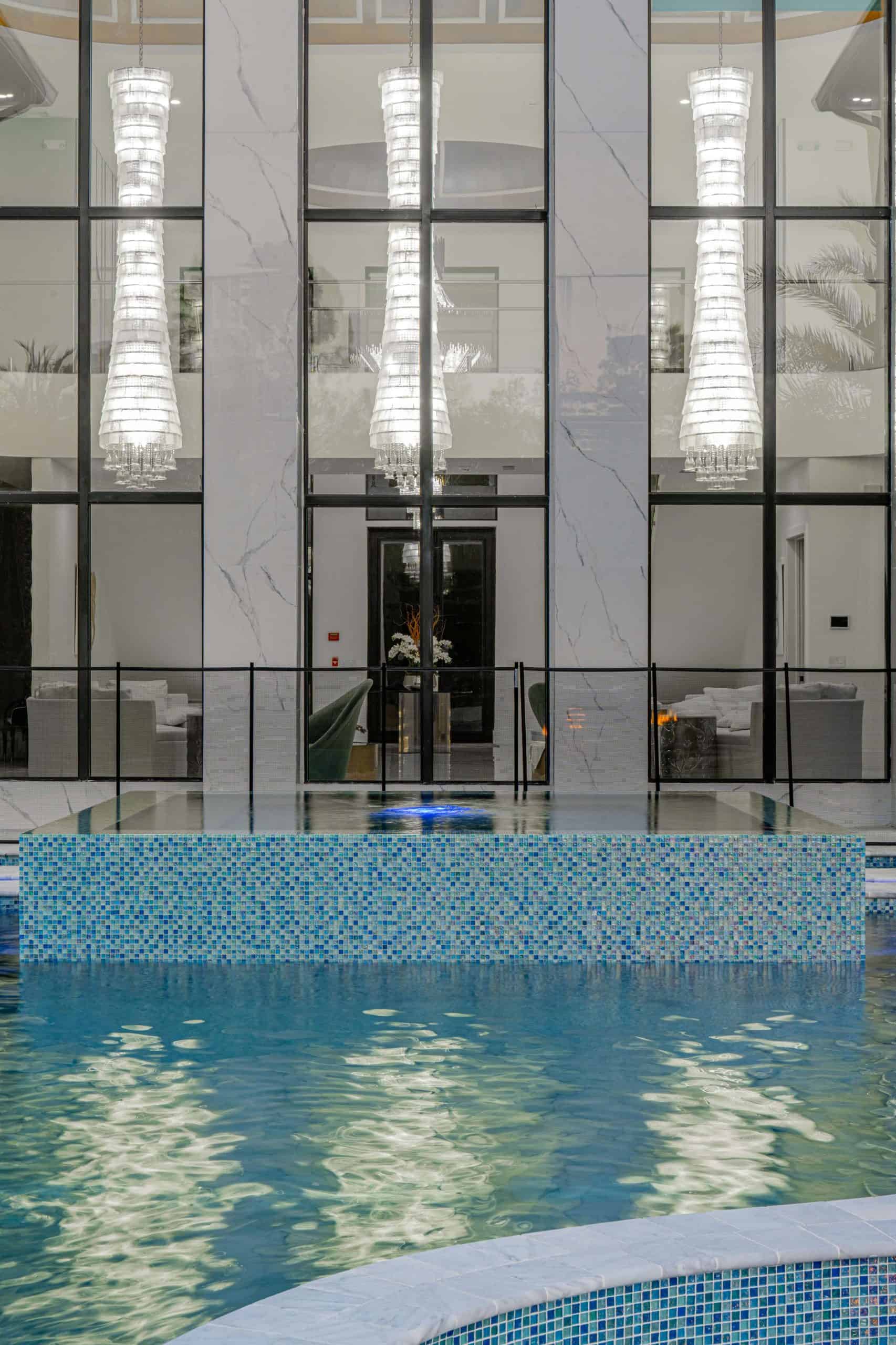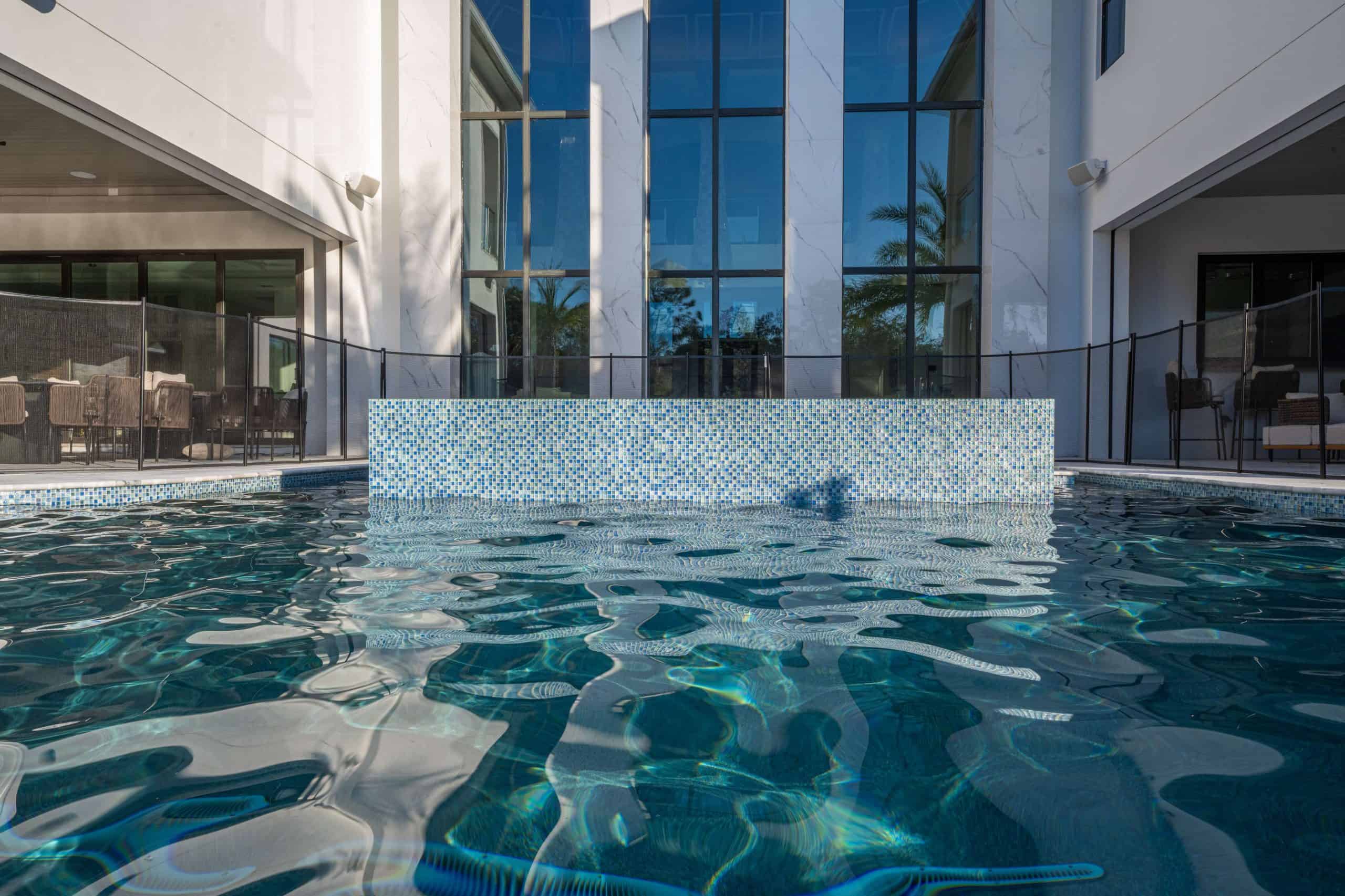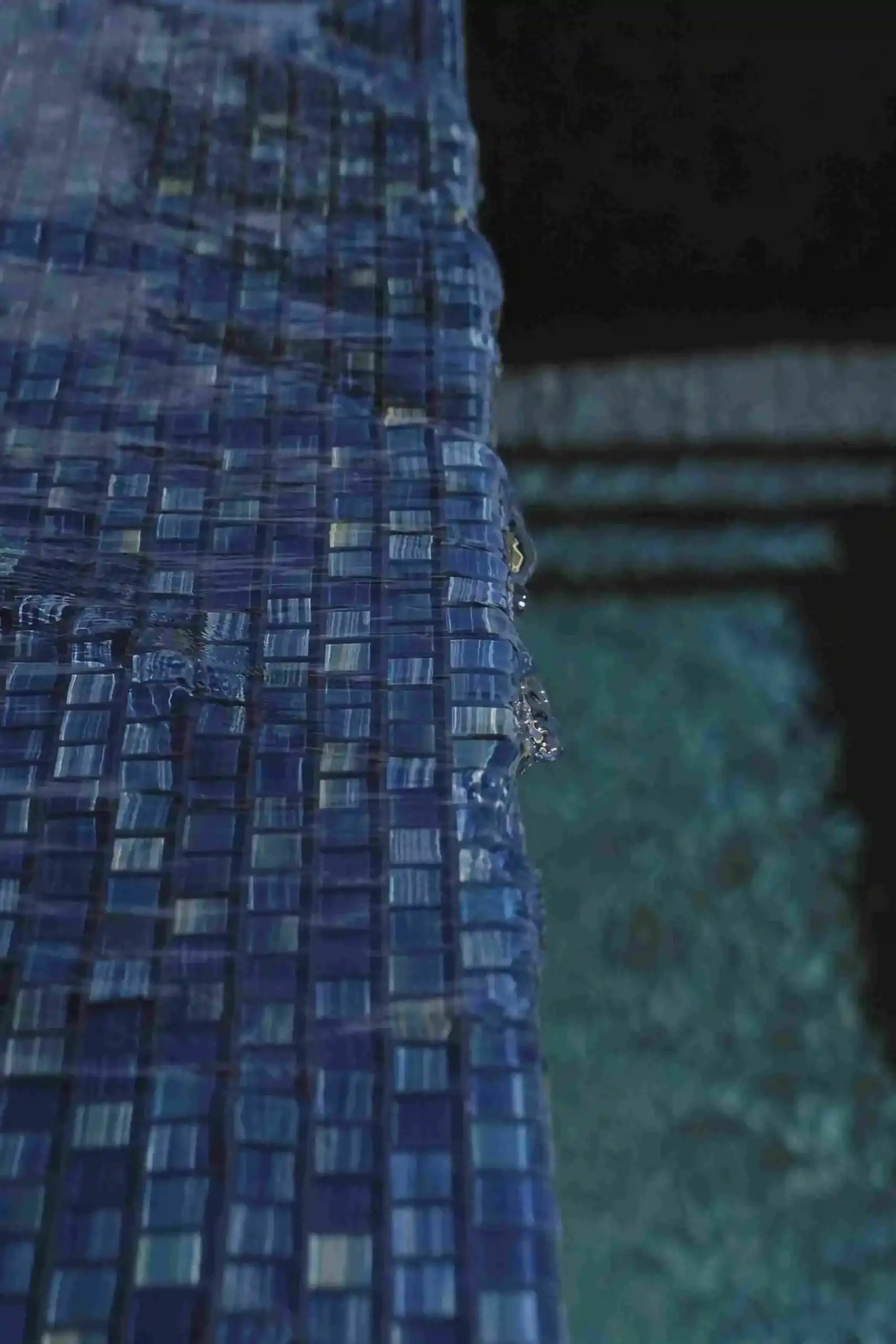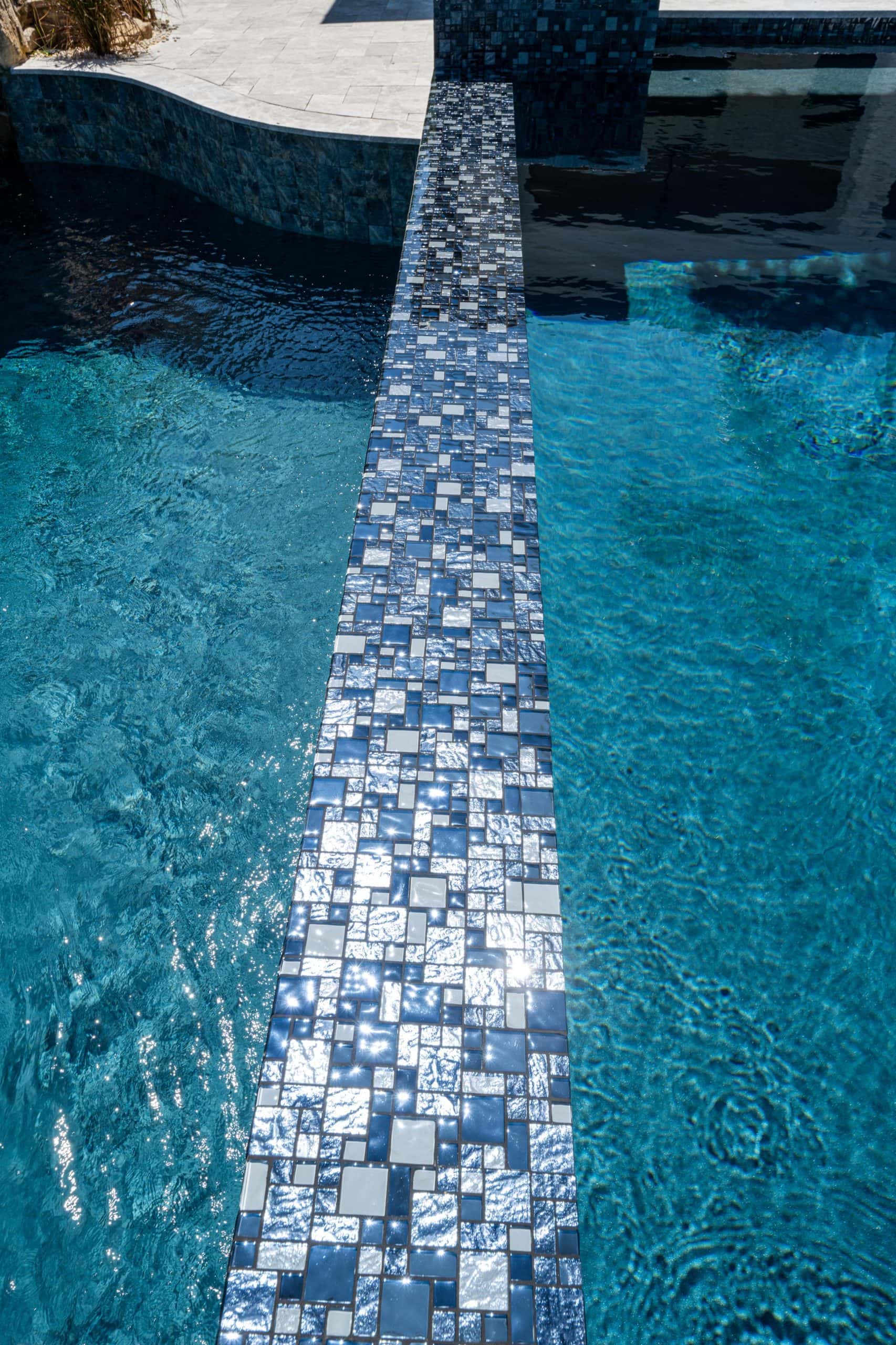 Sophisticated infinity-edge pool with deep blue mosaic tile, raised spa, and seamless water wall feature.
