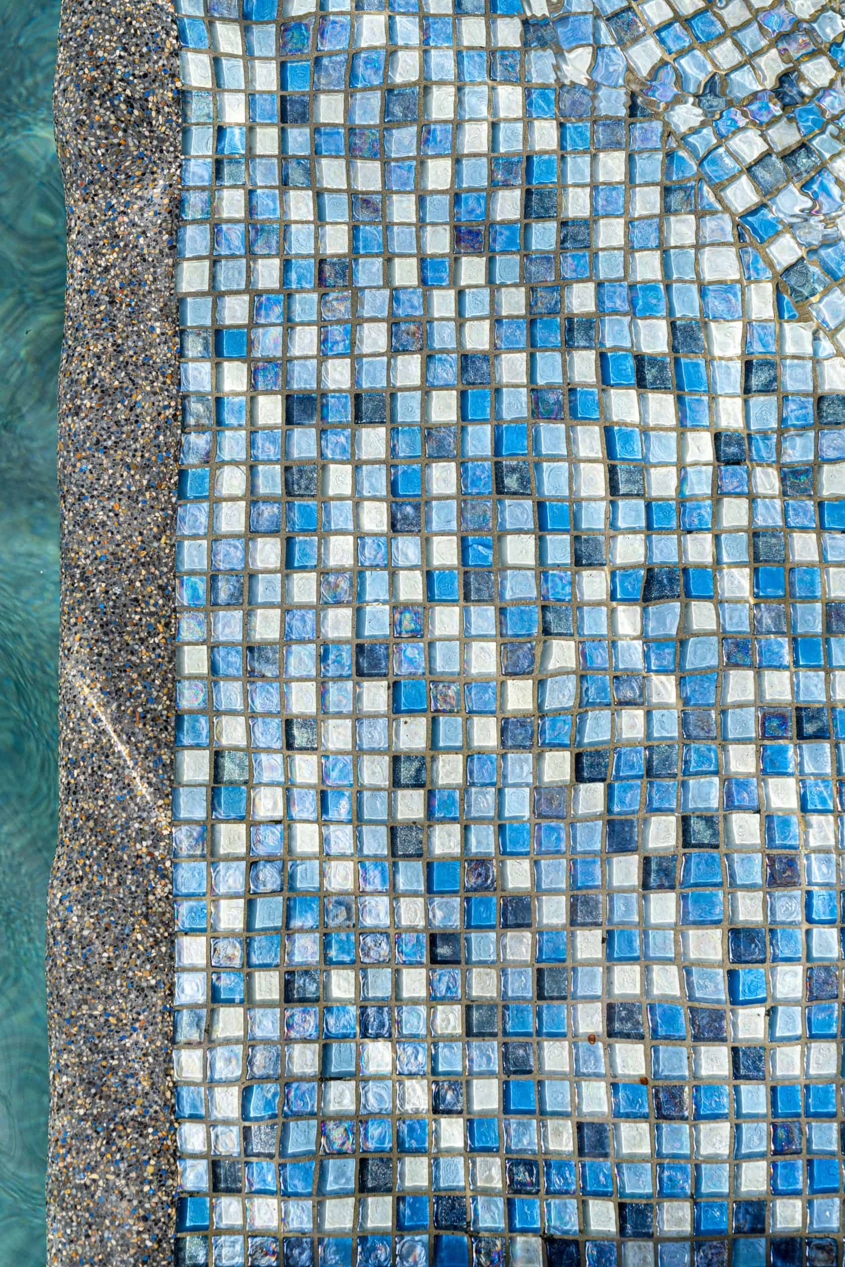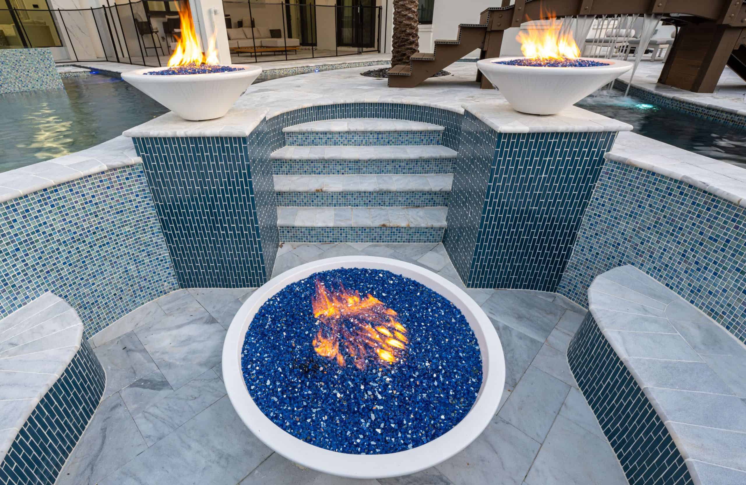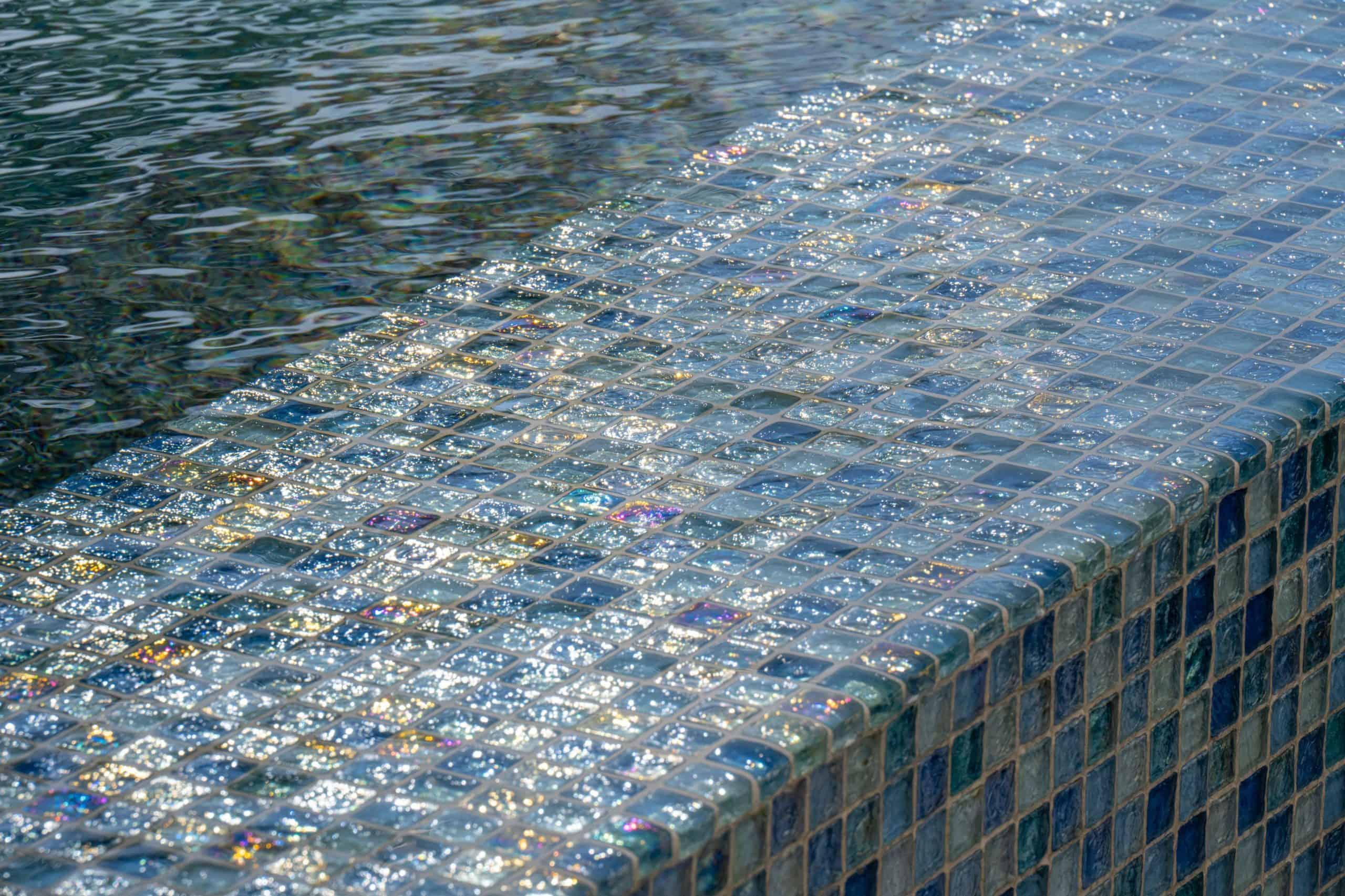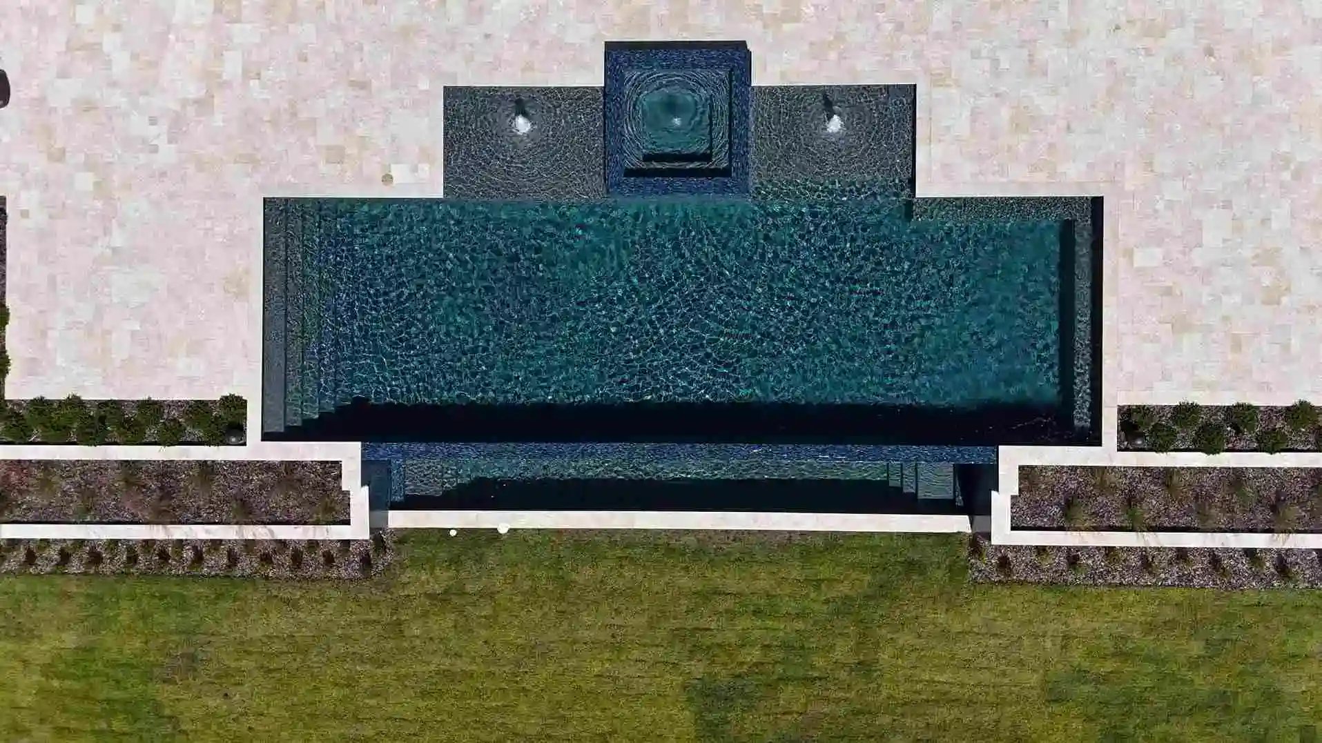 Sophisticated infinity-edge pool with deep blue mosaic tile, raised spa, and seamless water wall feature.