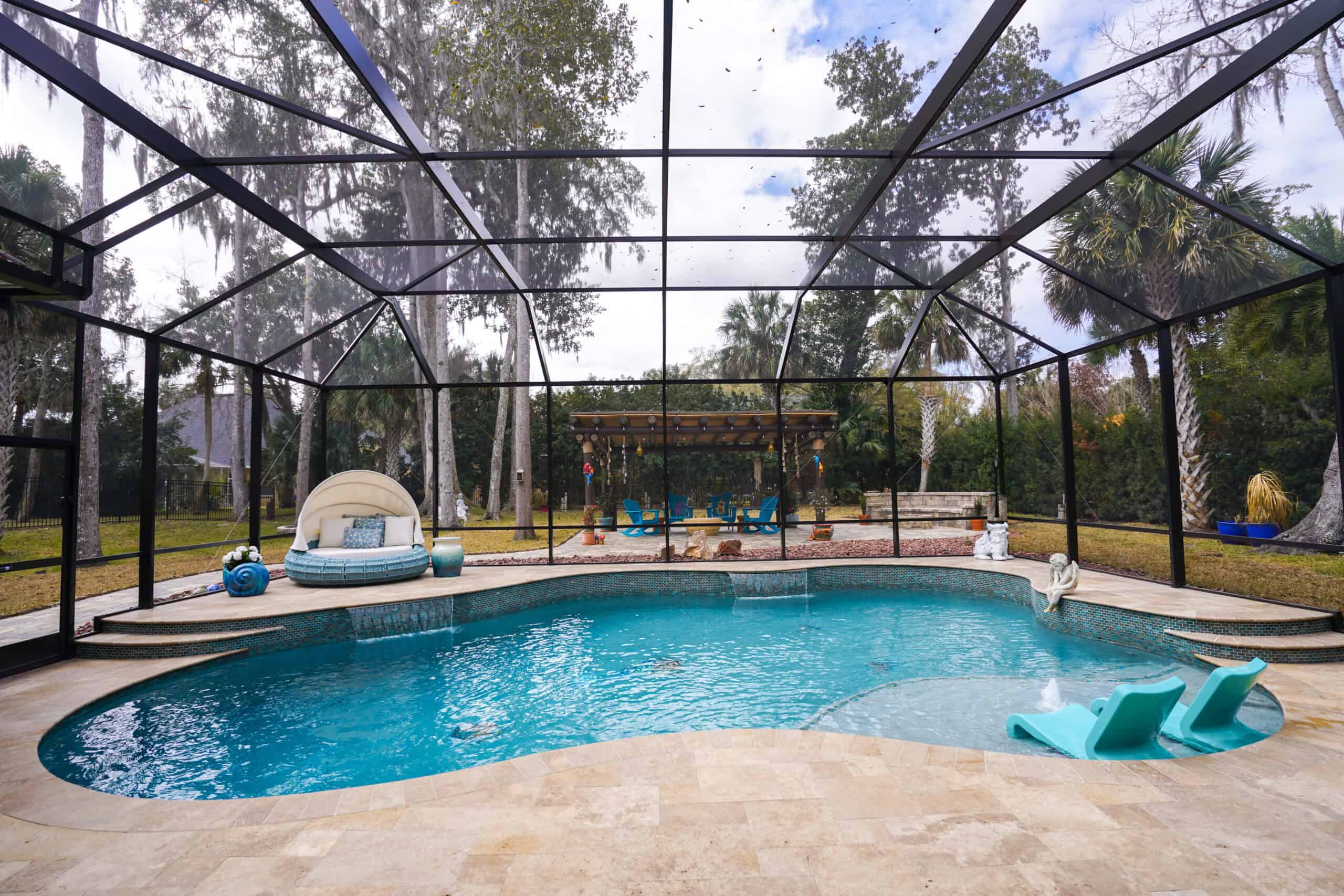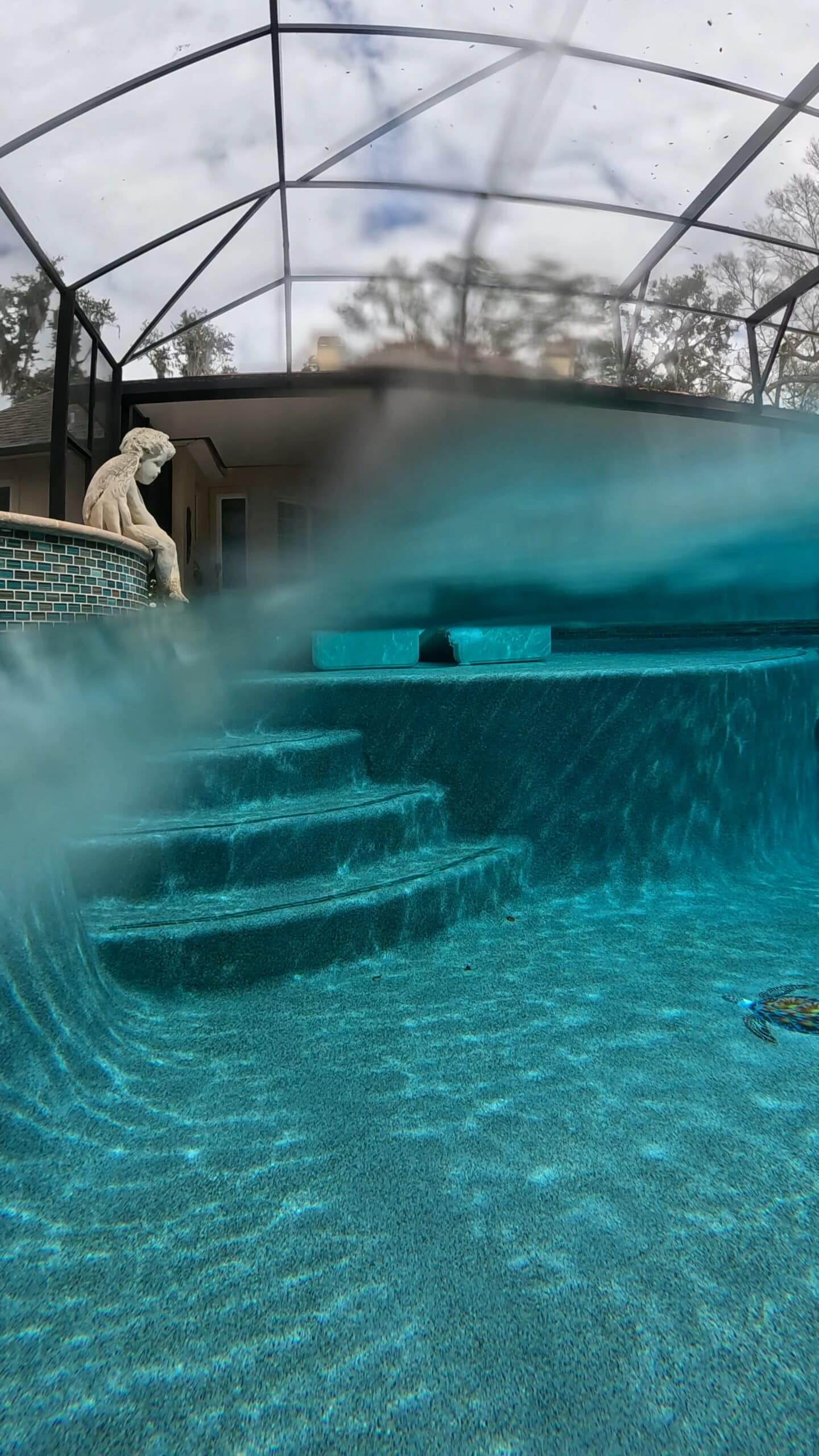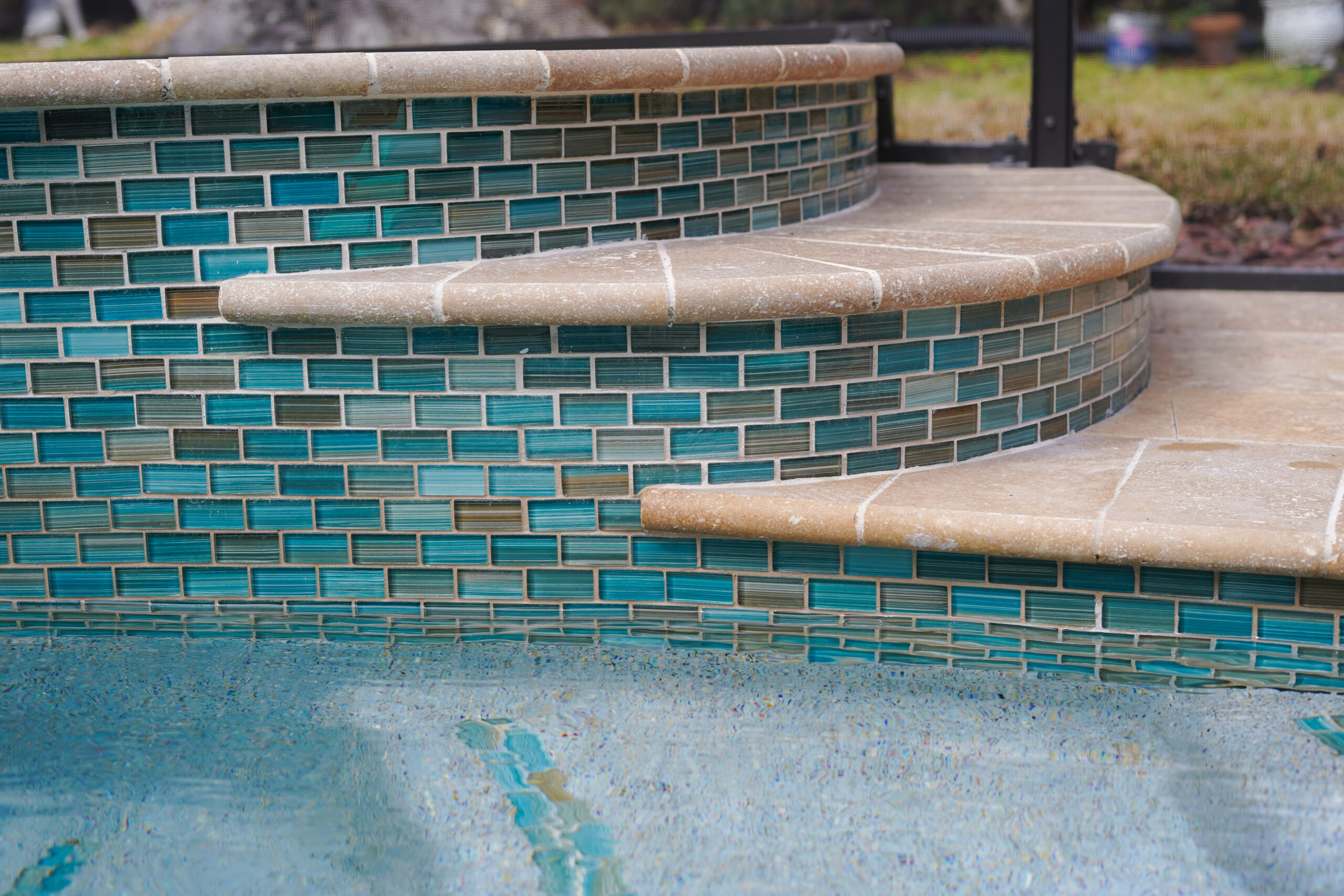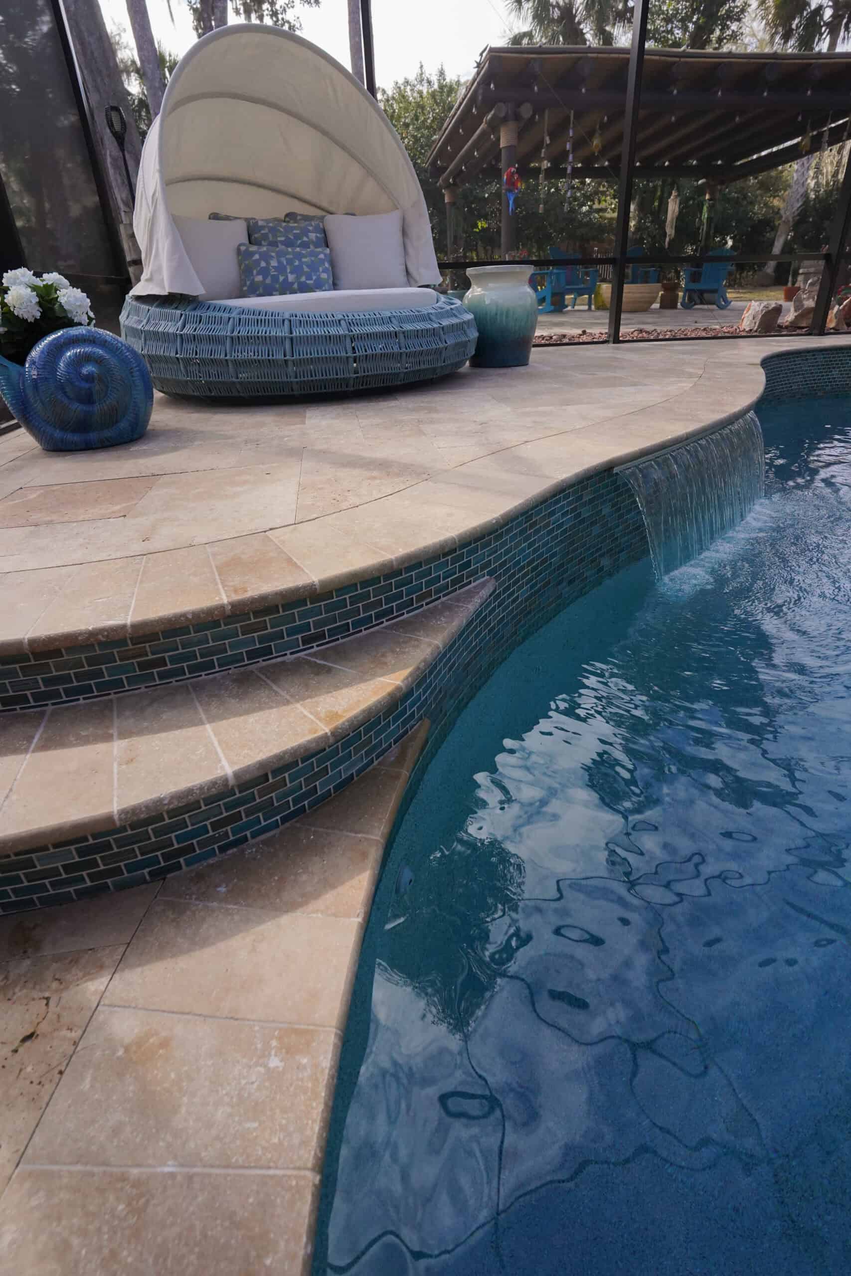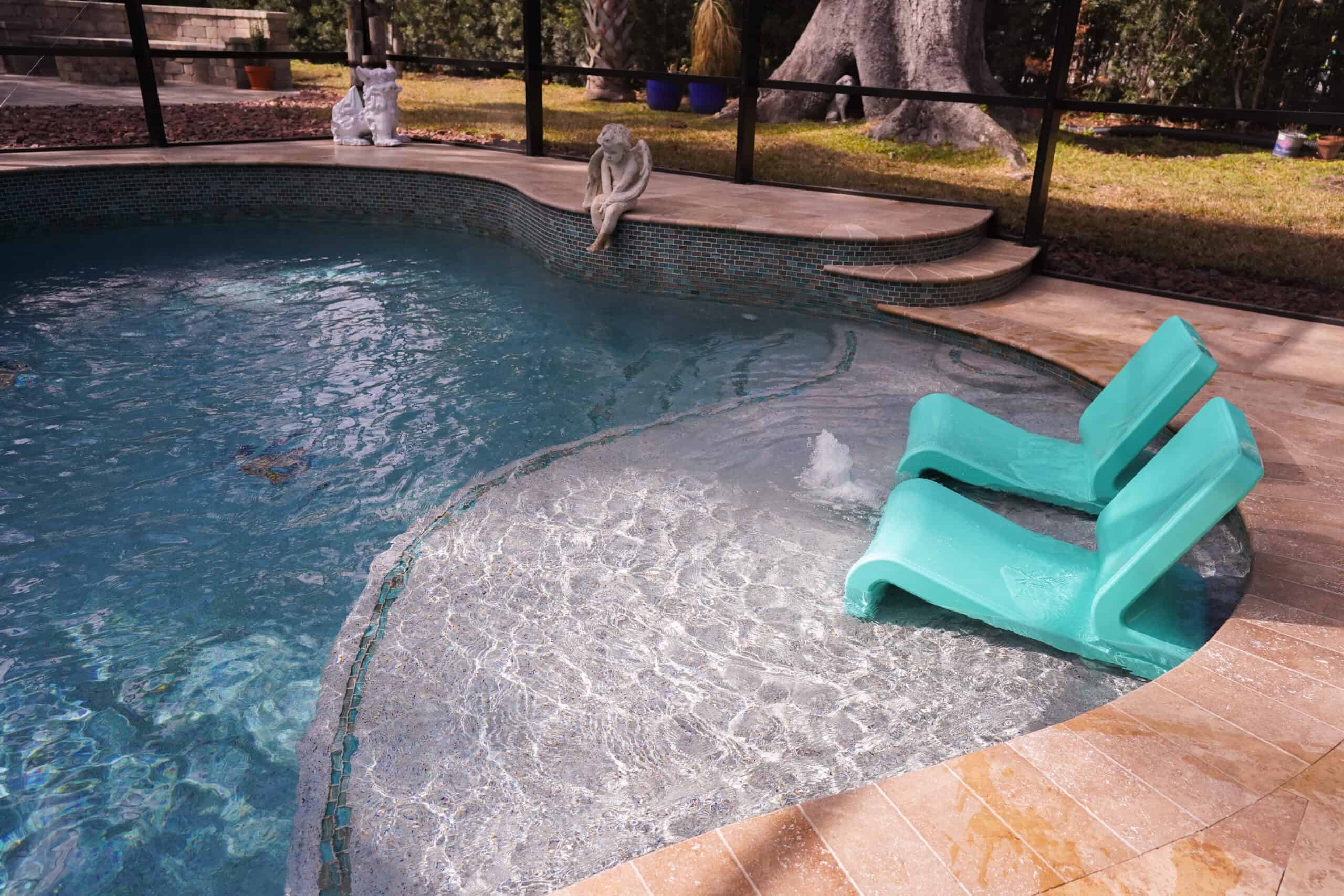 Custom luxury pool featuring a baja shelf with in-water loungers, glass tile accents, curved steps, and a cascading water feature, all enclosed within a screened lanai for a relaxing resort-style backyard.